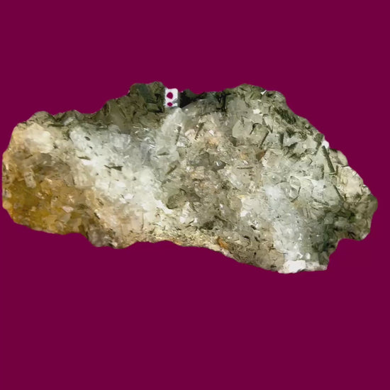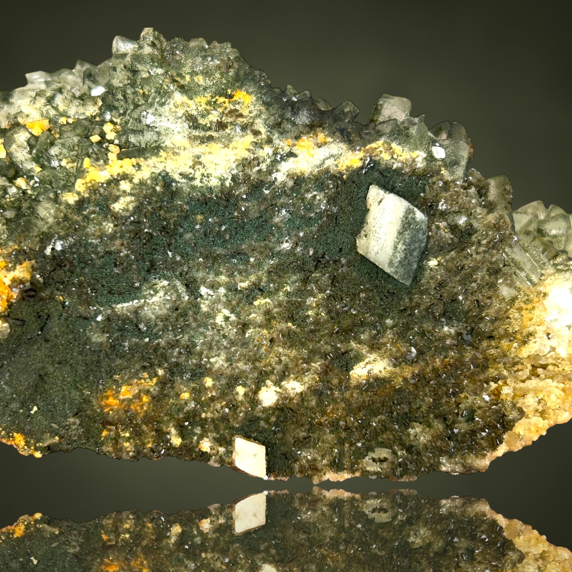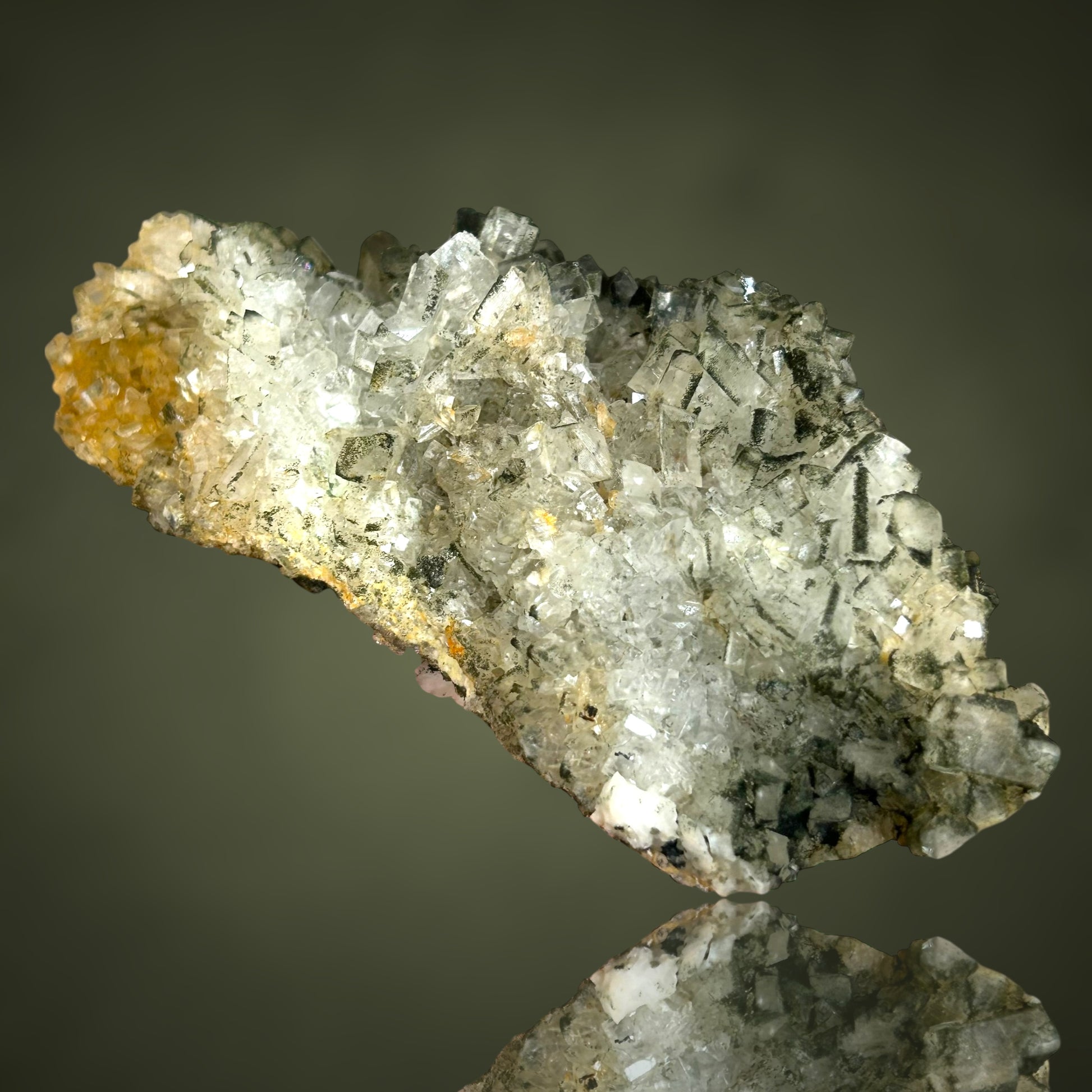 Many of the crystals show a distinct chlorite coating on one side, creating an attractive contrast to the pristine, glassy faces.