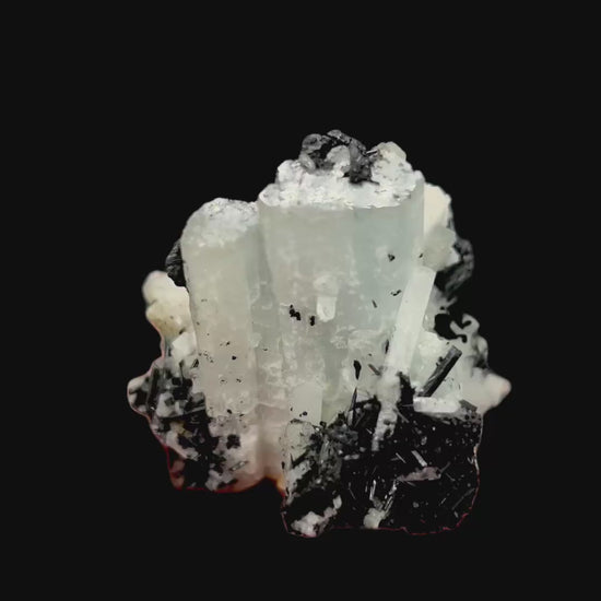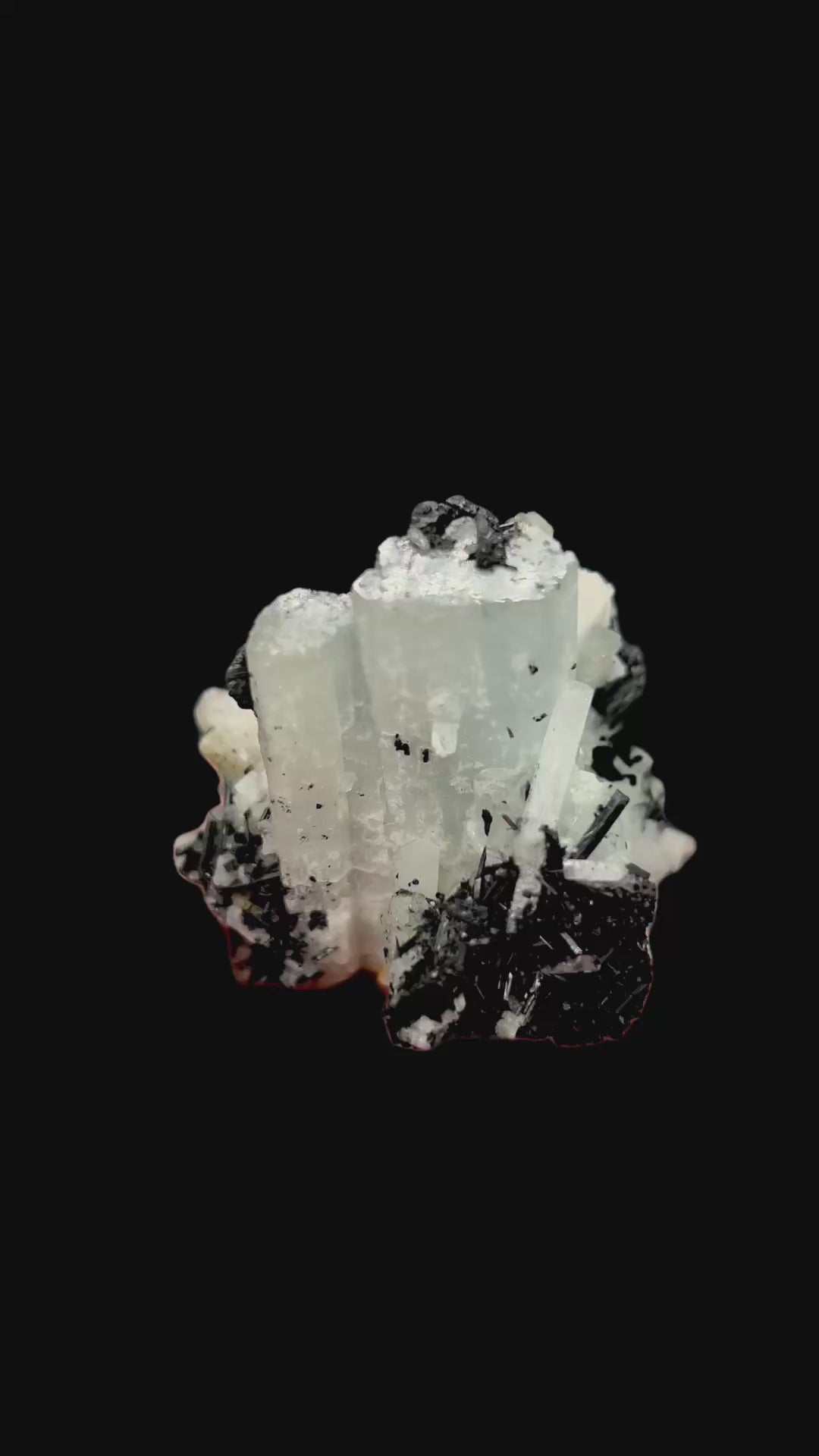 🇬🇧 Finger-length and thick, rather pale, but undamaged aquamarine crystals with high-luster, intact terminal faces. The numerous surrounding Schorl crystals add beautiful highlights with their structure.