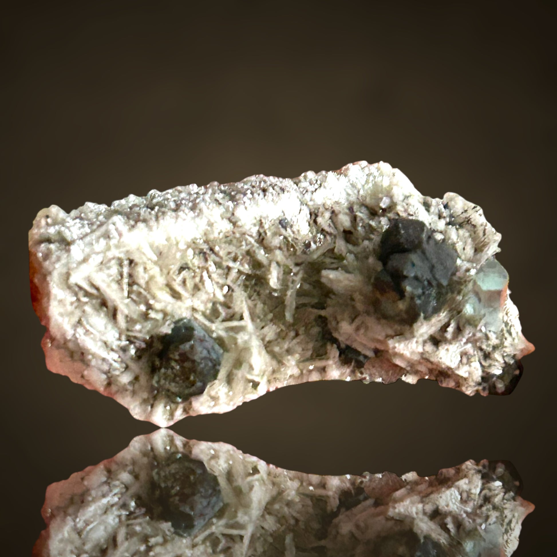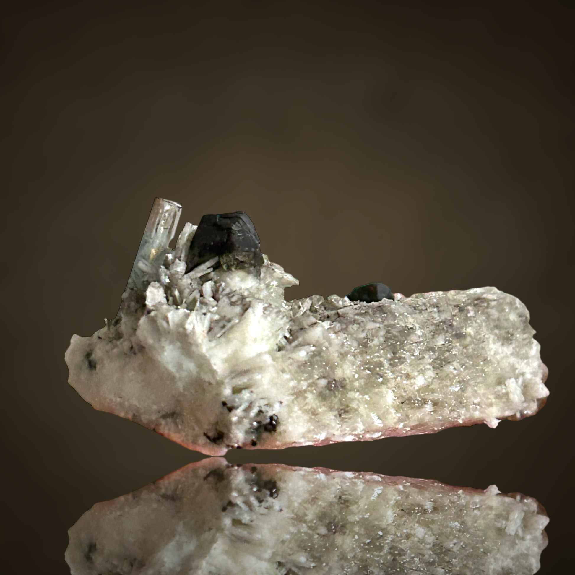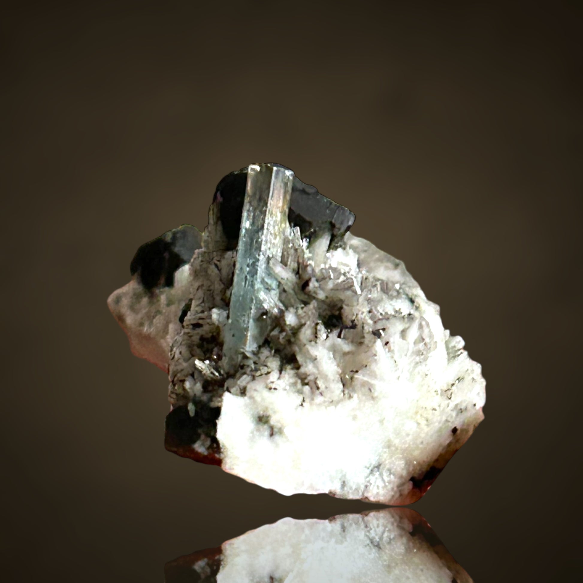 A clear, sharply terminated aquamarine crystal standing proudly on creamy feldspar, displaying unusually refined and intricate surface crystallization along its prism faces. Complementing the piece are superb, well developed phlogopite books…lustrous, layered, and ideally arranged to enhance the aquamarine’s presence without competing with it.