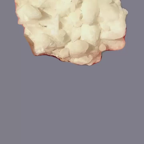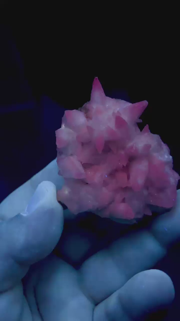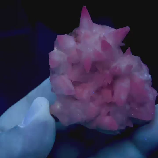 What makes this piece particularly distinctive is the presence of fluorescent components running through the calcite. Under UV light, these inclusions create localized zones of coloration within the crystals, while the terminations display a noticeably stronger reaction and glow with impressive intensity. The effect is both unusual and visually striking, adding a dynamic character that is only fully revealed under ultraviolet illumination.