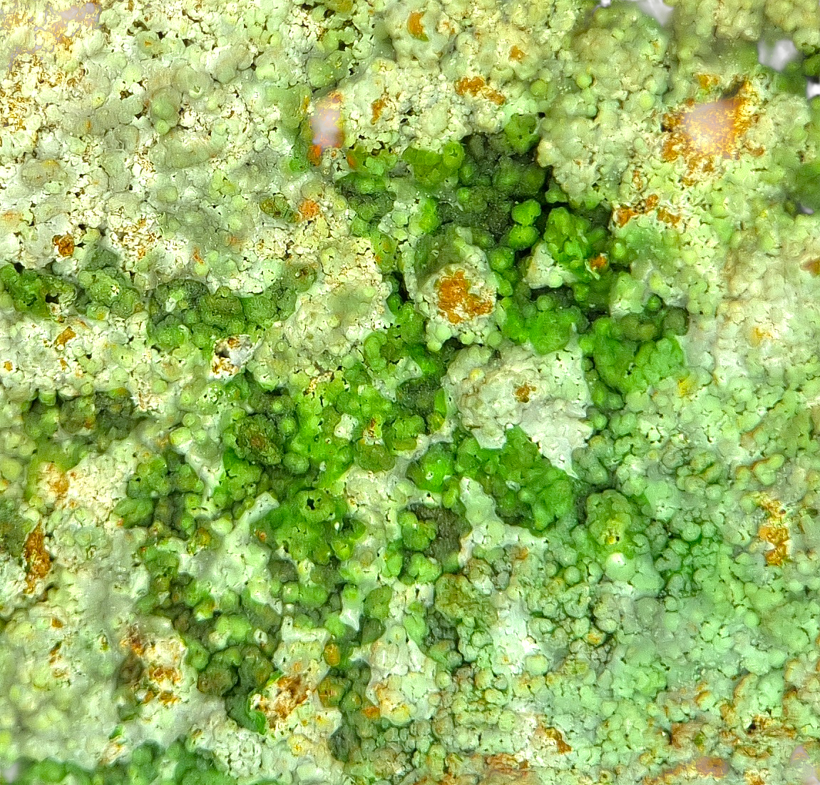 Beautiful apple-green botryoidal conichalcite on contrasting chocolate-brown iron gossan matrix with colorless transparent and lustrous calcite scalenohedrons from the Ojuela Mine.