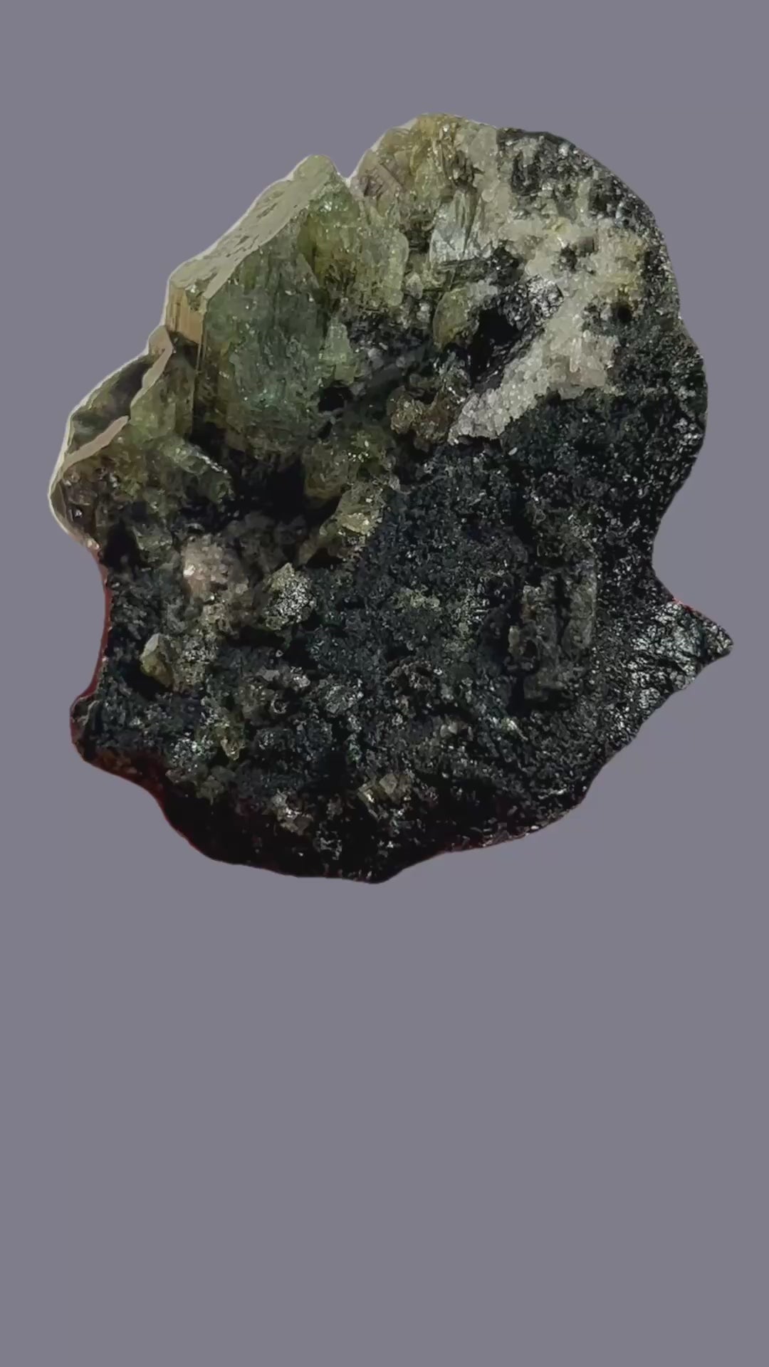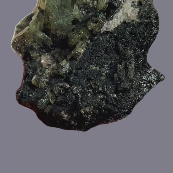 Interesting tourmaline specimen with a base of black-pink darrellhenryite, a slightly pink transitional zone leading into green elbaite at the top. On the reverse side, white tourmaline (achroite) is present.