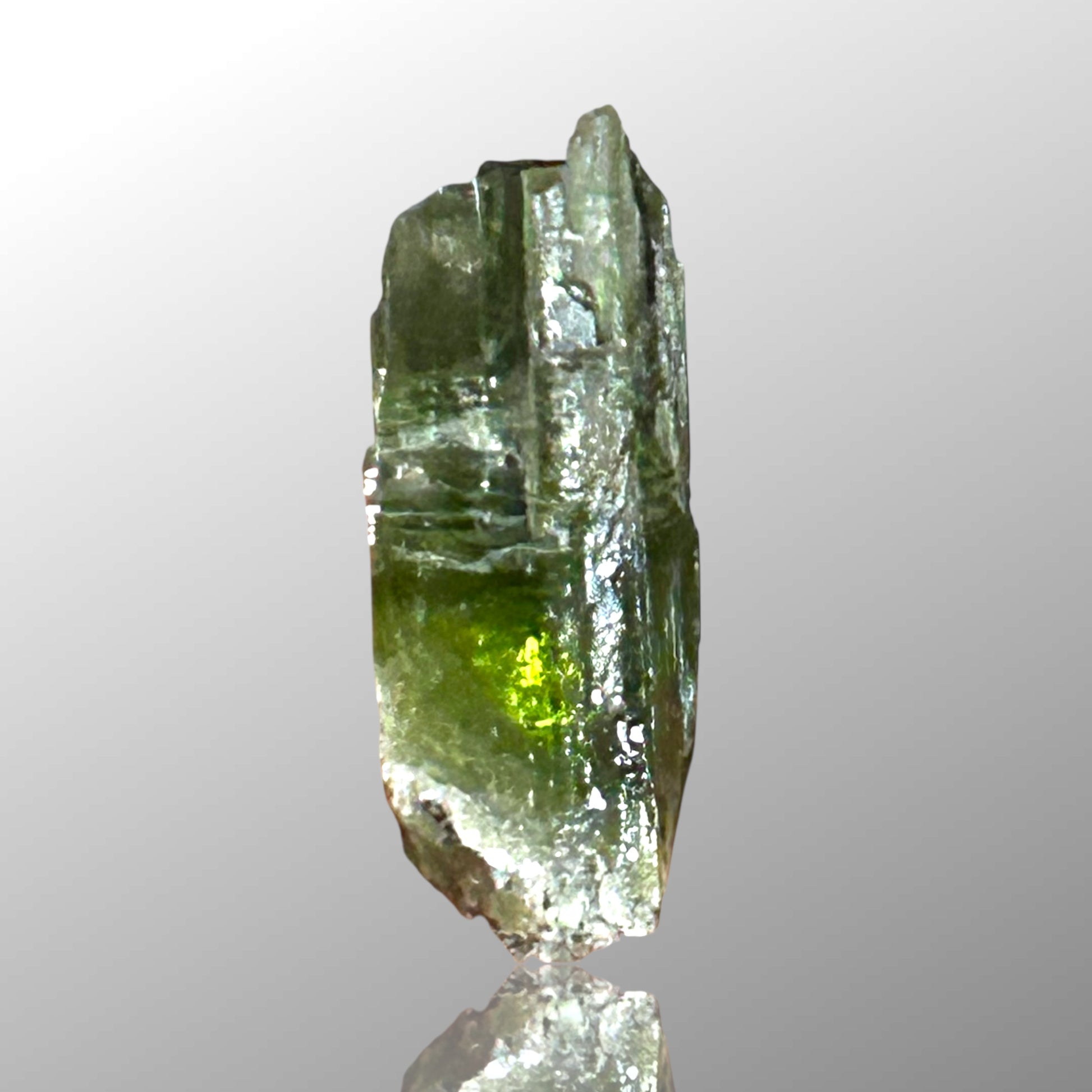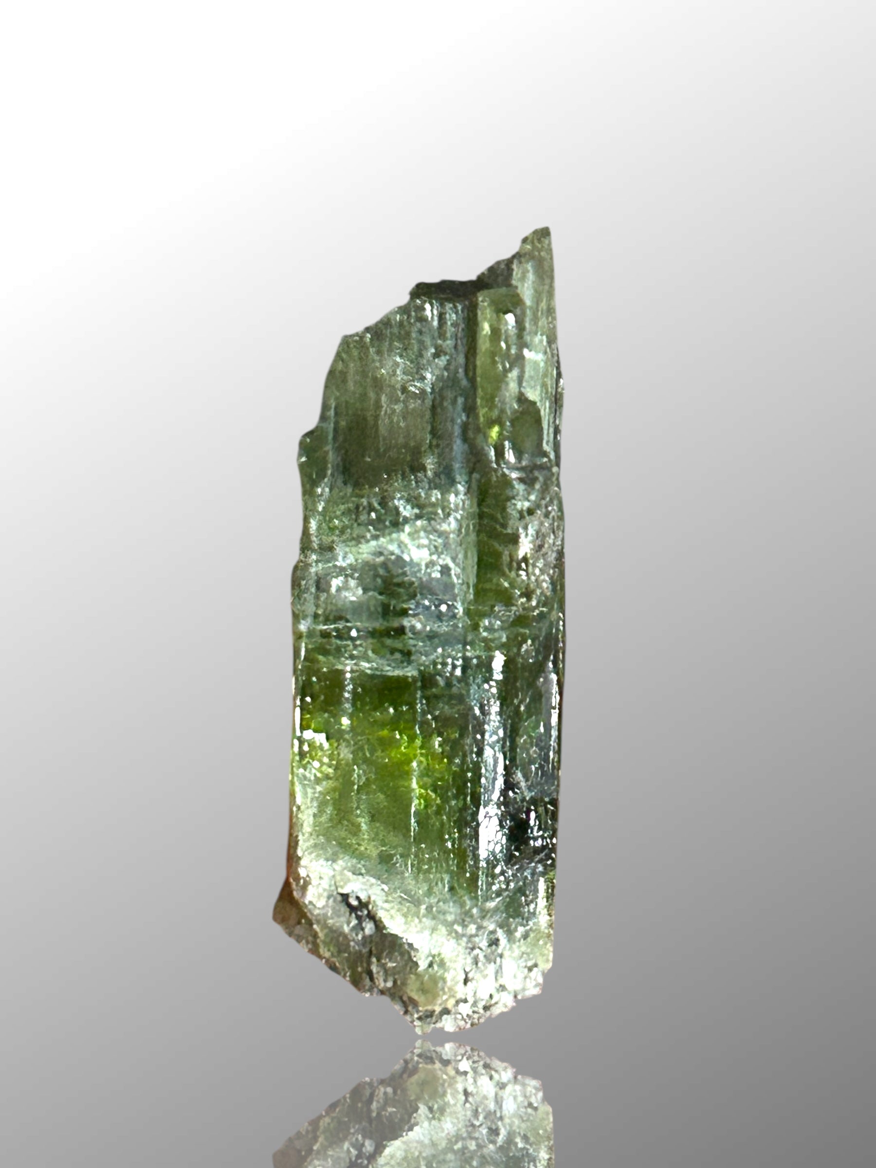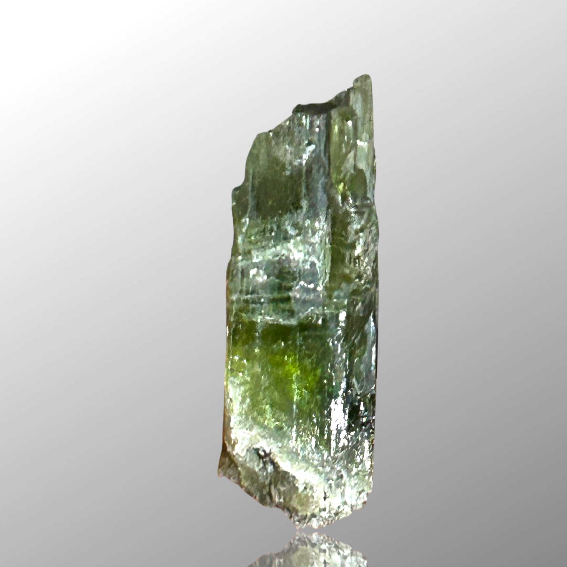 Approximately 5 cm tall diopside crystal from the classic Diopsidrinne at Rotkopf in the Zillertal, Tyrol. The crystal shows well-developed morphology and is largely transparent, making it clearly facetable and suitable for cutting. Specimens of this size and clarity from this historic Alpine locality are distinctly sought after and represent fine examples of Austrian diopside.
