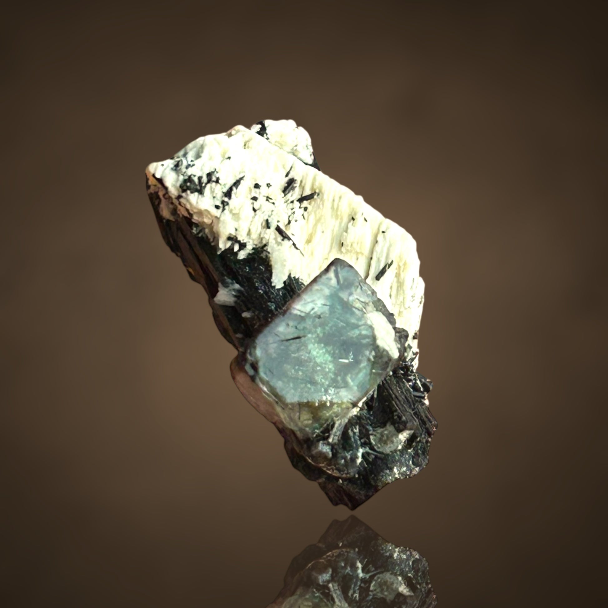 An outstanding fluorite crystal perched on lustrous schorl tourmaline with white feldspar.