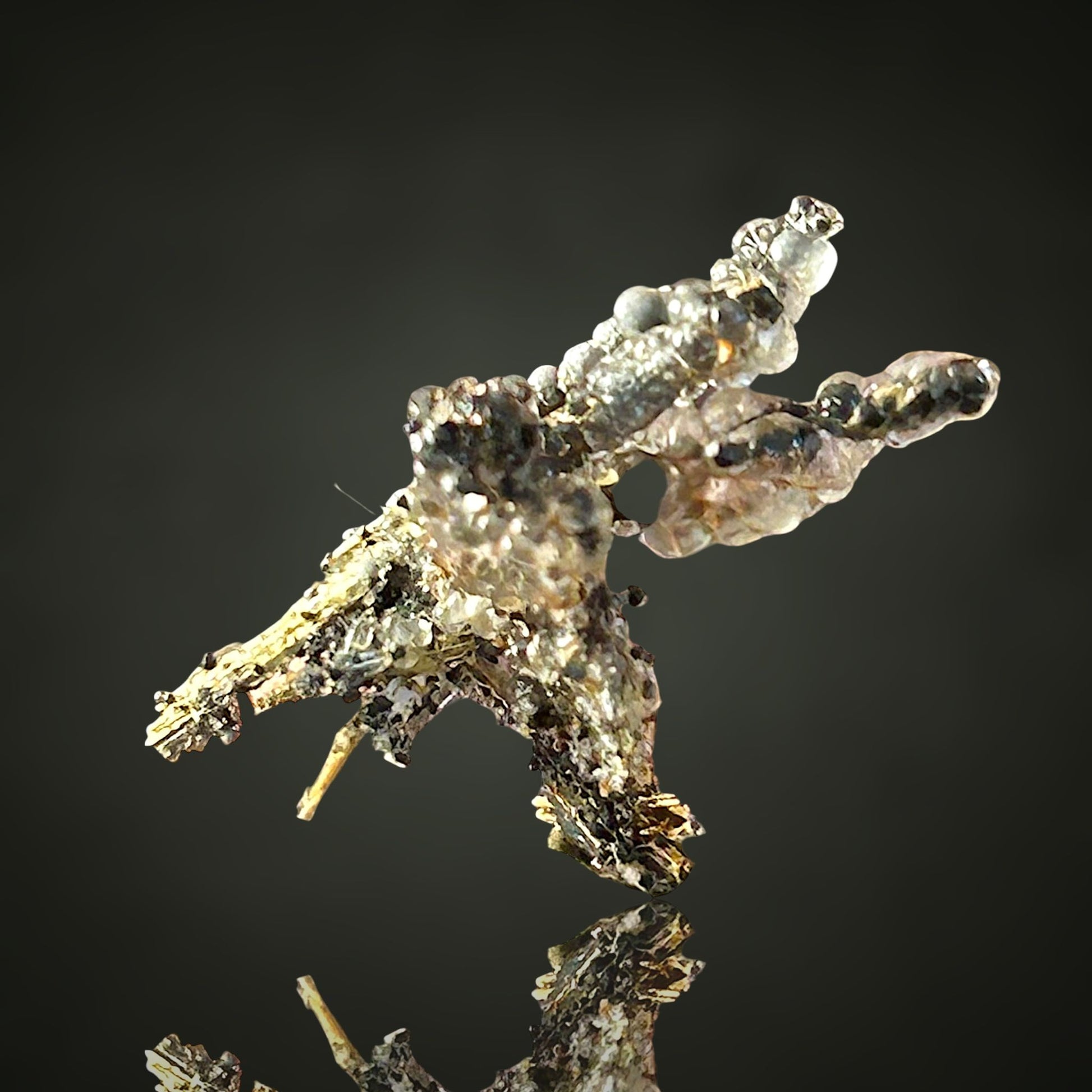 Exciting multi-feature specimen of bubbly Hyalite opal with inclusions of Hematite draped upon golden sprays of Rutile, including a Rutile-Hematite star.