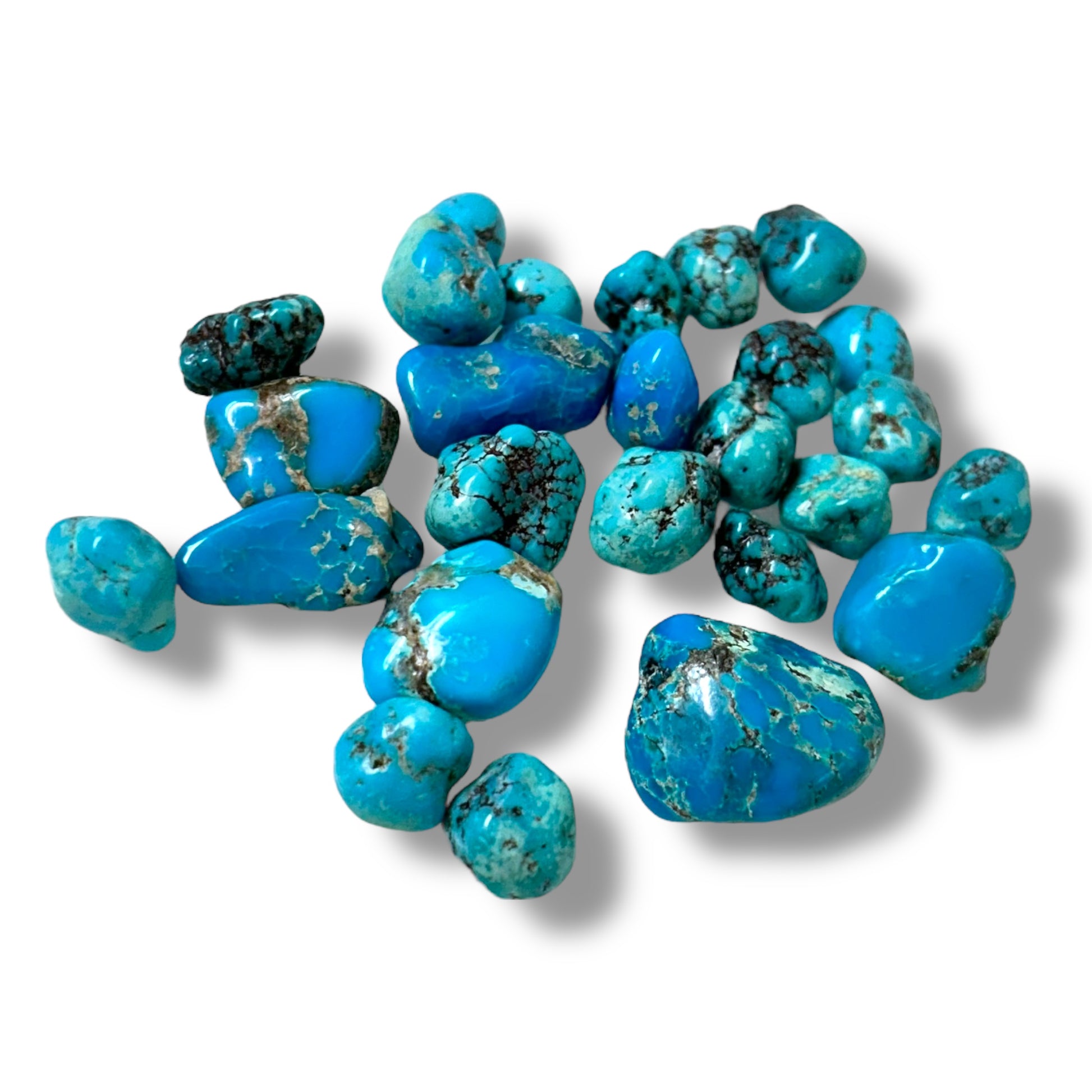 Natural turquoise nuggets from the USA, weighing a total of 83 g and ranging from 1.5 to 3 cm, display a rich palette of blue to green shades — each piece a fragment of American mineral history.