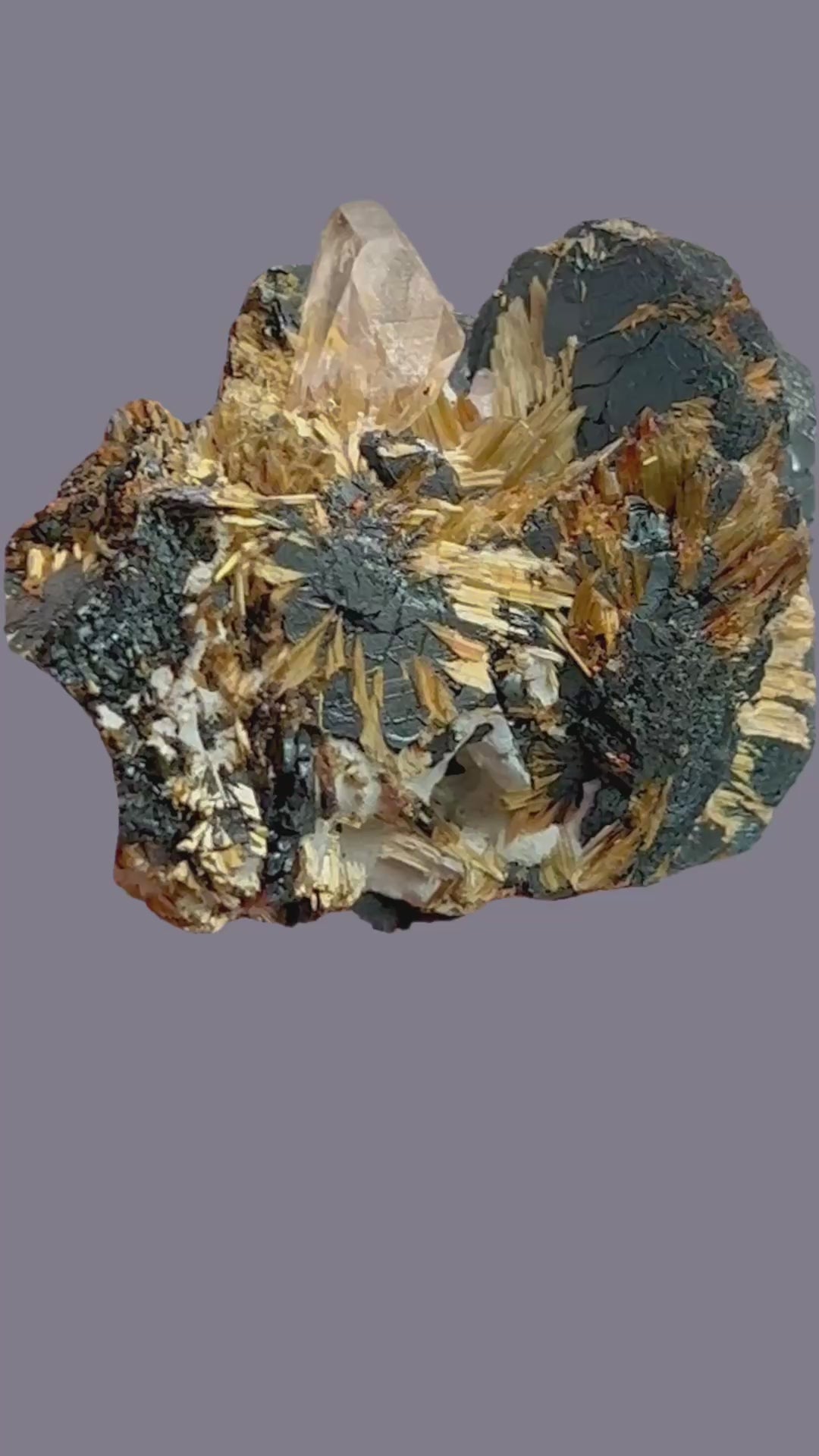 Several magnificent and perfectly preserved hematite–rutile stars have combined into a true “galaxy,” accompanied by a clear quartz crystal in which the golden rutile continues to grow as if by magic. Absolutely breathtaking.