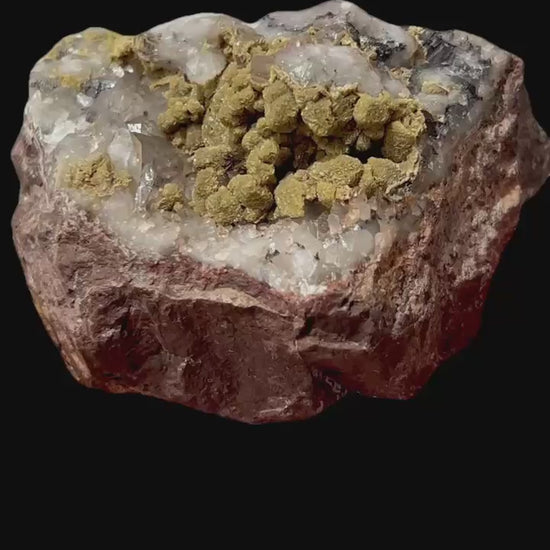 Pretty yellow siderite crystals coating quartz crystals in a vug in andesite matrix.