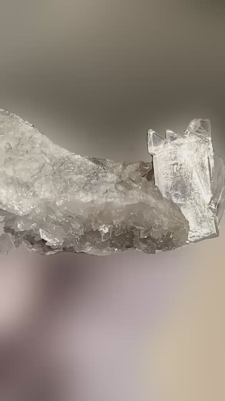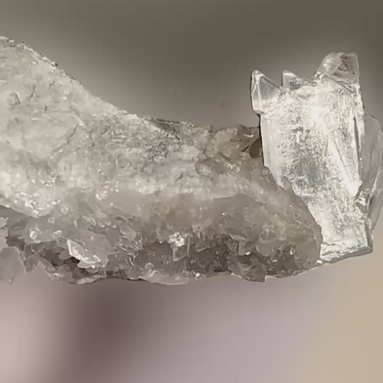 This stunning specimen impresses with an extraordinary gypsum swallowtail twin on contrasting anhydrite matrix. Its special feature are water-clear strontioginorite crystals, a rare borate mineral found in only a few locations worldwide. The Kohnstein quarry is considered the most important site for this particular paragenesis. Since the site now yields hardly any new material of this quality, this specimen is a valuable piece of documentation.