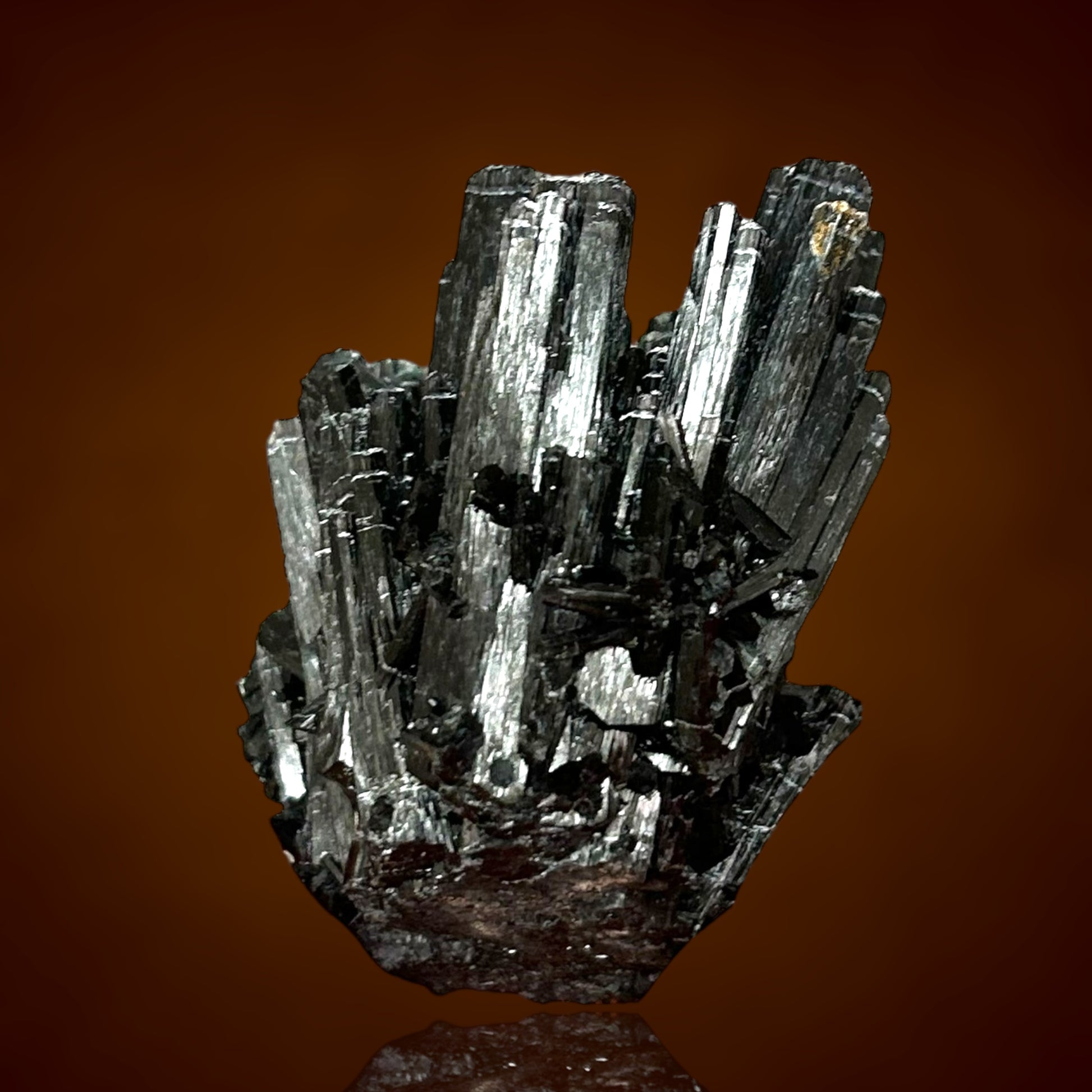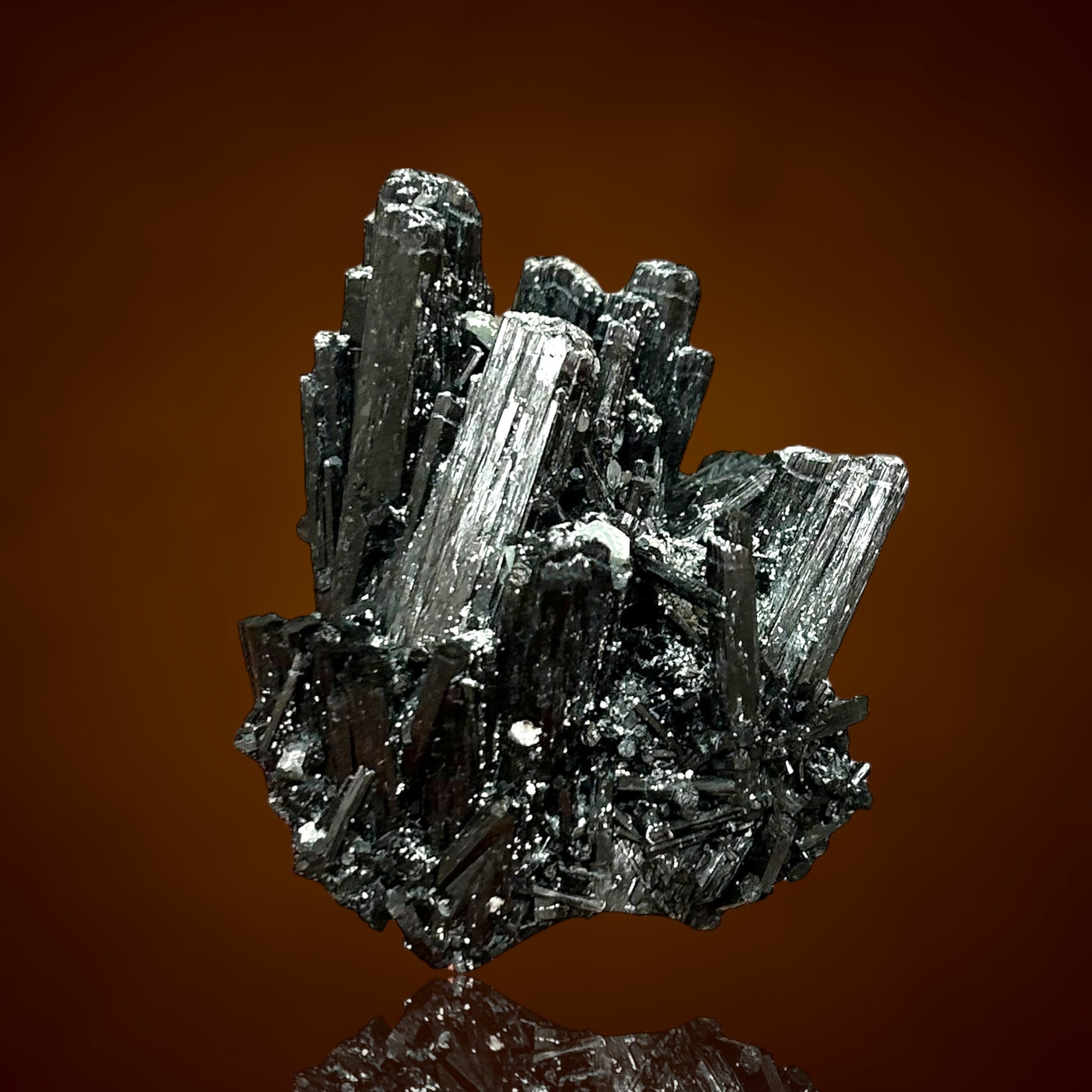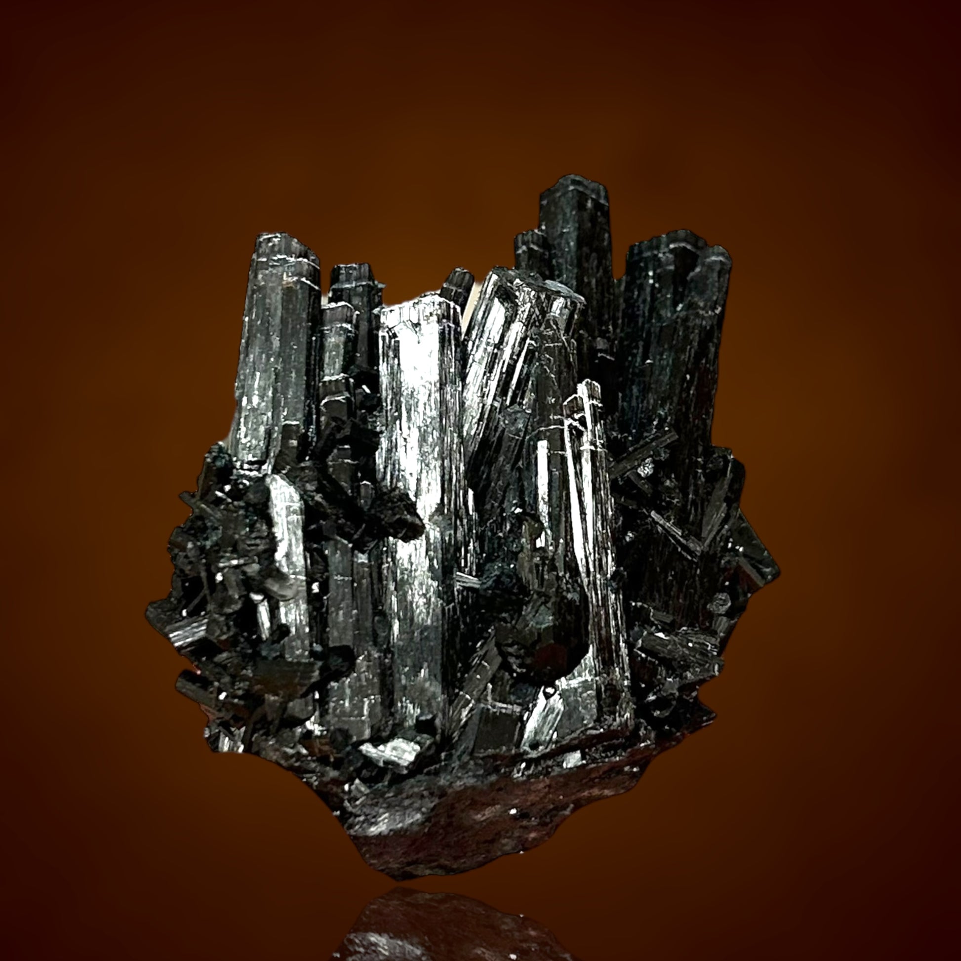 Highly lustrous tourmalines with a reddish-brown sheen form a stunning, bouquet-like cluster. Every aspect of these crystals evokes the appearance of fine Tanzanian dravites — we are currently analyzing them.
