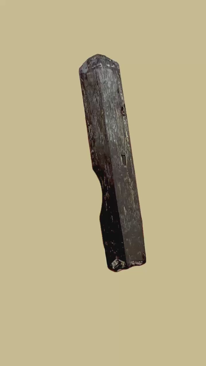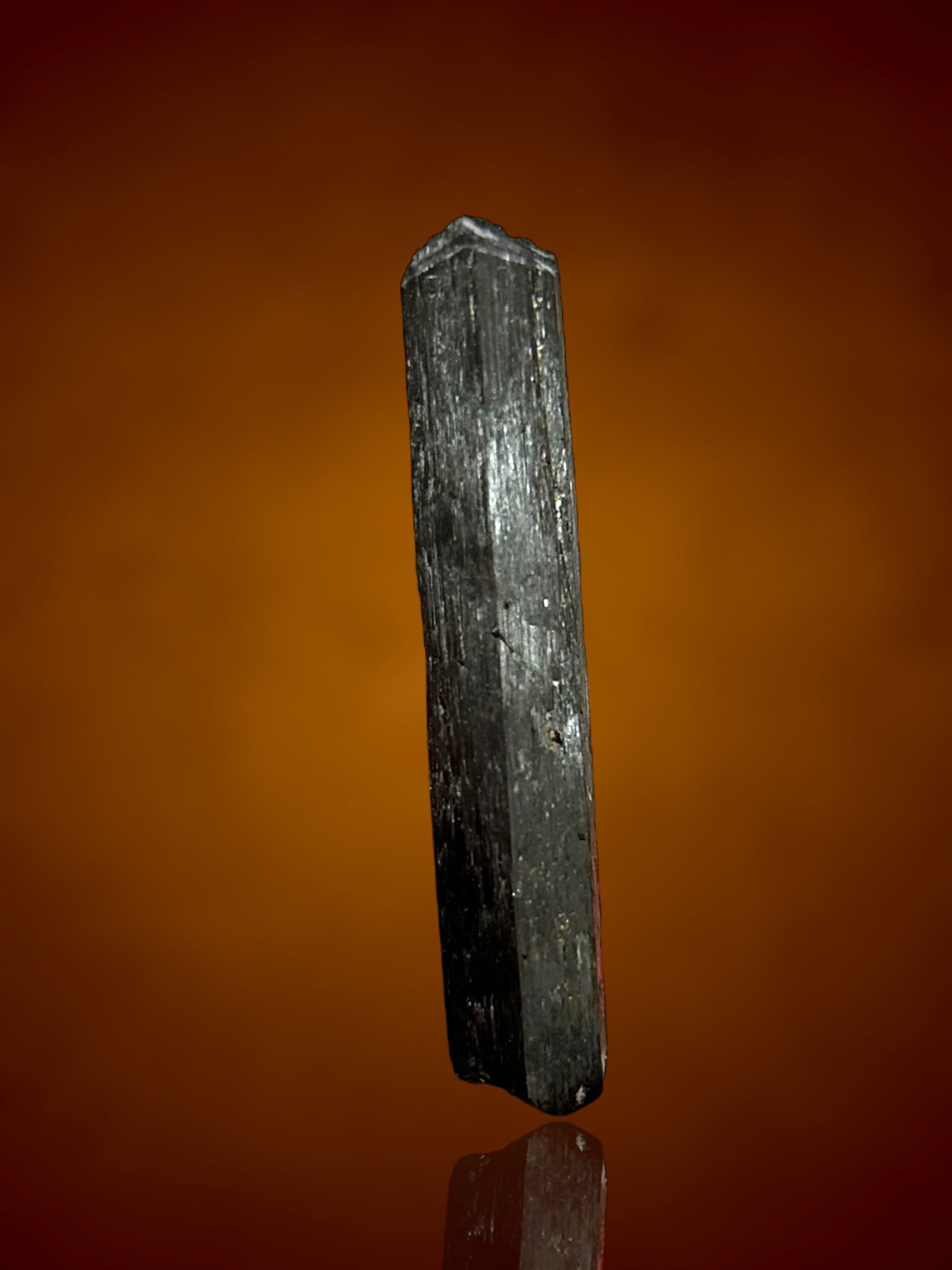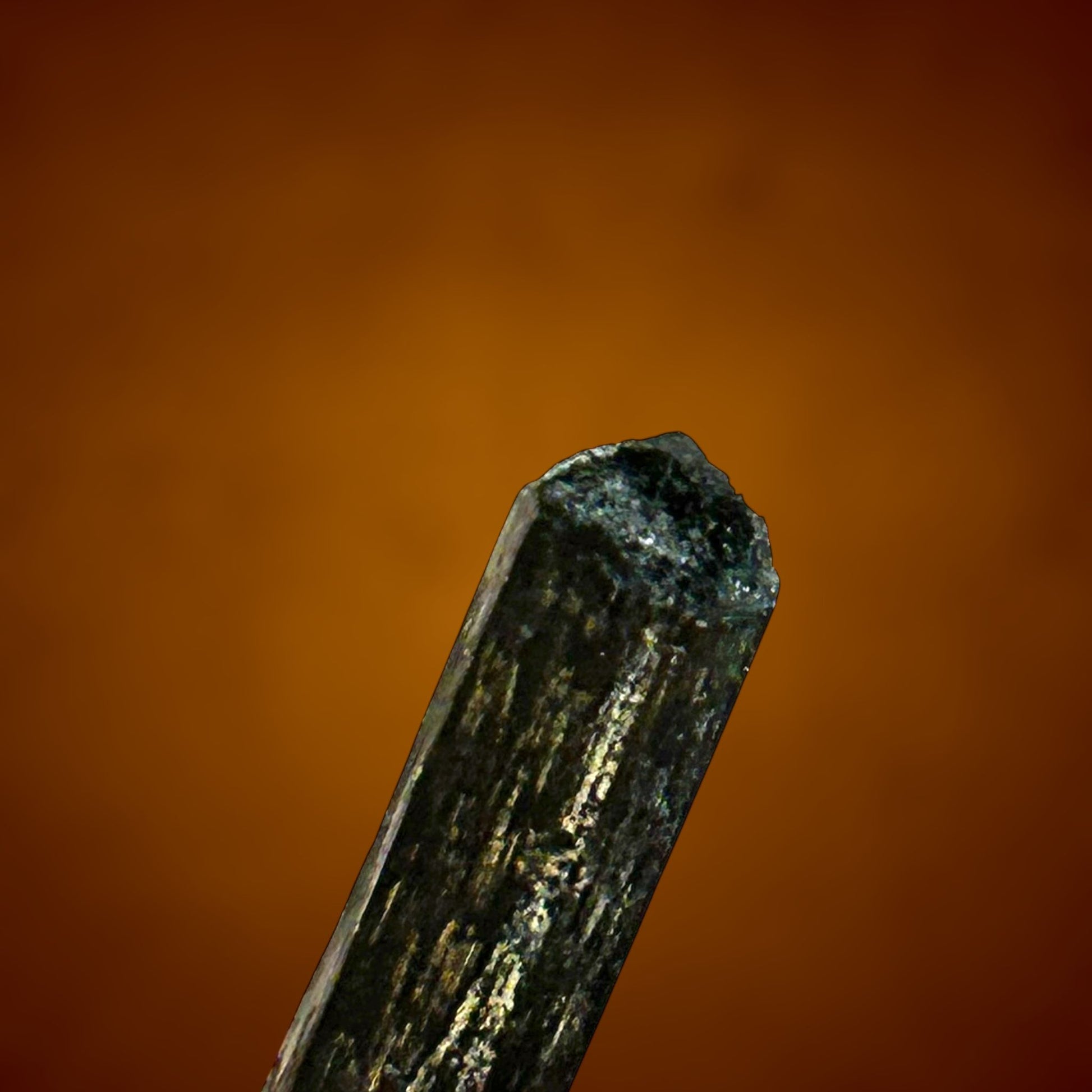 A long-prismatic, highly lustrous tourmaline crystal. Brownish with a subtle shimmer, reminiscent in growth habit, color, and sheen of the Tanzanian dravites, yet representing a new find from the Erongo Mountains, Namibia. We are currently analyzing these tourmalines, as preliminary indications suggest they may represent a new dravite occurrence in the Erongo region.