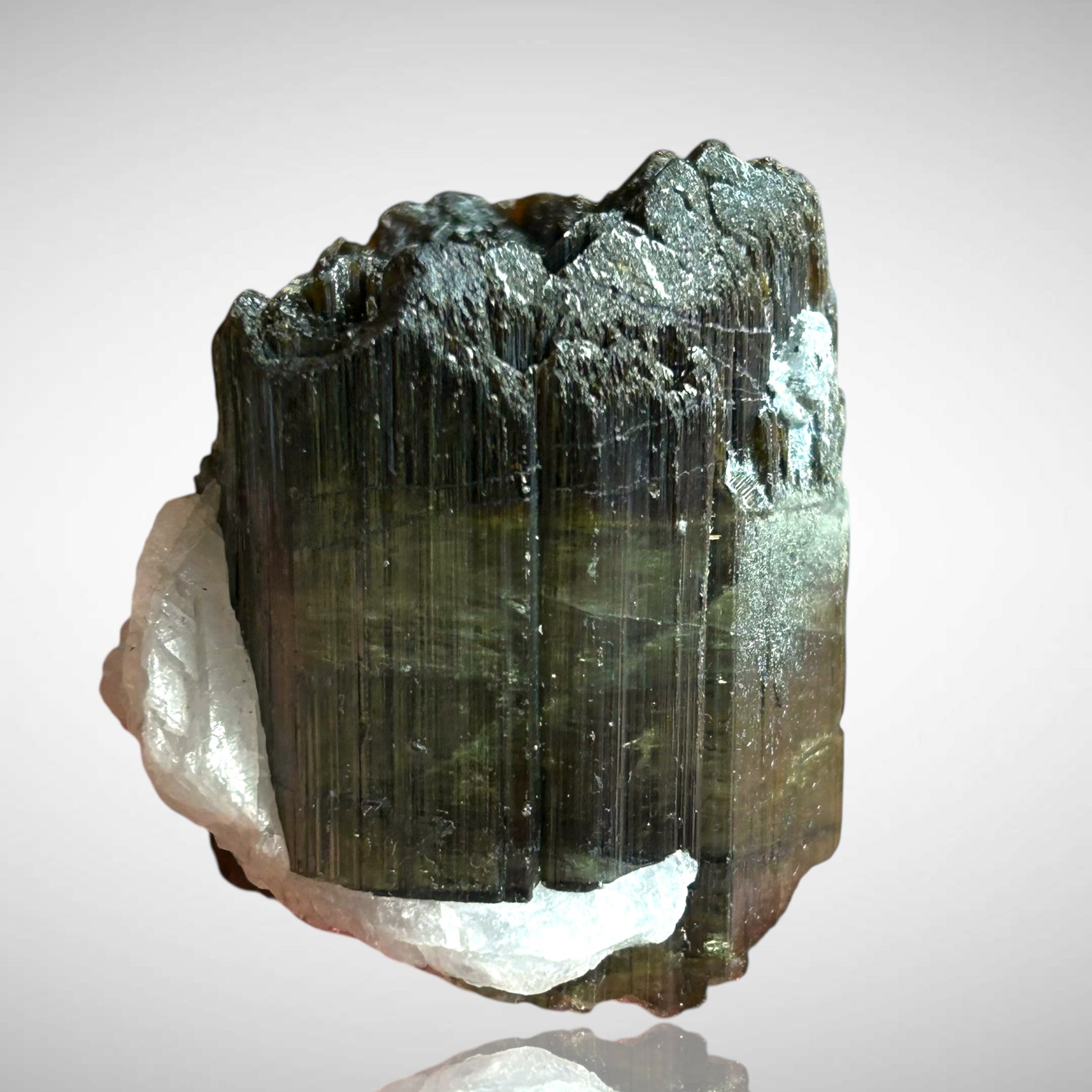 A truly exceptional Watermelon Tourmaline crystal of remarkable habit and coloration. The outer zone displays a deep, saturated green, while the core reveals a vivid, perfectly aligned pink—an ideal “watermelon” composition in both tone and proportion. The specimen measures roughly a thumb in length and four fingers in thickness, with superb, naturally terminated crystal faces and excellent luster. Such a complete and well-developed crystal is a rarity, highly desirable for advanced collectors and connoisseurs of gem minerals.