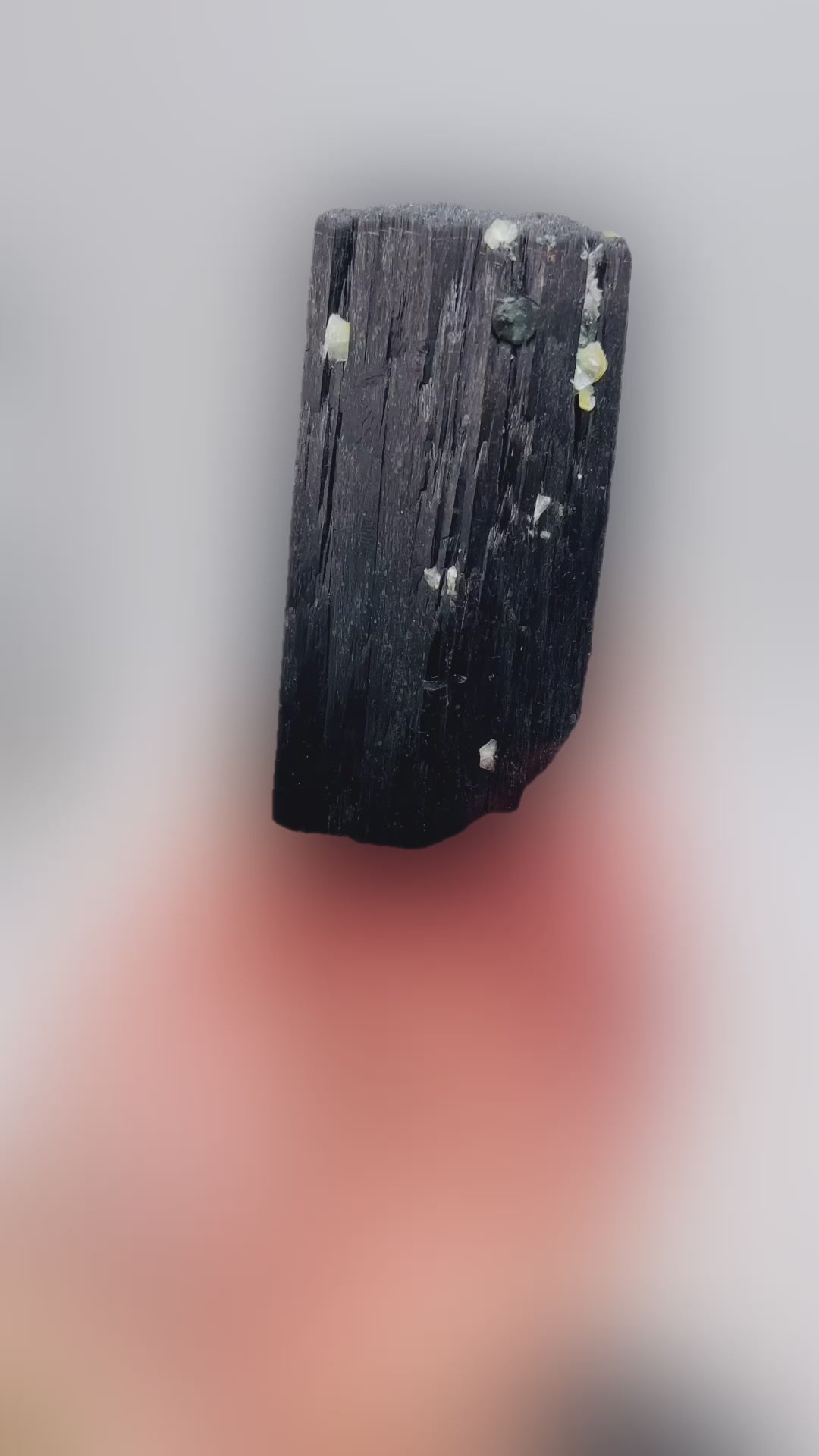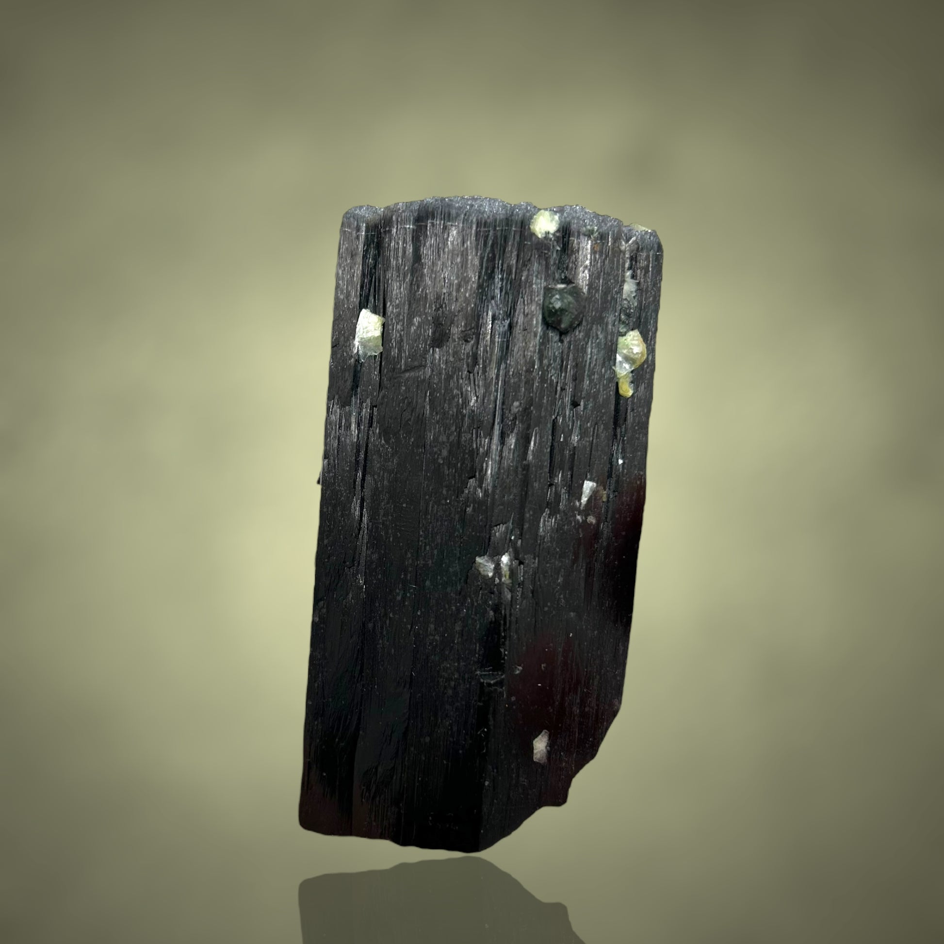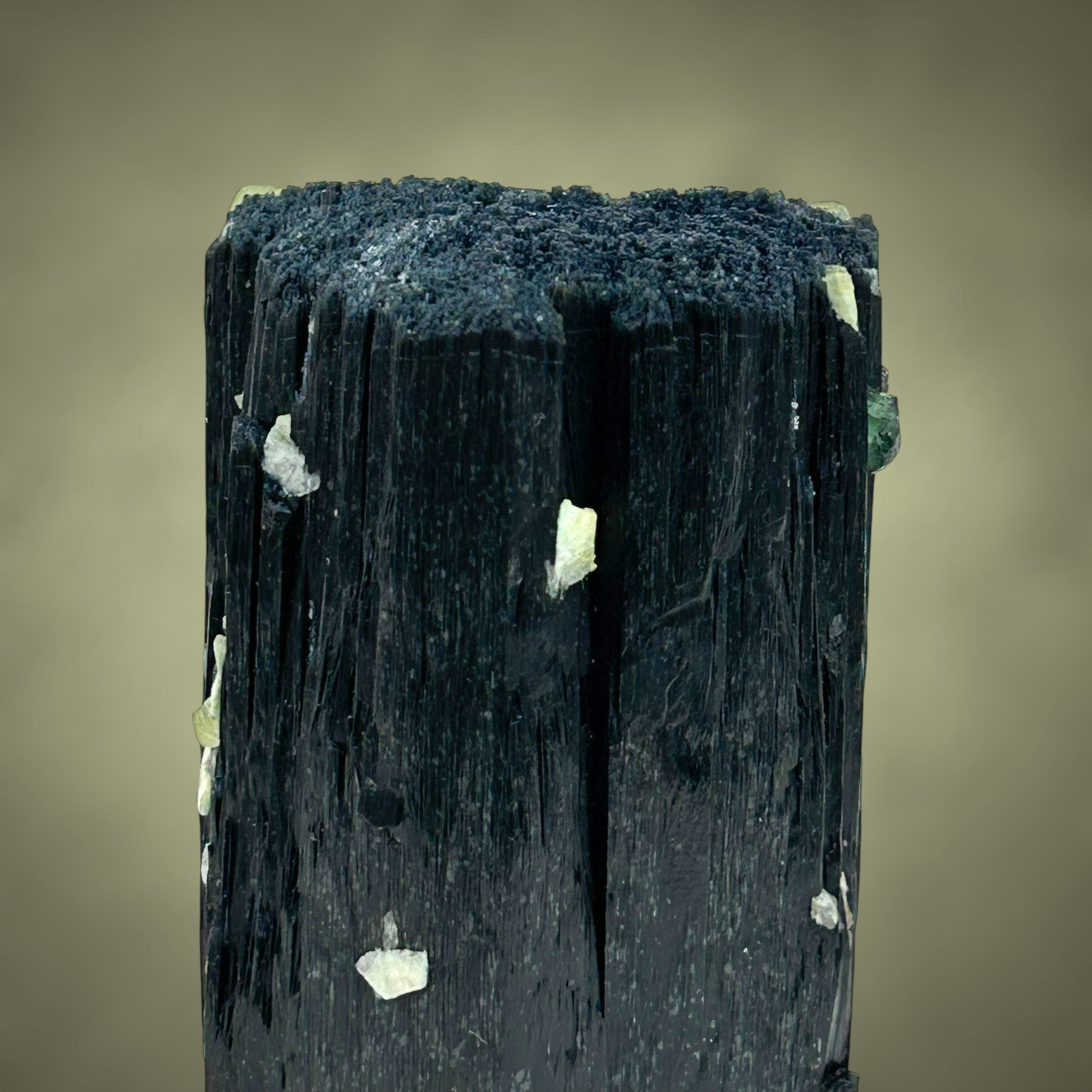 🇩🇪 Richtig großer, komplett unbeschädigter Turmalin mit hochglänzenden Seitenflächen, und irgendwie blau irrisierend zum Kopfende hin.Sein Habitus ähnelt einem Beryll, was an sich auf Feruvit hindeutet.Auf ihm sitzt ein gemmy Fluorit und ein wenig Zinnwaldit.