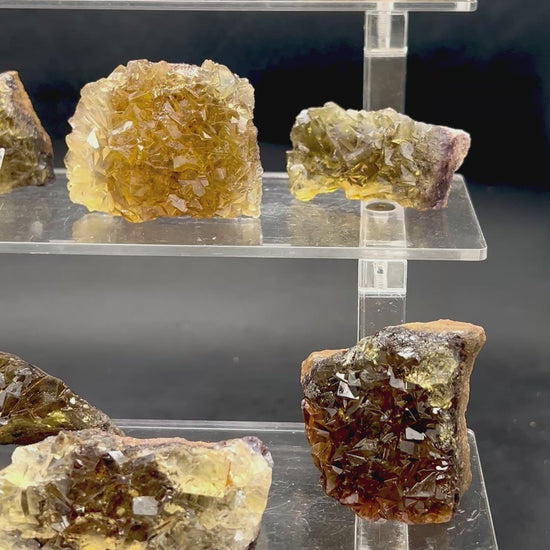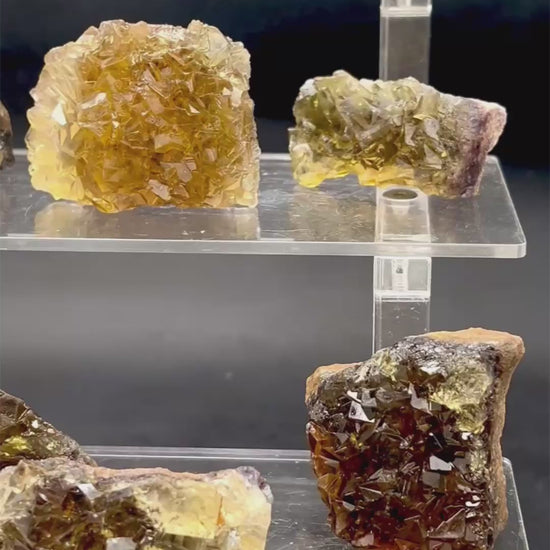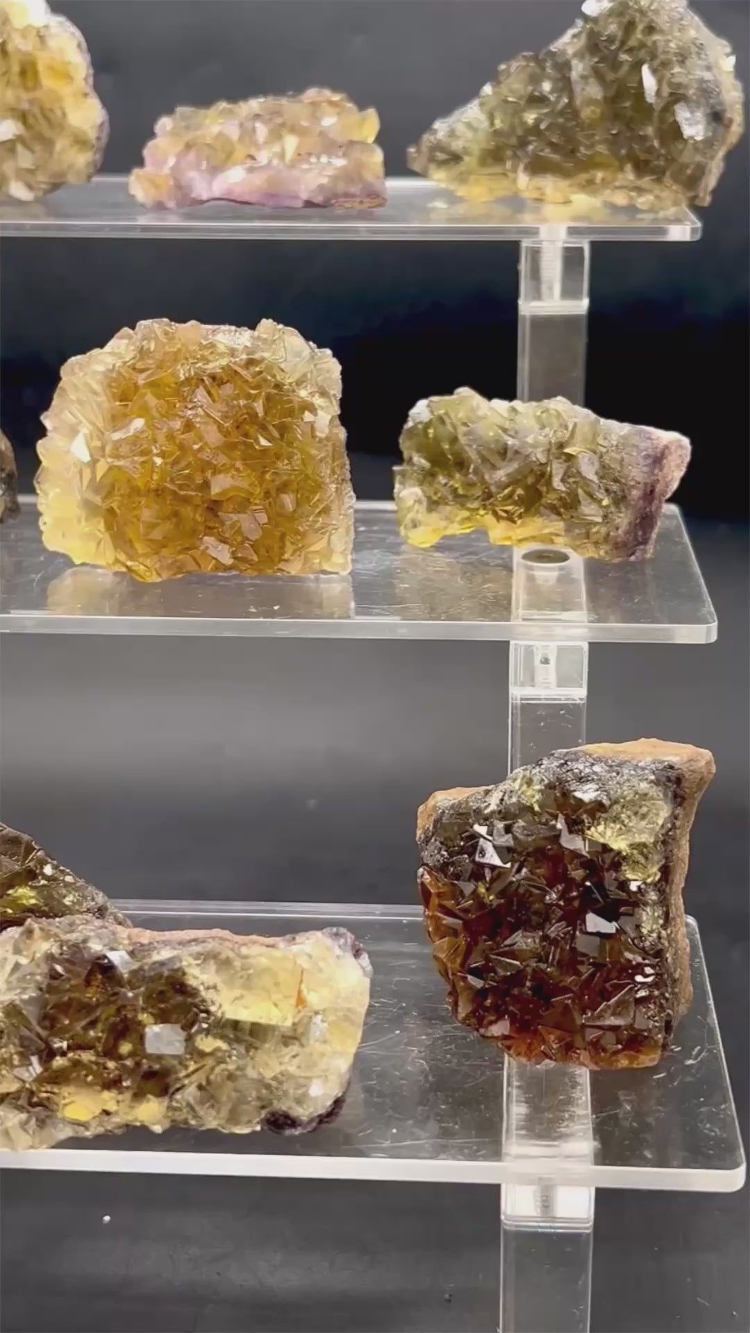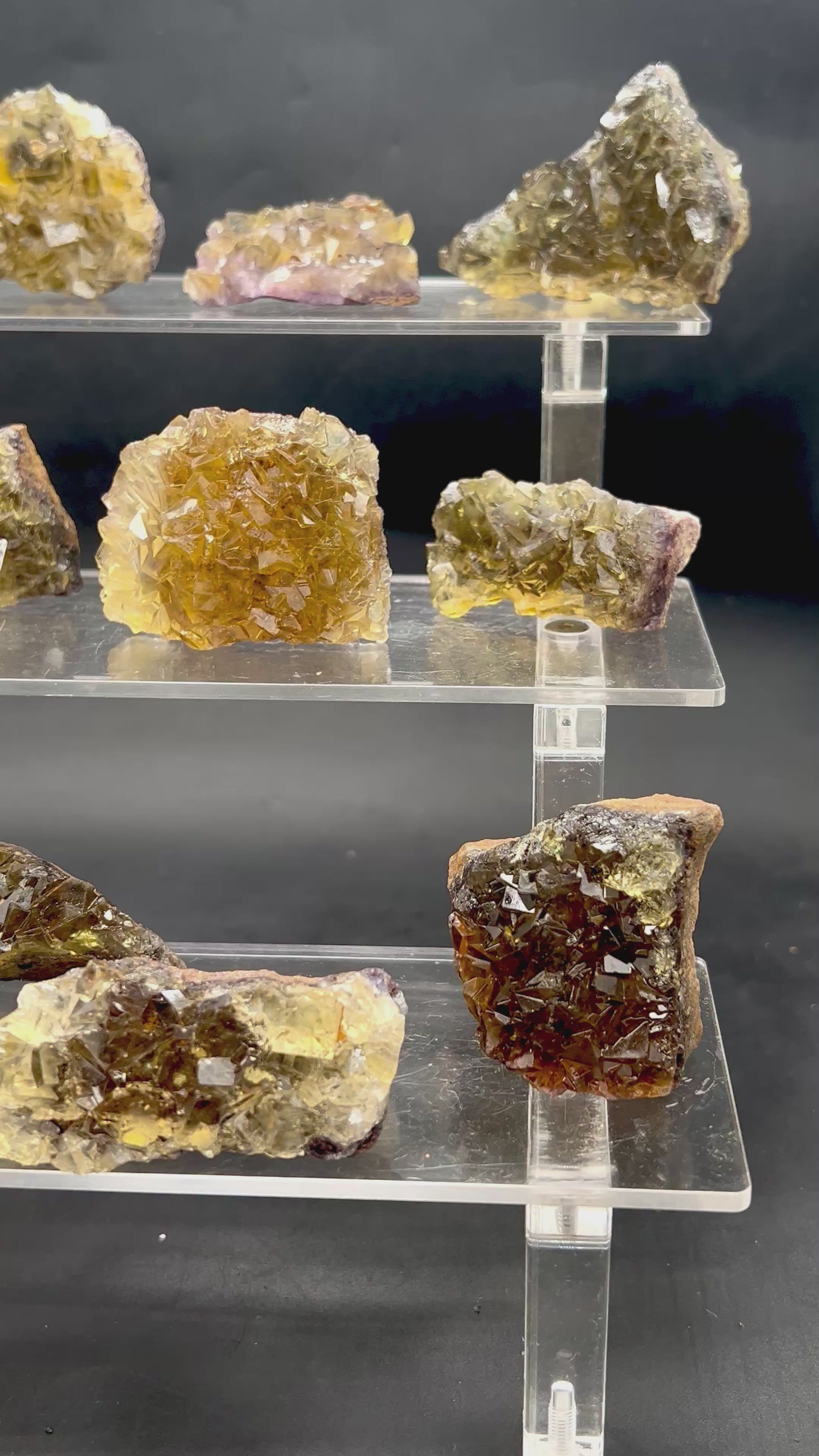 Hier sind 14 hochbrillante, klare, intensiv gelbe und höchst scharfkantige Fluoritstufen.