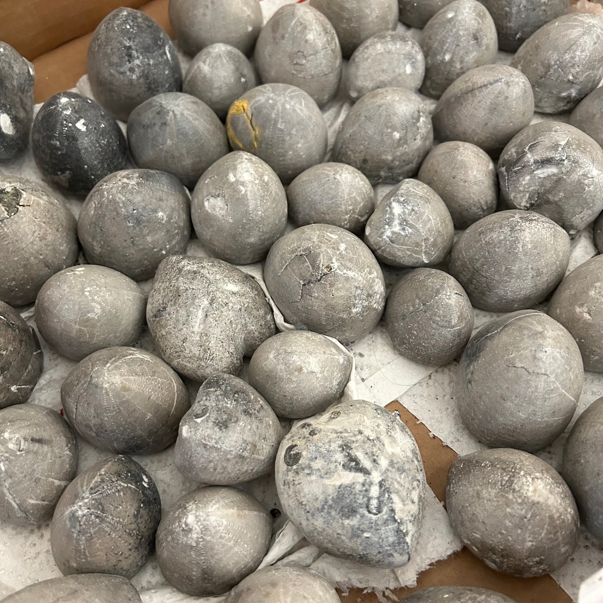 76 versteinerte, kinderfaustgroße Seeigelfossilien aus Höver bei Hannover. Die meisten Exemplare weisen eine gute bis sehr gute Schalenerhaltung auf, sind aber nicht perfekt erhalten.