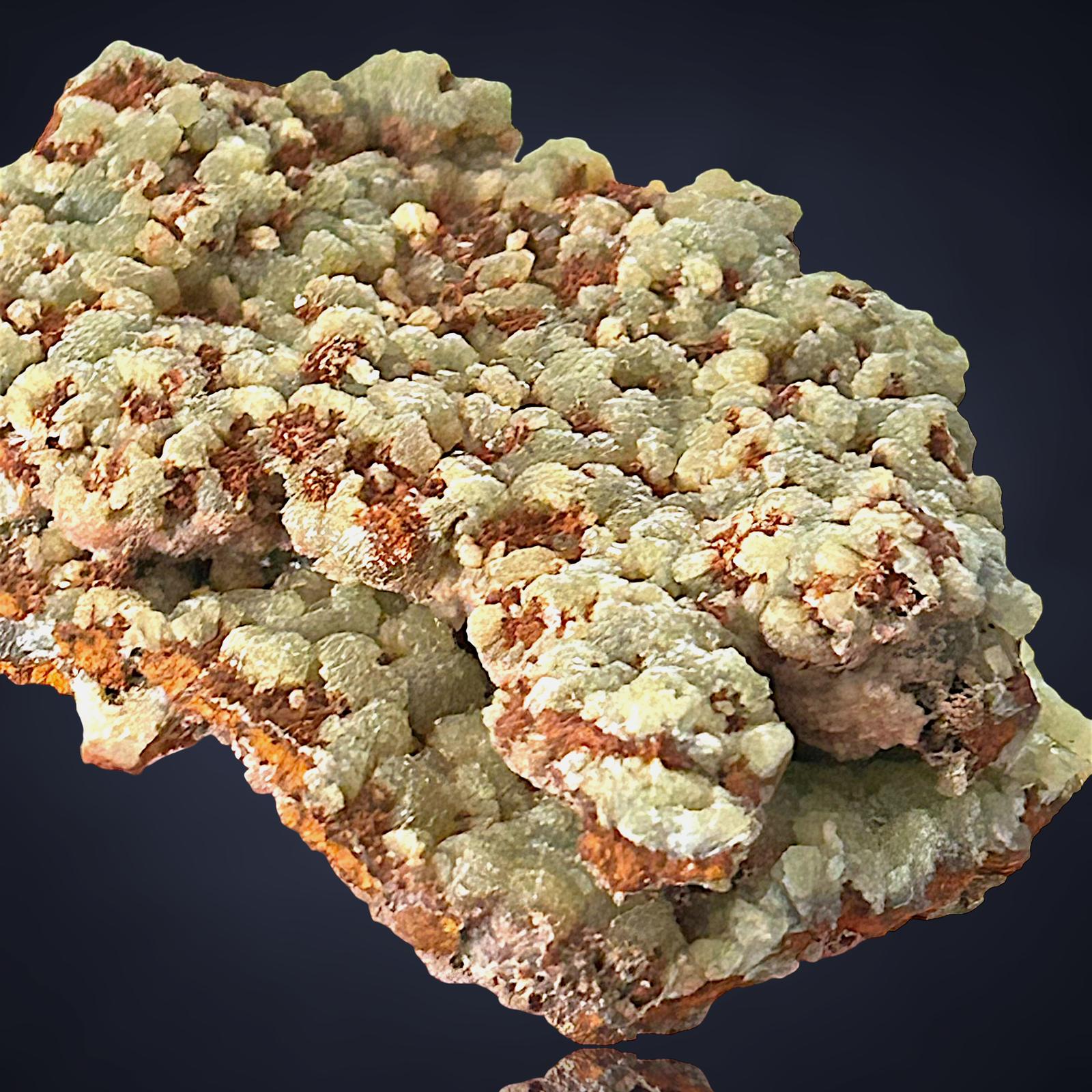 Wunderschöne Stufe zahlreicher, kugelförmiger Kristallcluster von grünlichem Adamin, ästhetisch auf klassischer, kontrastierender Mapimi-Limonitmatrix verteilt.