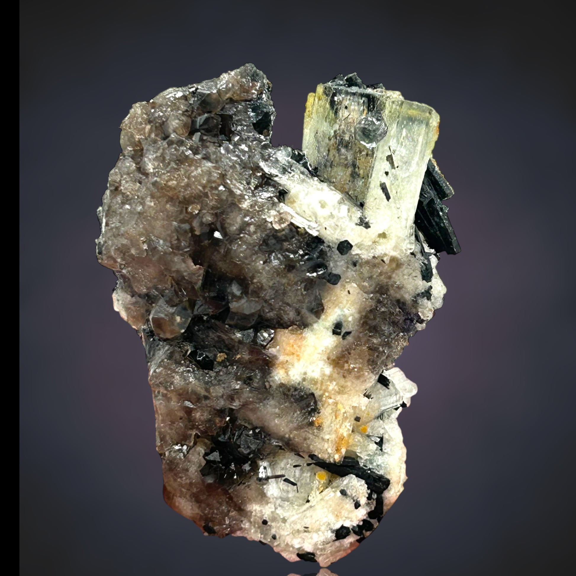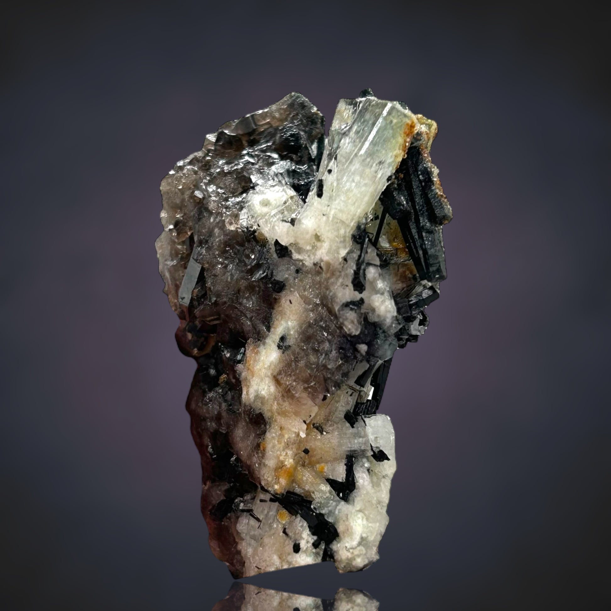 🇬🇧 Aquamarine cluster with a dominant central crystal, magically partially encased in hyalite. A fluorite sits atop the aquamarine crystals. Some smoky quartz sitting aside too.