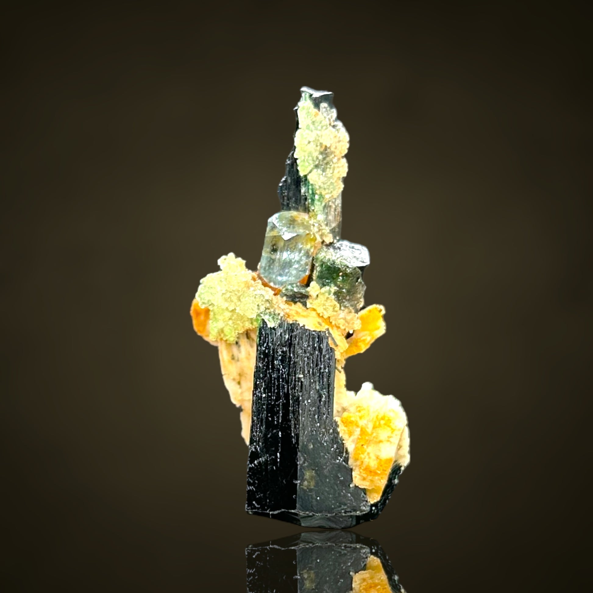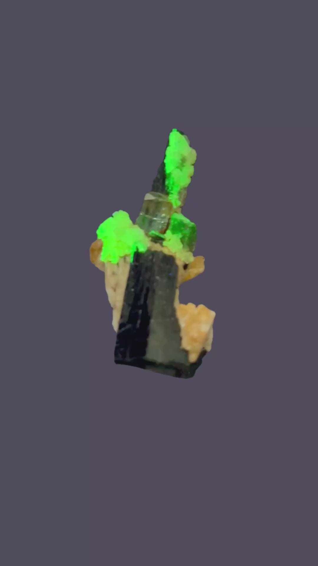 🇬🇧 A brilliant aquamarine with a fine head termination, sitting on a schorl tourmaline and virtually encased in hyalite.