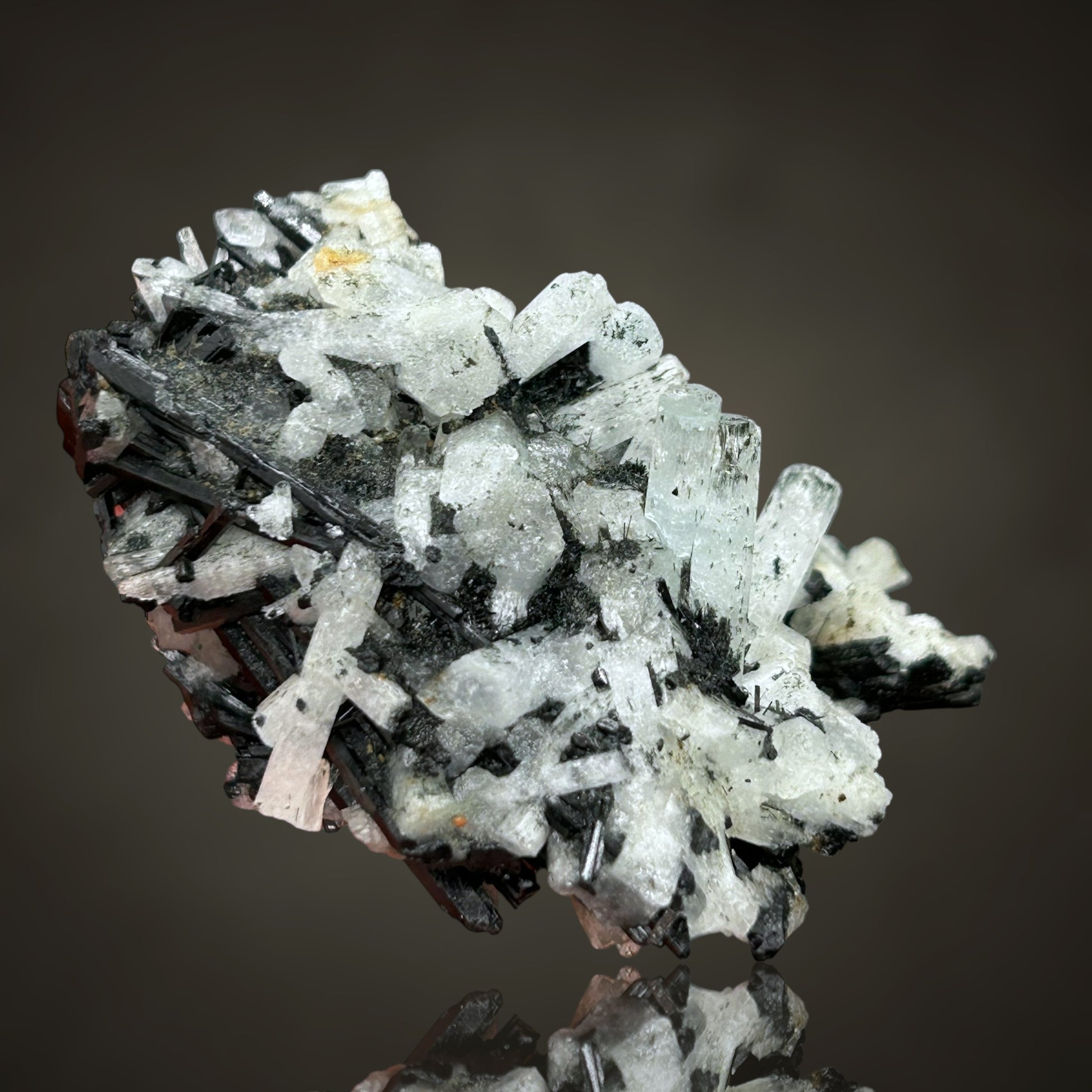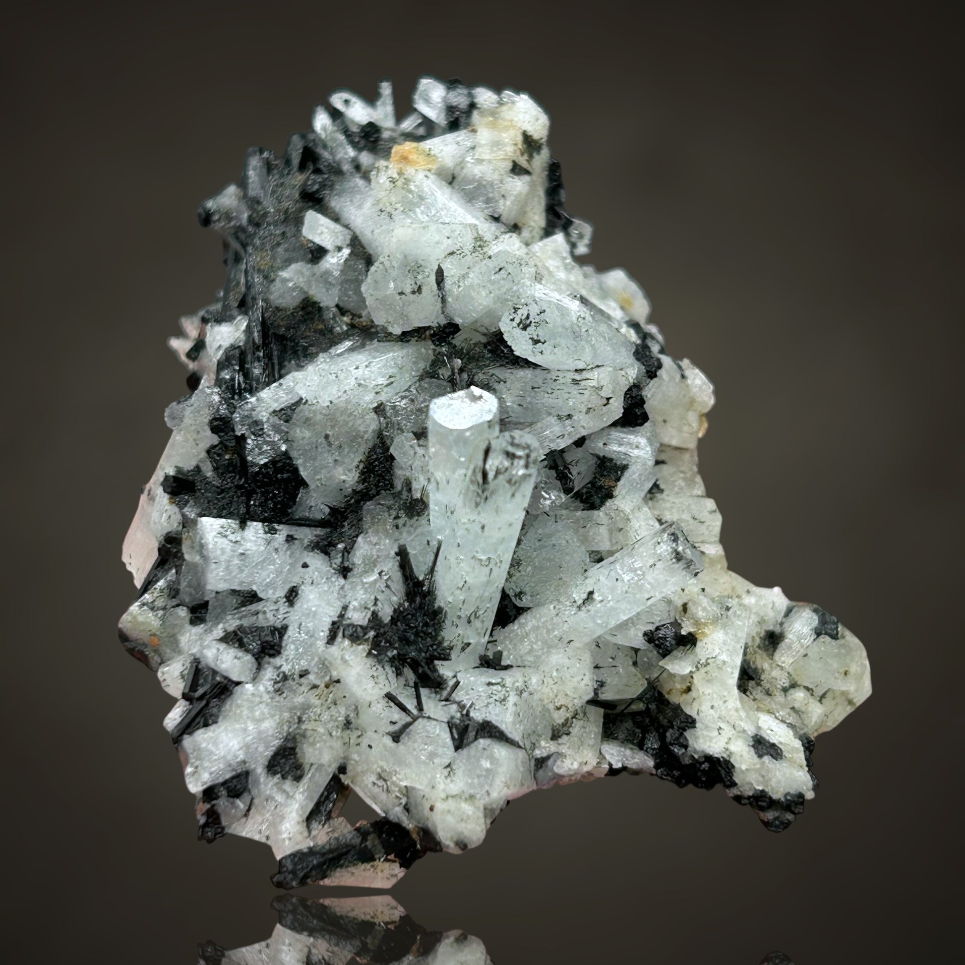 🇬🇧 Aquamarine/Schorl Tourmaline cluster with numerous small and larger crystals. Two centrally located, freely growing main crystals in the center of the specimen are particularly noteworthy. Very chic 👌🏼