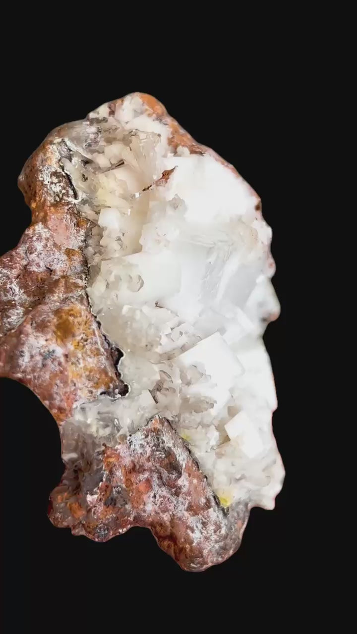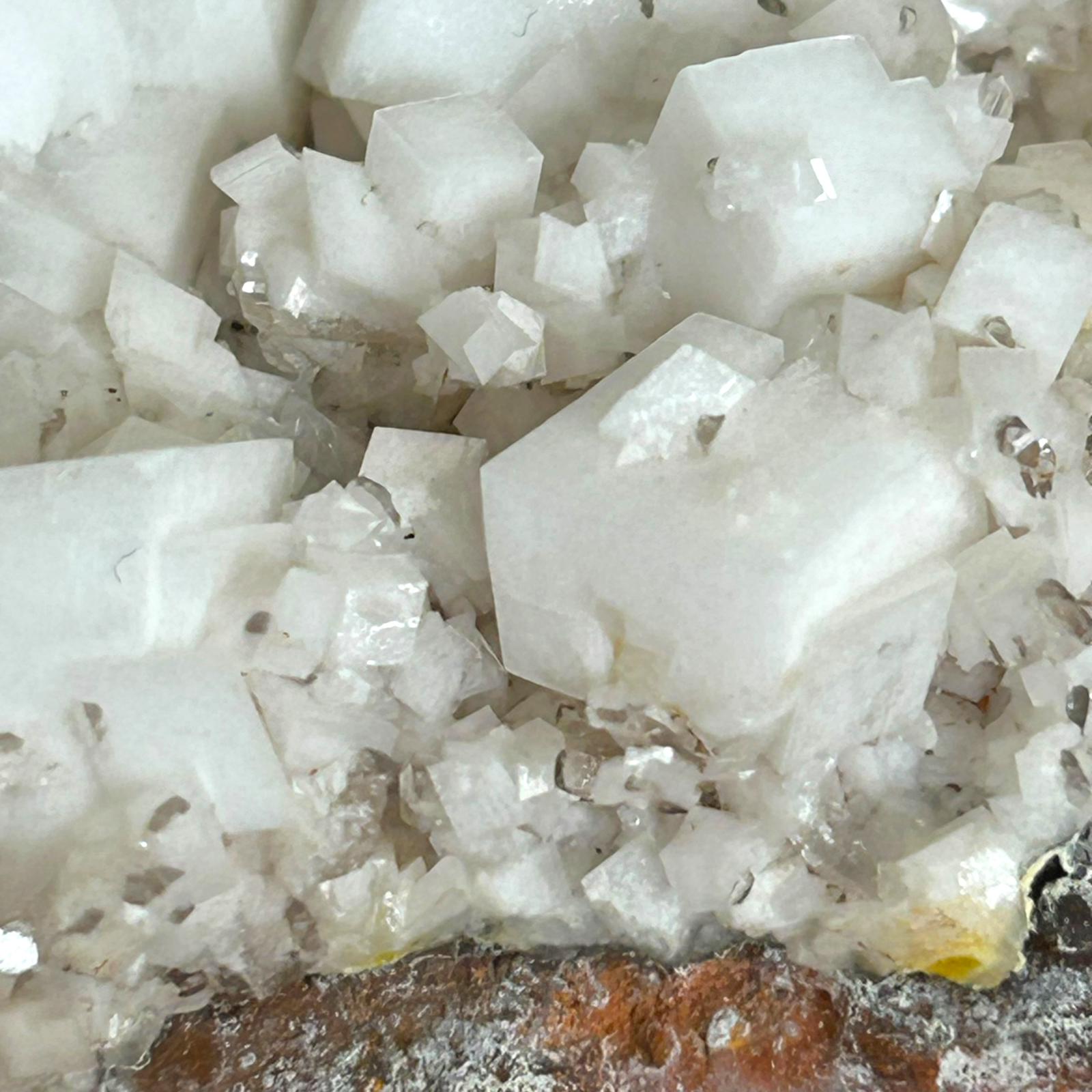 Eine wunderschöne klassischee Paragenesestufe mit sehr scharfen und gut ausgebildeten, kreideweißen Calcit-Rhomben, die mit dünnen, gemmy, farblosen bis rötlich-braunen Hemimorphit-Kristallen und kleineren Bereichen von blassgelbem Mimetesit vergesellschaftet sind.