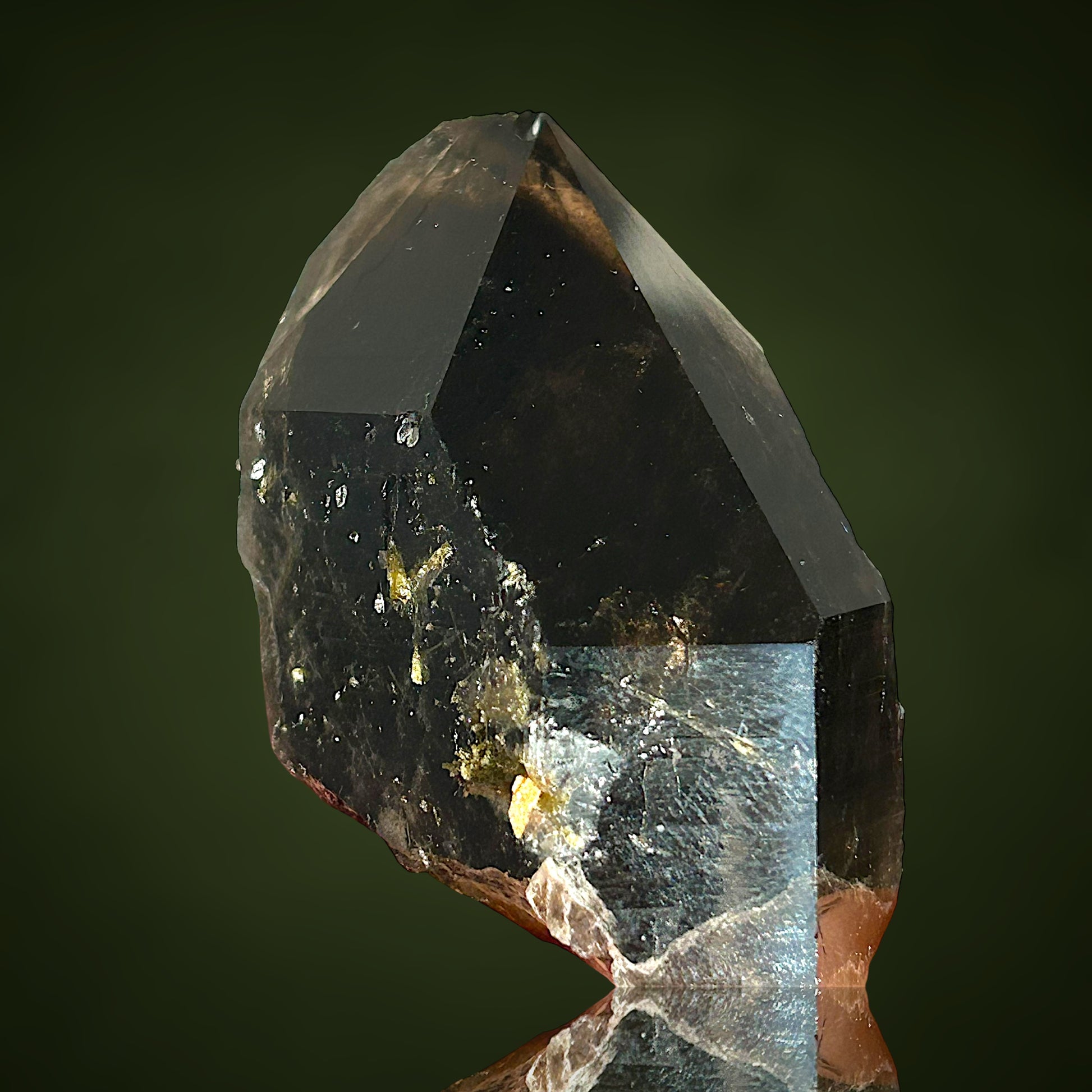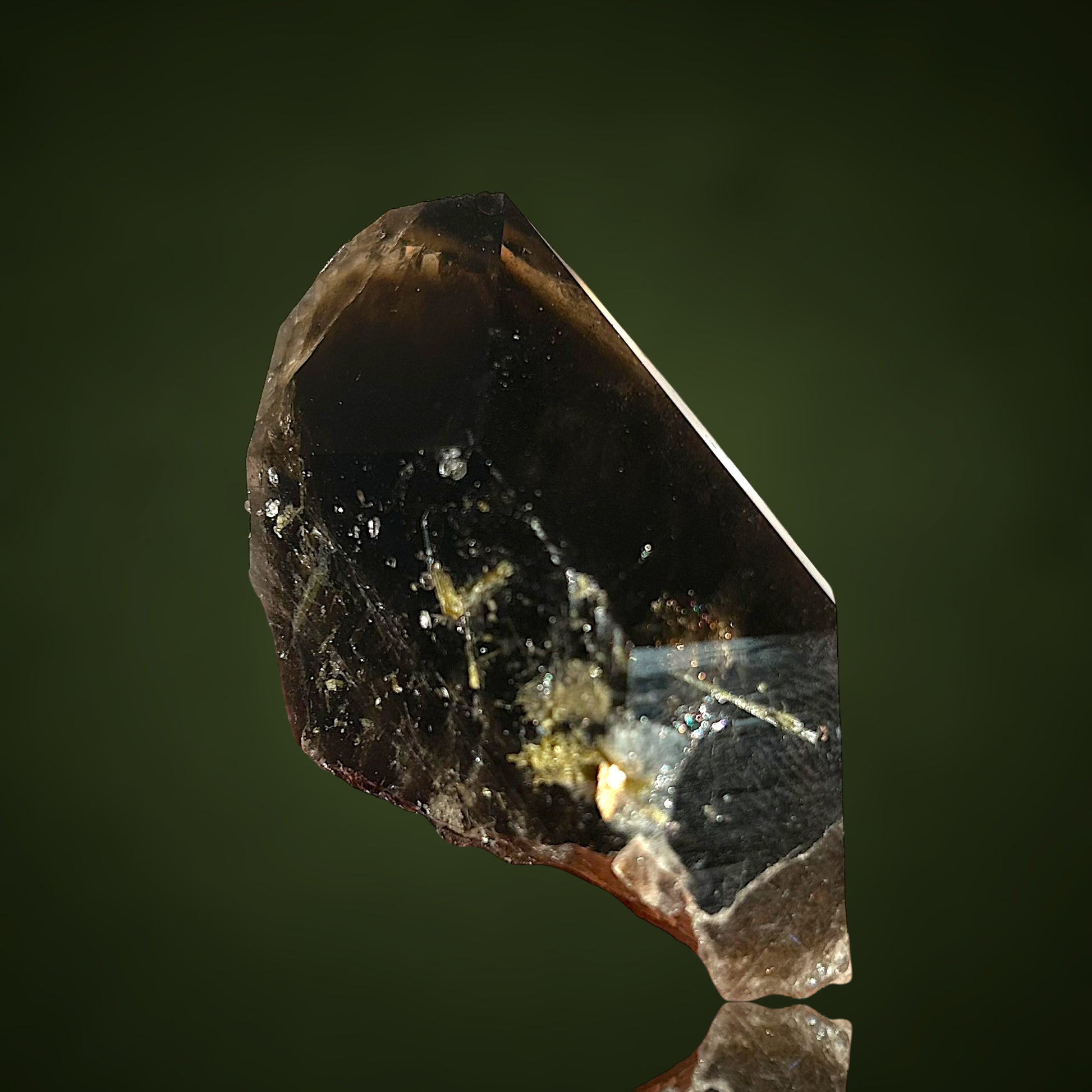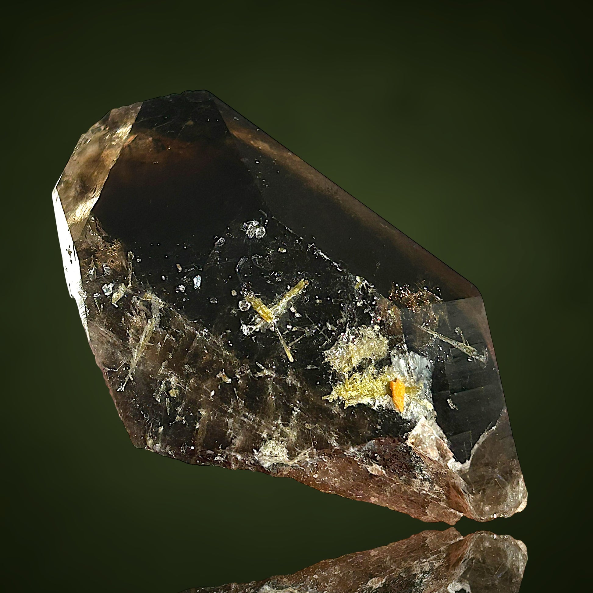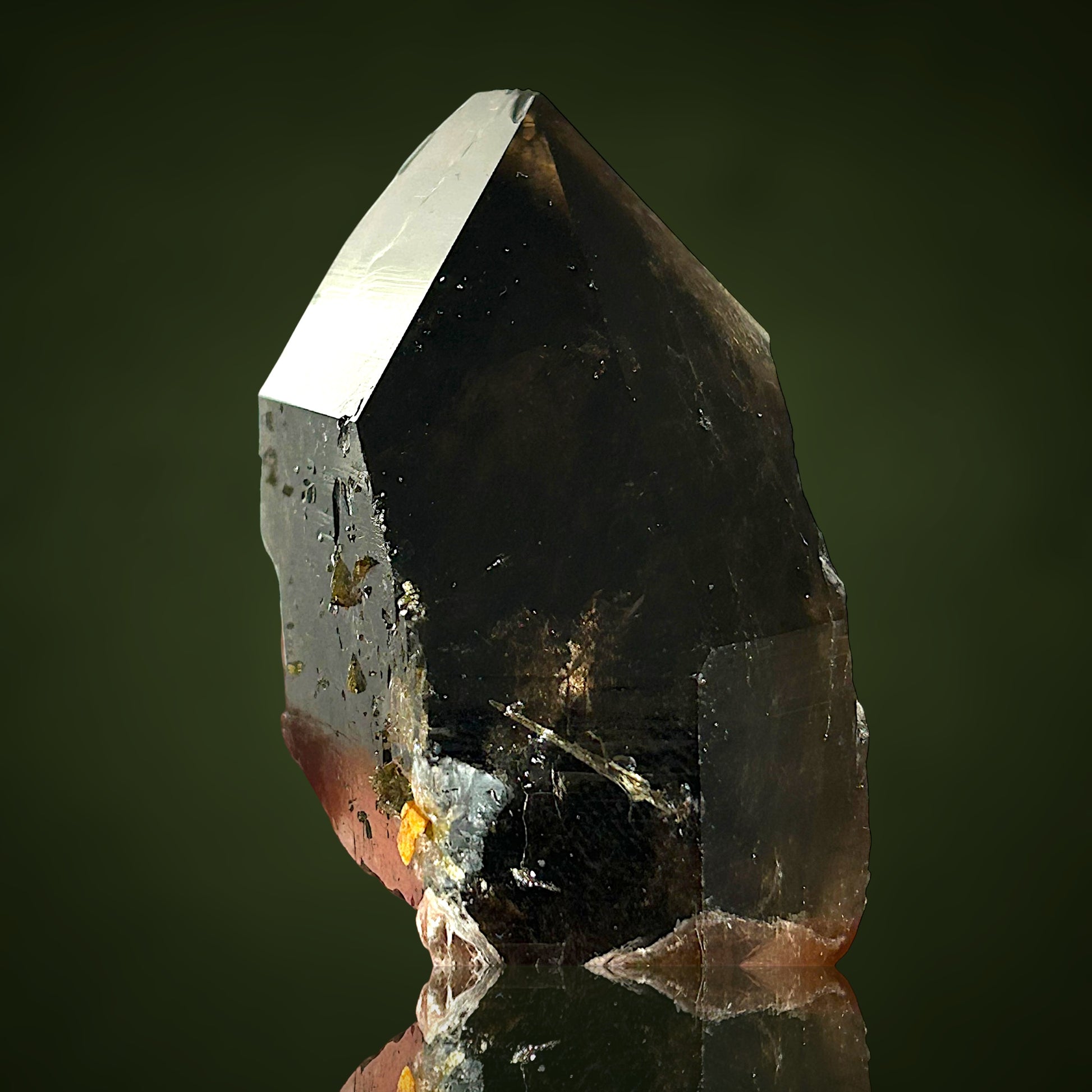 Wunderbarer nussbrauner Rauchquarz mit ausgeprägtem Phantom und scharfen grünen Epidotkristallen, die darin eingeschlossen sind und auf der Oberfläche gewachsen sind. Ein feines und sehr typisches Exemplar aus den klassischen Granitsteinbrüchen von Strzegom (Striegau) in Polen, ein wahrer europäischer Fundortklassiker.