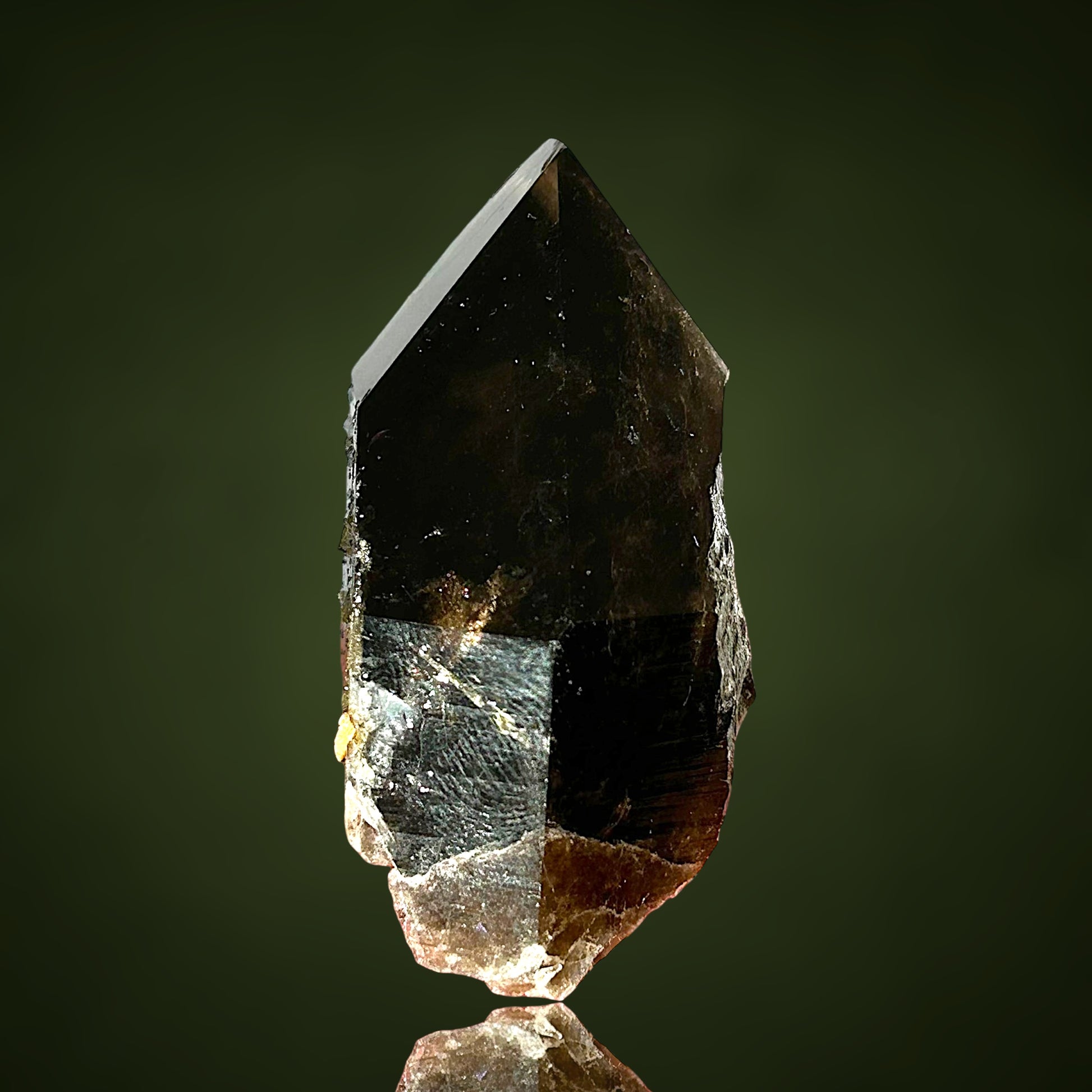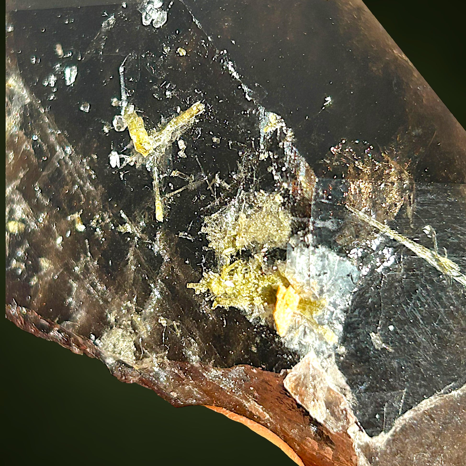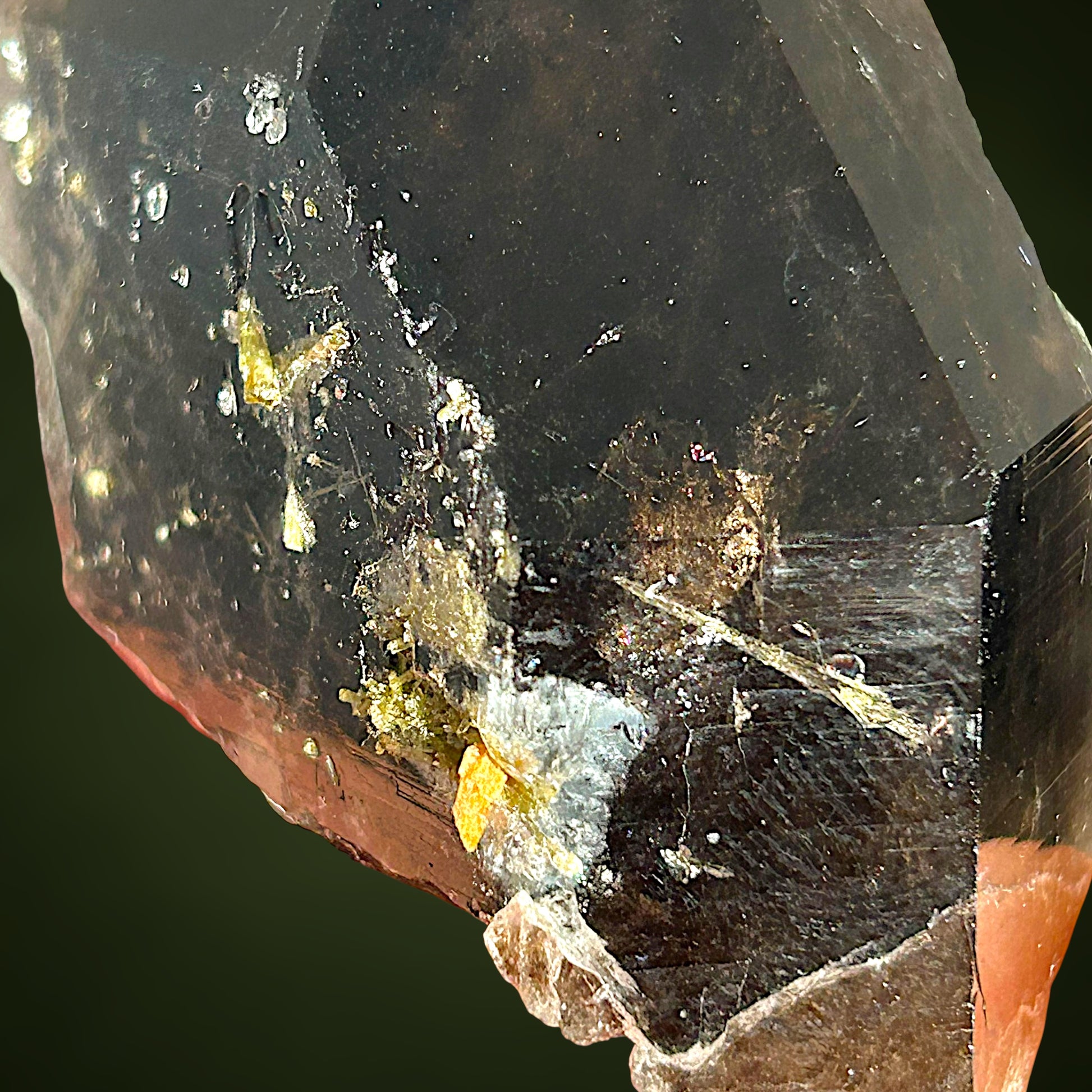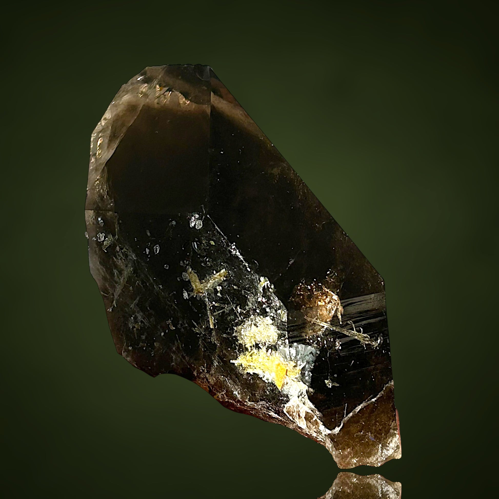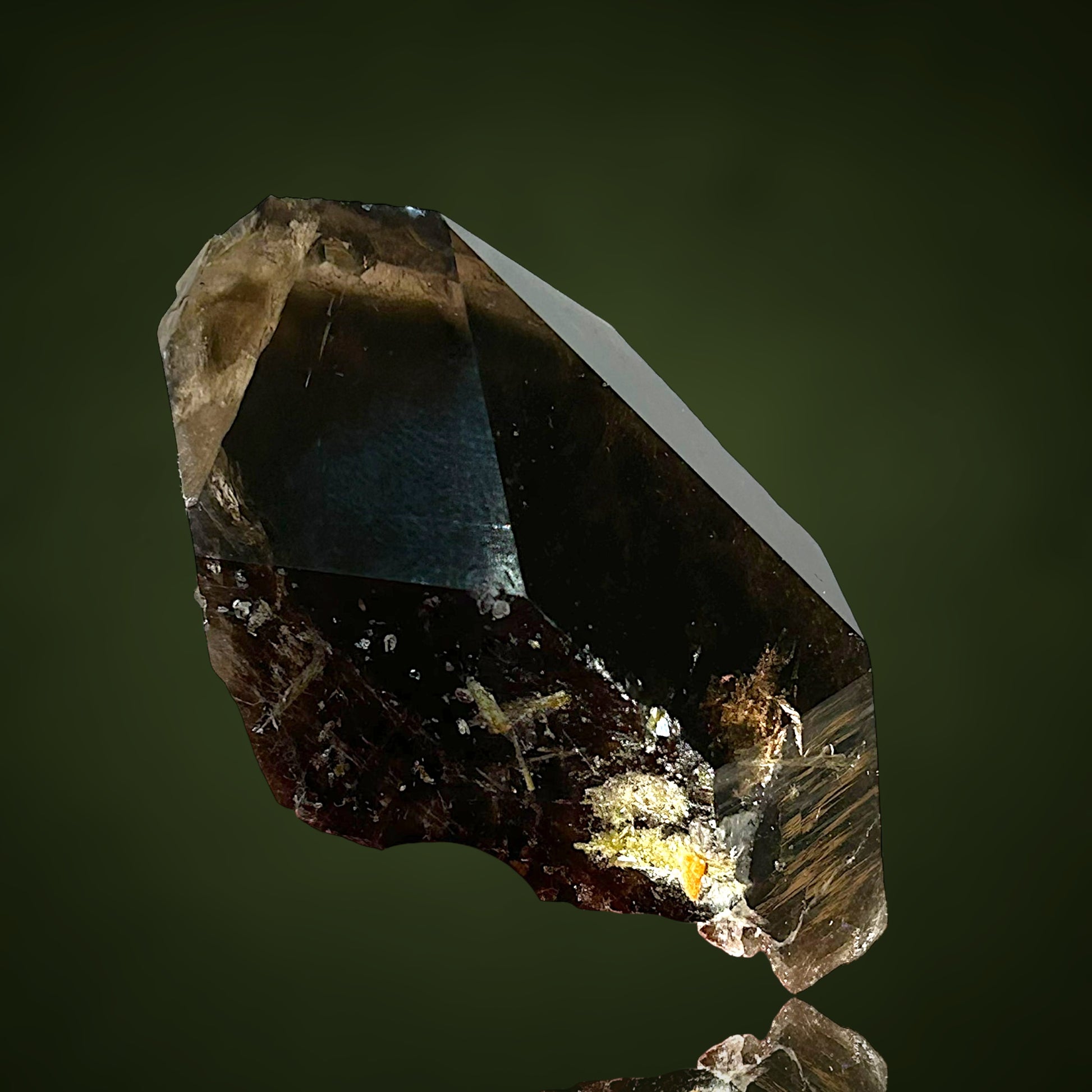 Wunderbarer nussbrauner Rauchquarz mit ausgeprägtem Phantom und scharfen grünen Epidotkristallen, die darin eingeschlossen sind und auf der Oberfläche gewachsen sind. Ein feines und sehr typisches Exemplar aus den klassischen Granitsteinbrüchen von Strzegom (Striegau) in Polen, ein wahrer europäischer Fundortklassiker.