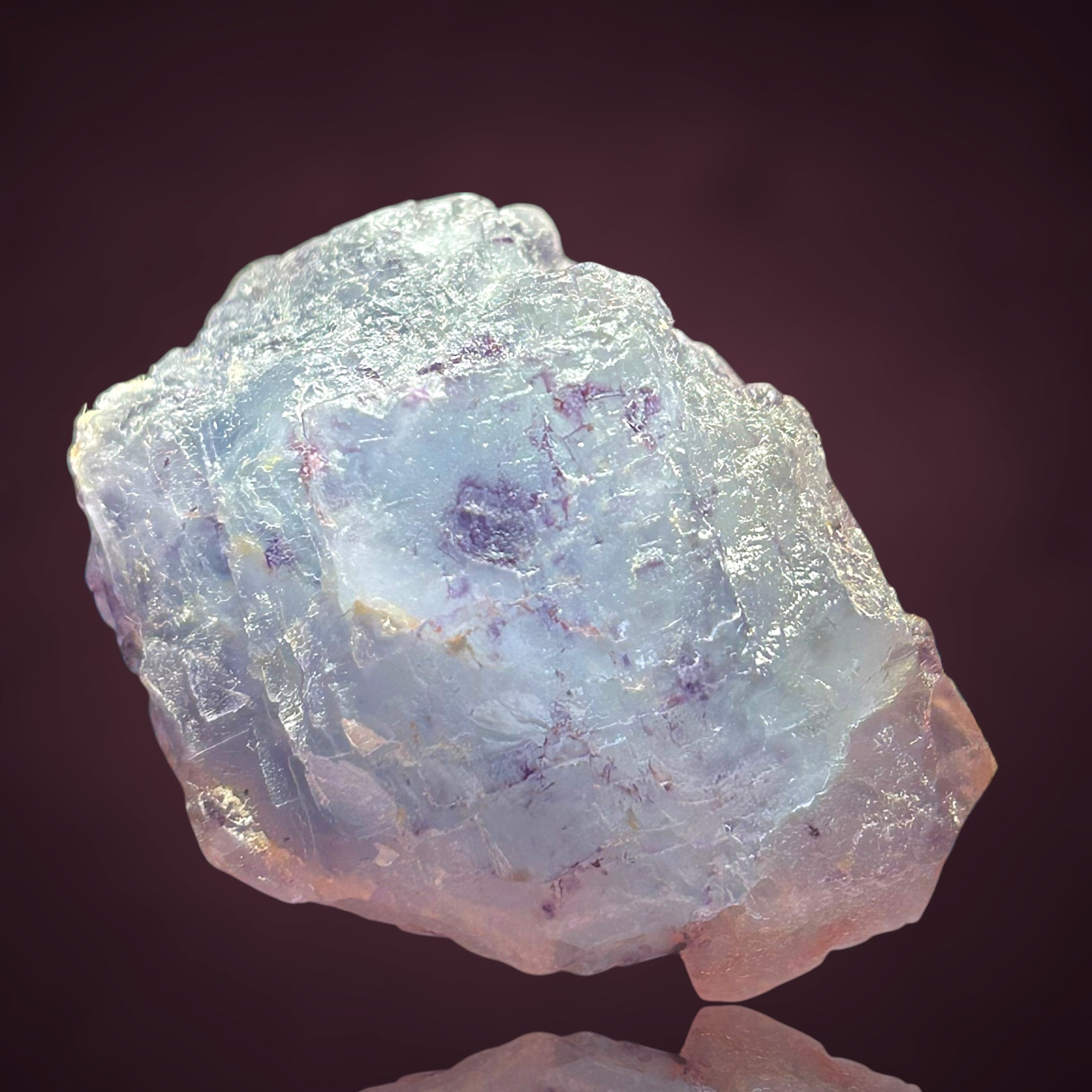 Ein außergewöhnlicher Fluorit in dem charakteristischen eisigen Alpenblau, hervorgehoben durch einen dezent verschobenen violetten Phantom – ein seltenes Merkmal, das auf sekundäres Kristallwachstum während leichter geologischer Bewegungen hindeutet. Diese ungewöhnliche Phantomausrichtung macht das Stück für fortgeschrittene Sammler alpiner Mineralien und Kenner von Weißeck-Material besonders begehrenswert.