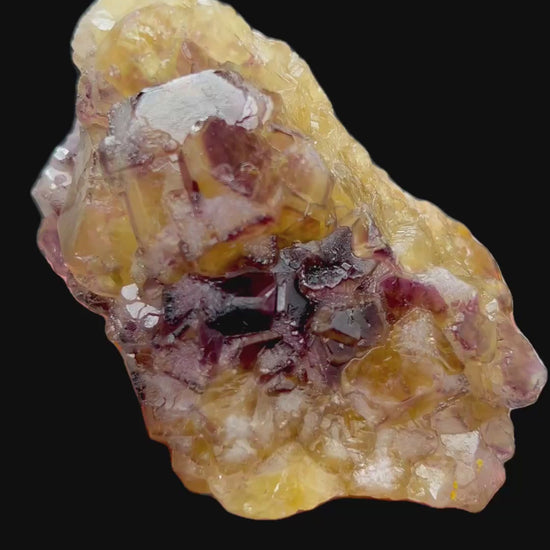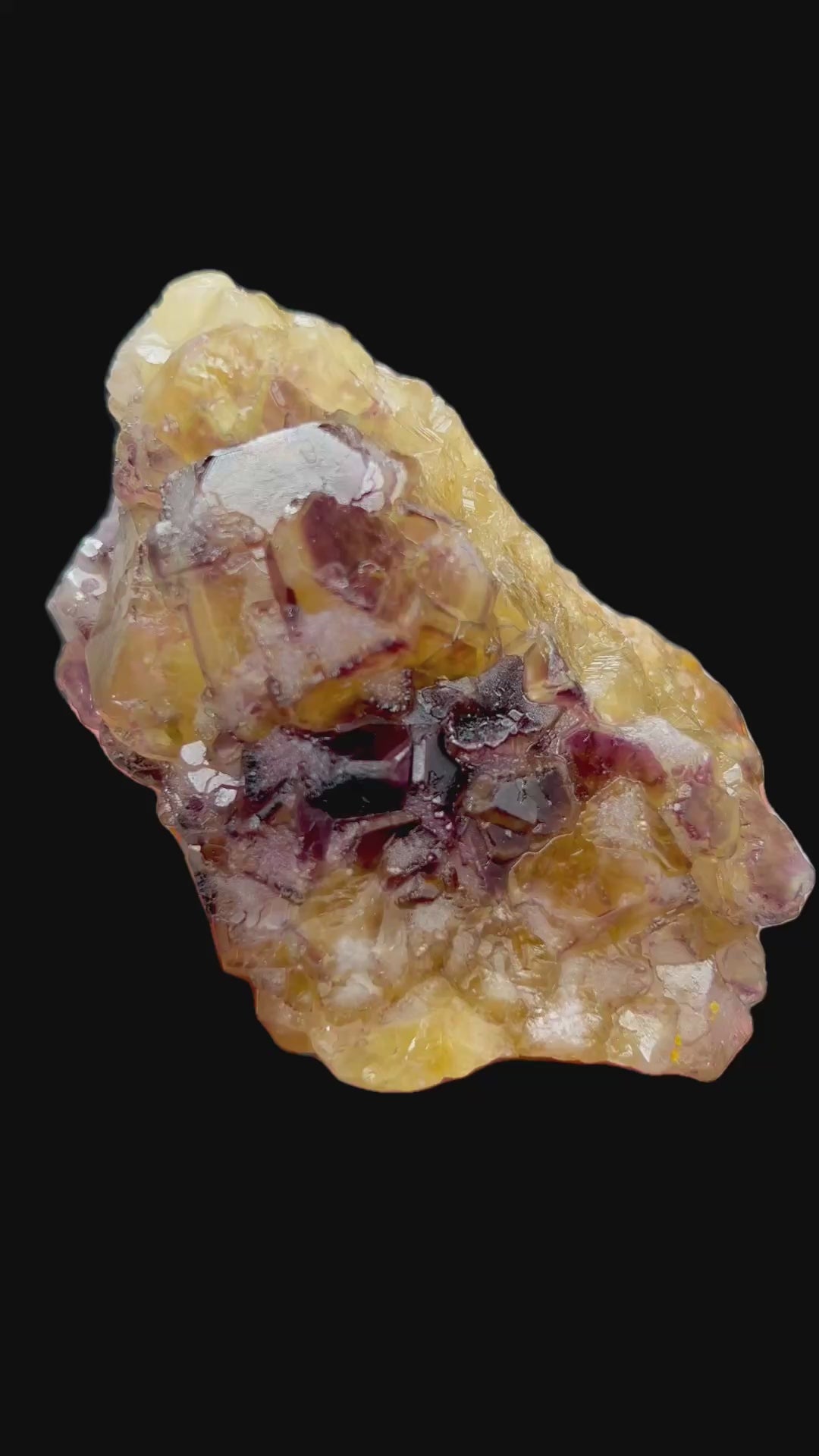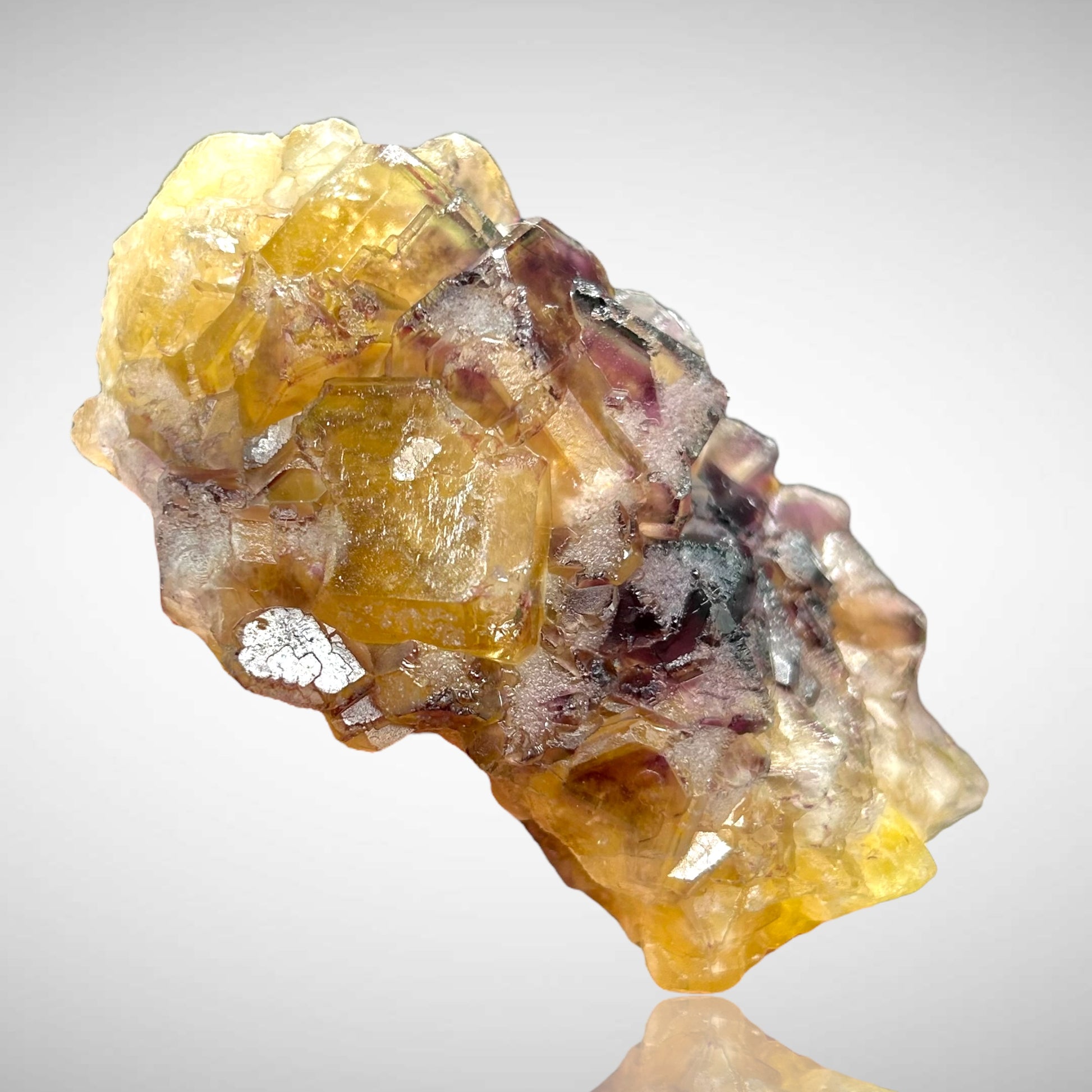 Hervorragende Fluoritkristalle bis zu 2 cm Größe, überwiegend Fanta-Gelb, durchwachsen mit violetten Farbzonen, die attraktive innere Phantome bilden.