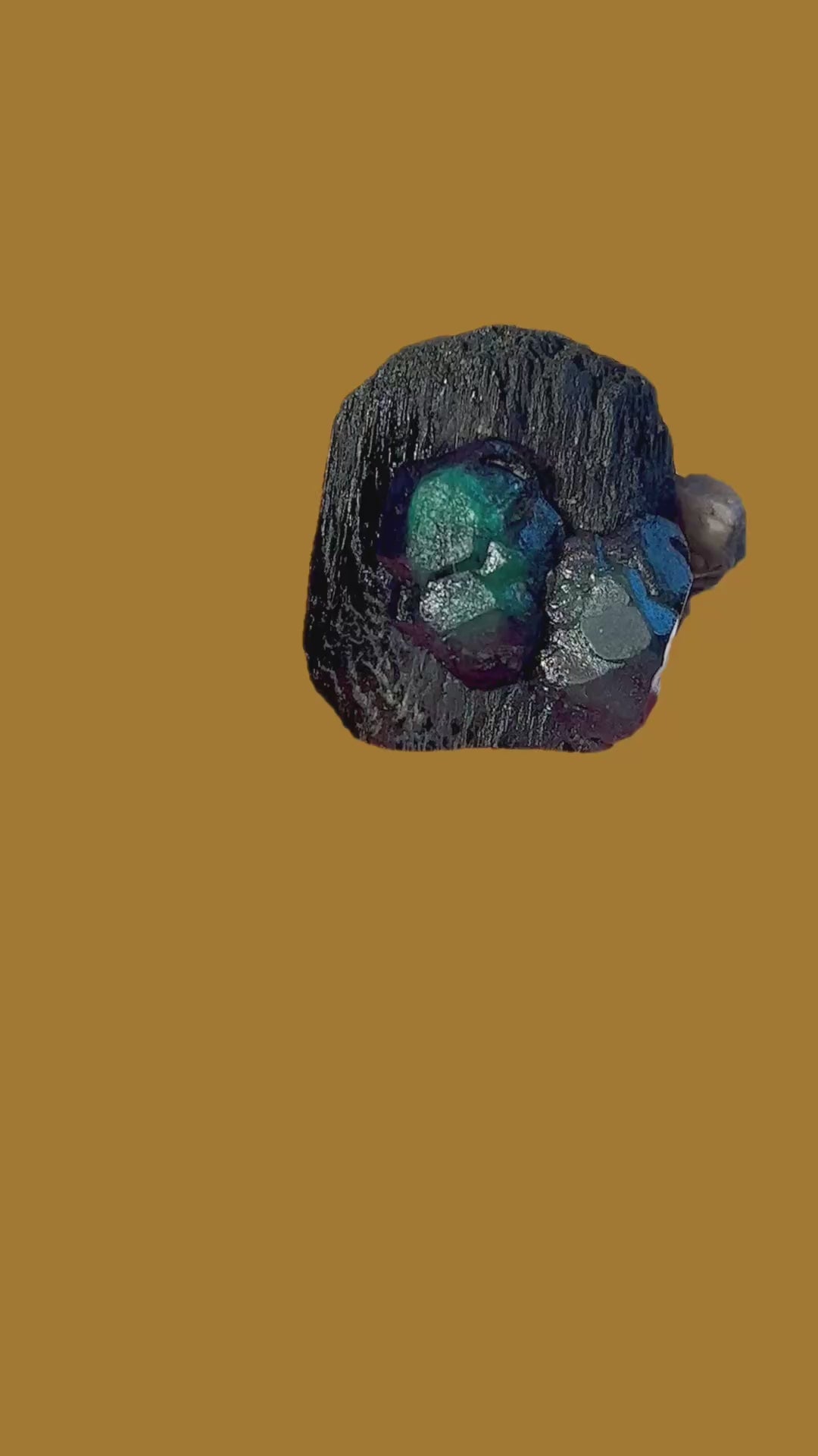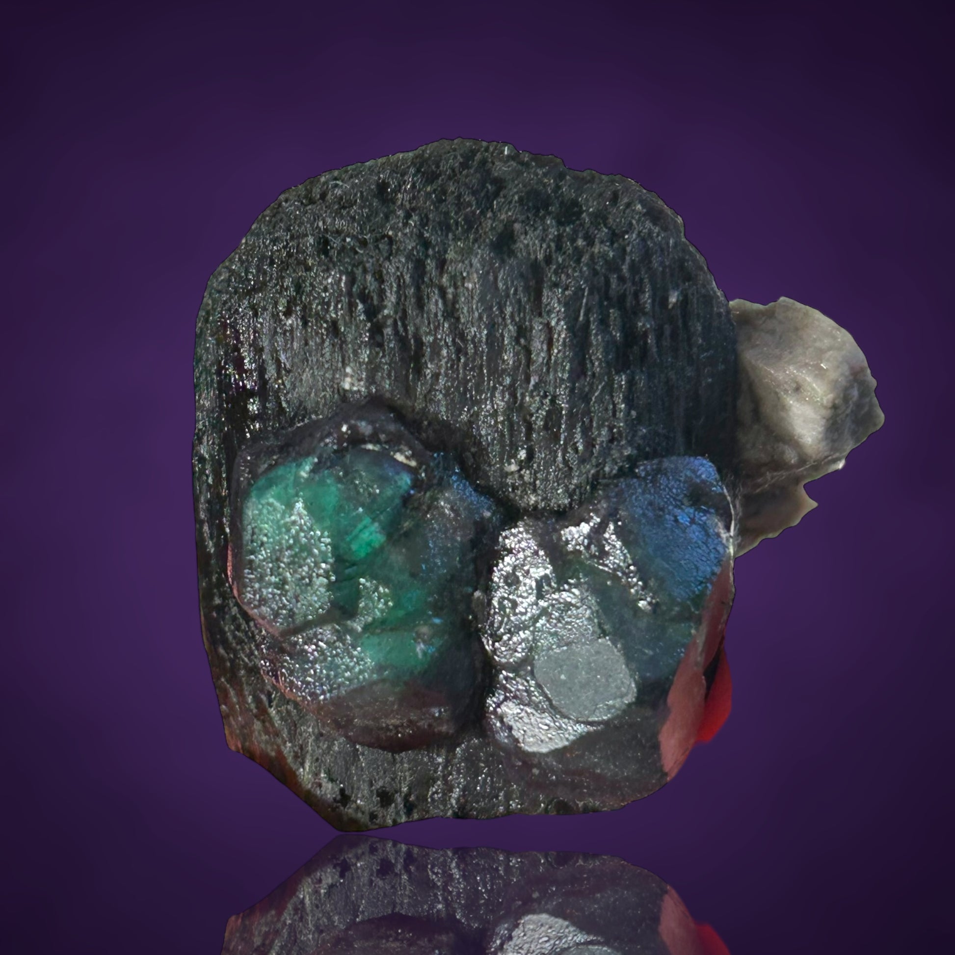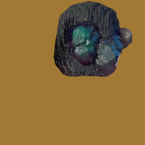 Dunkelgrüne Fluoritkristalle im Stil der bekannten „Alien Eyes“, die eine reiche Vielfalt gut entwickelter Kristallflächen aufweisen und ästhetisch auf Schörl-Turmalin aus der Erongo-Region in Namibia thronen.