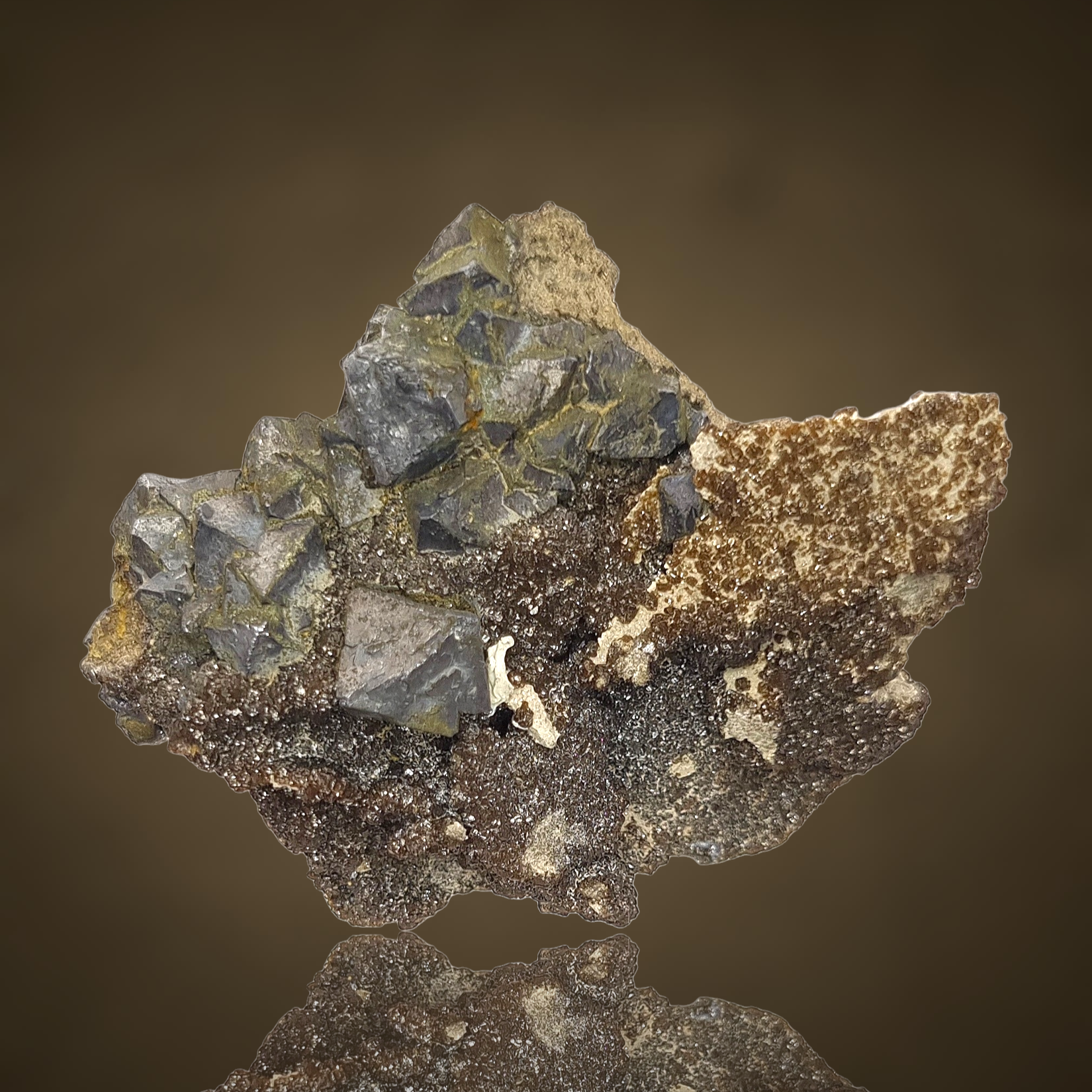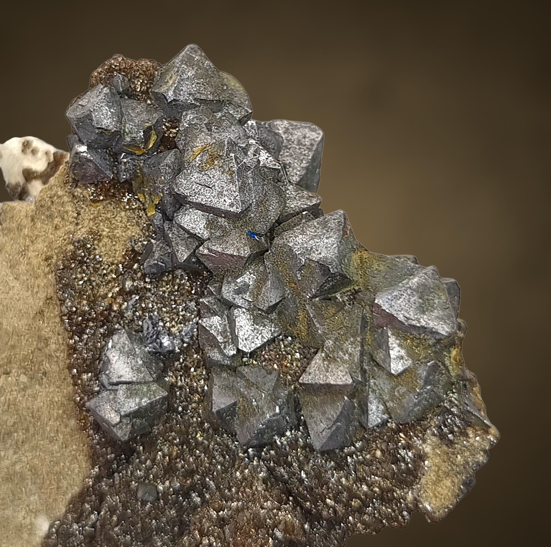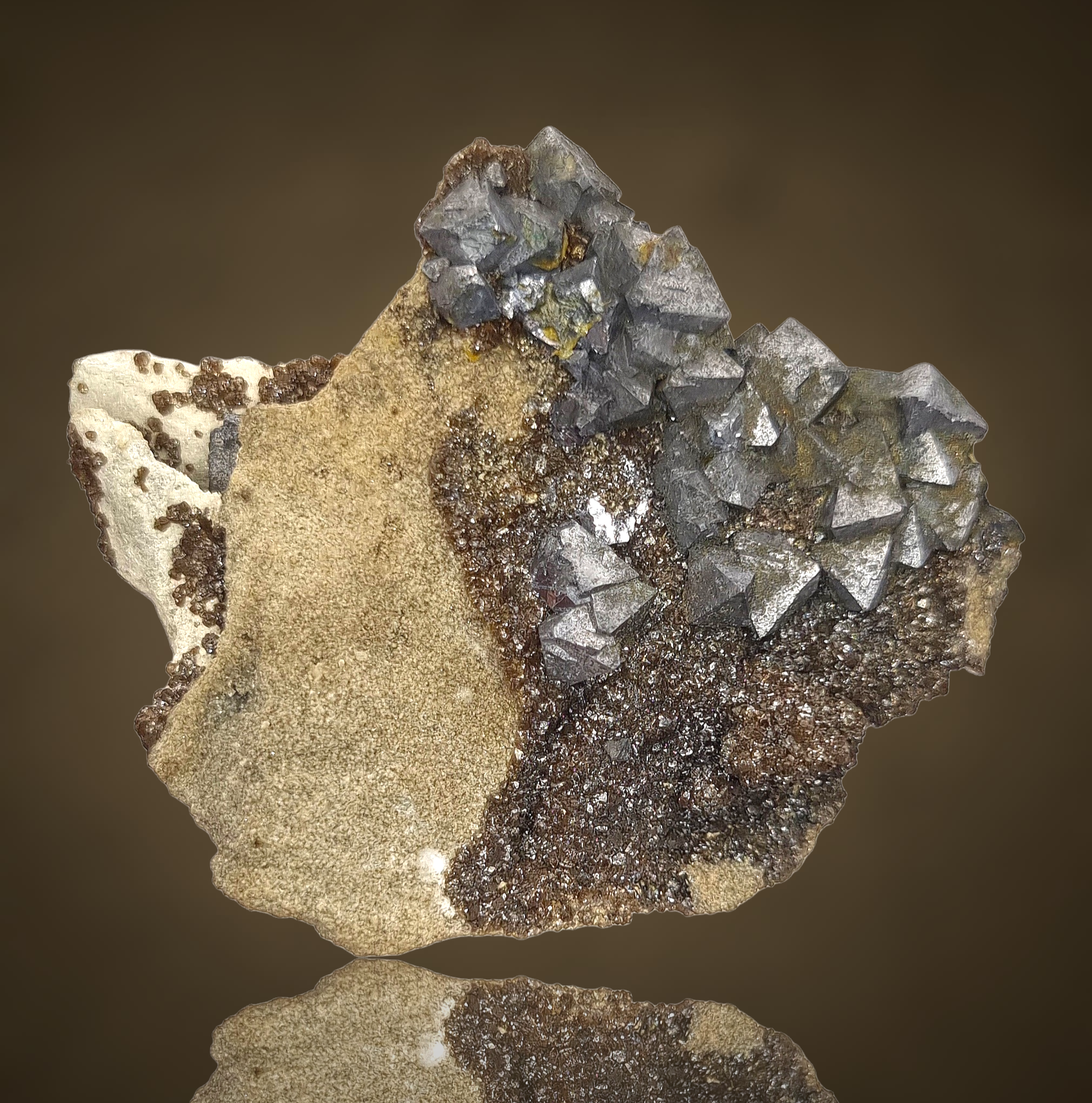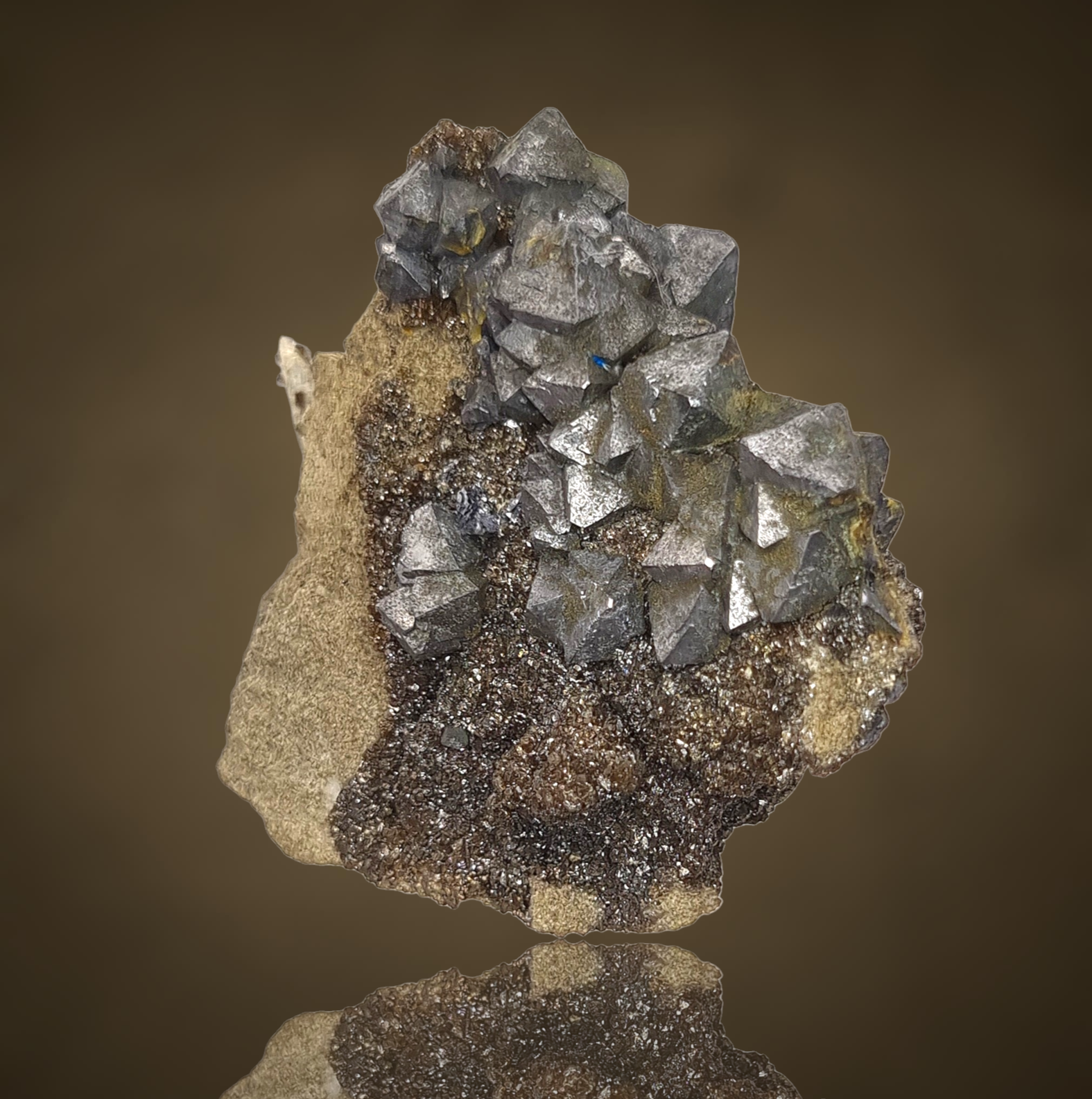 Fantastische Gruppe oktaedrischer Galenitkristalle mit sehr gut definierten Flächen und Kanten, einige mit Markasit bestäubt, auf einem Teppich aus winzigen braunen Sphaleritkügelchen auf Matrix aus der klassischen, aber weniger bekannten Pb-Zn-Lagerstätte in Polen.
