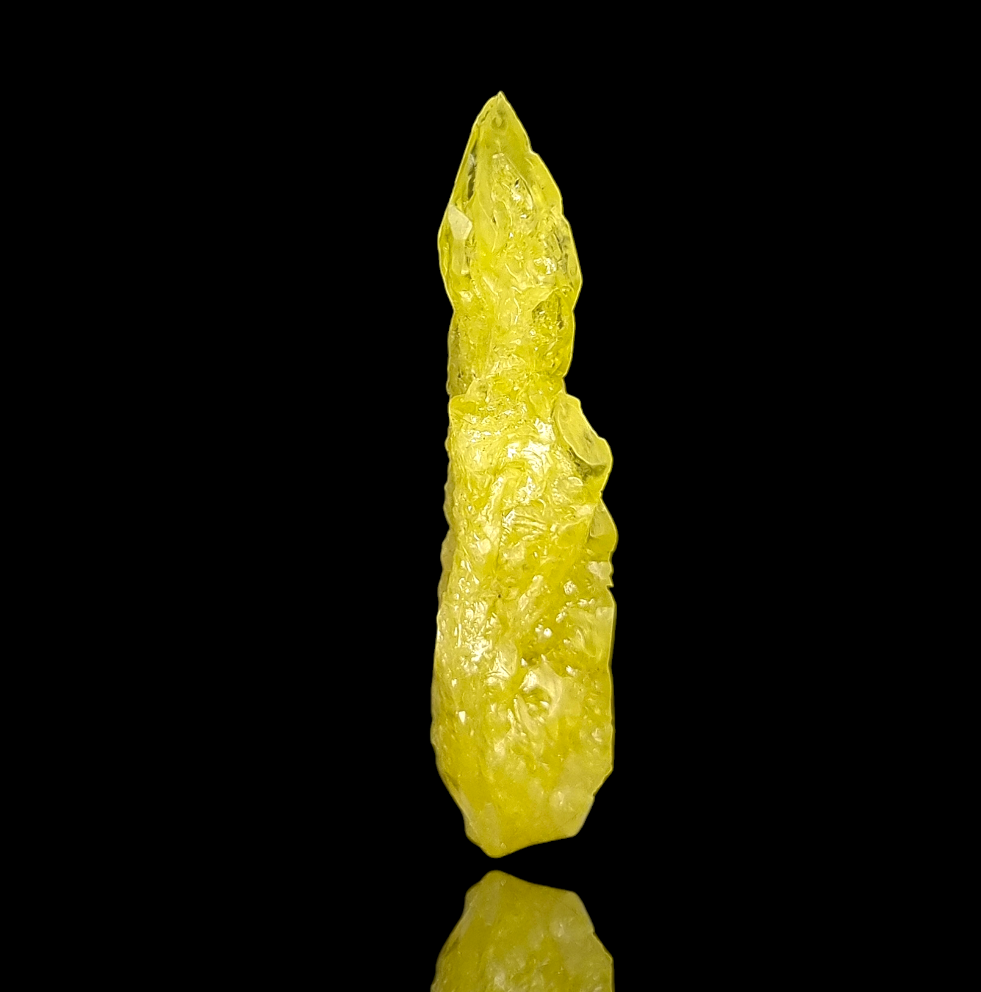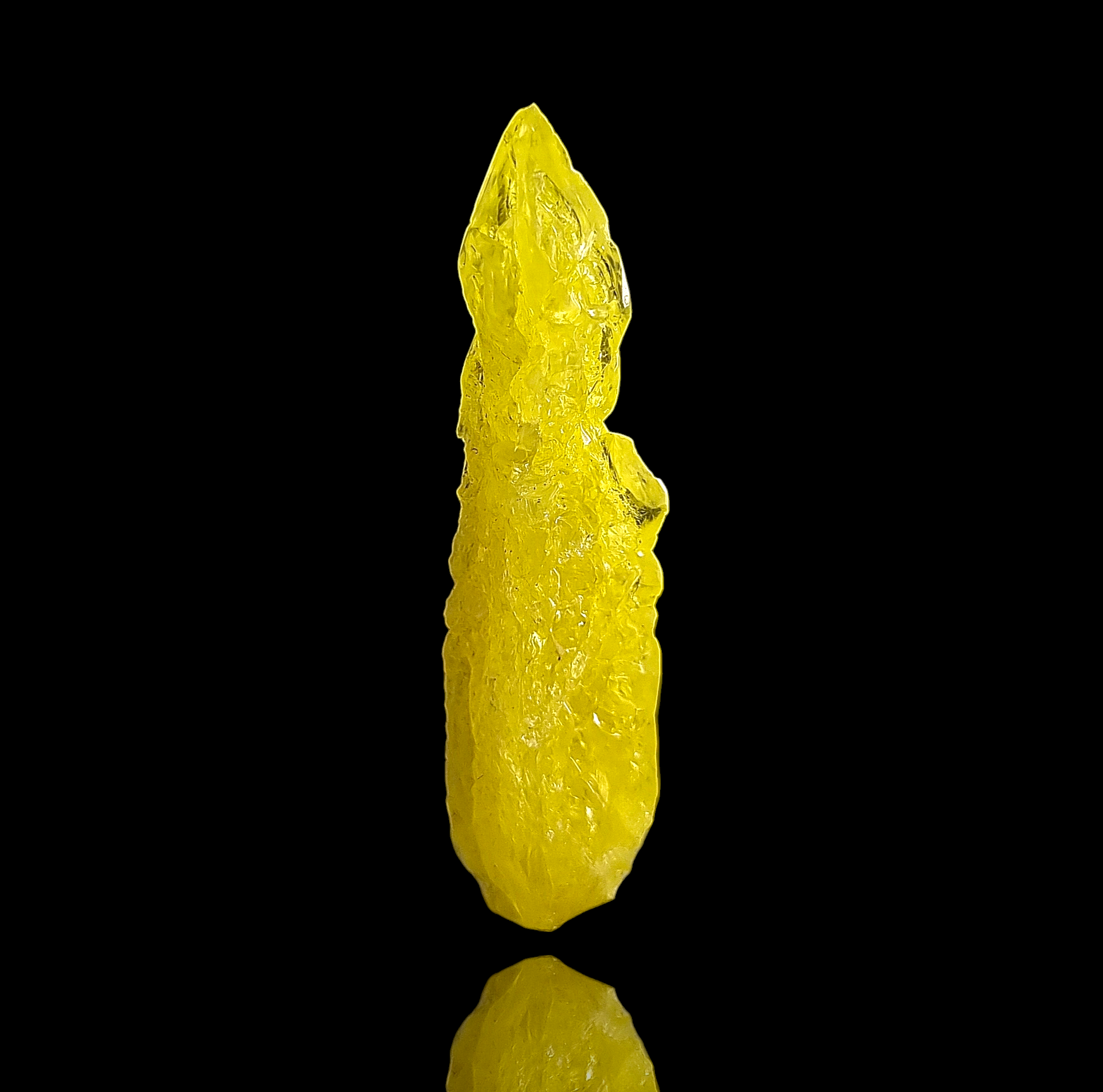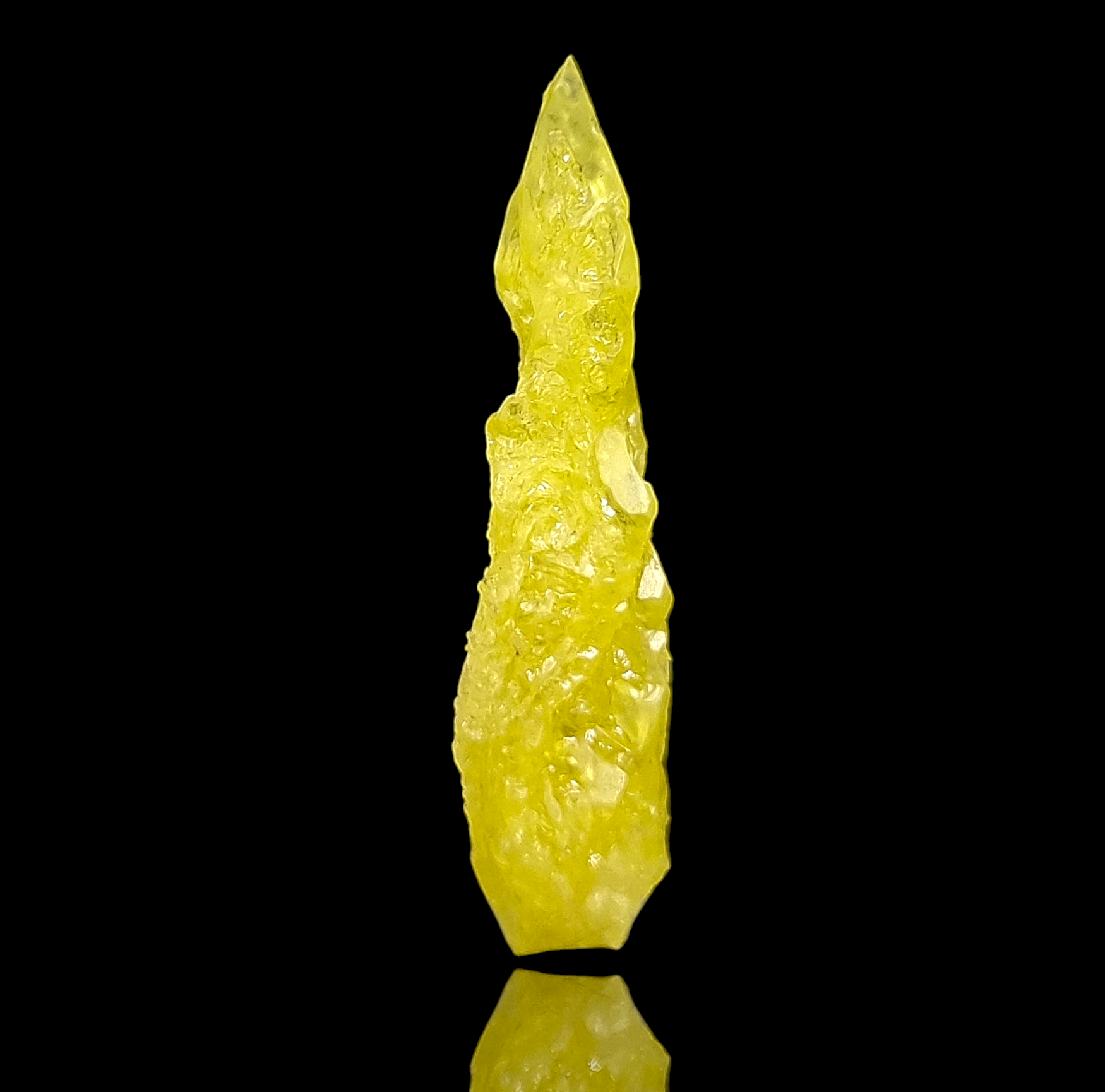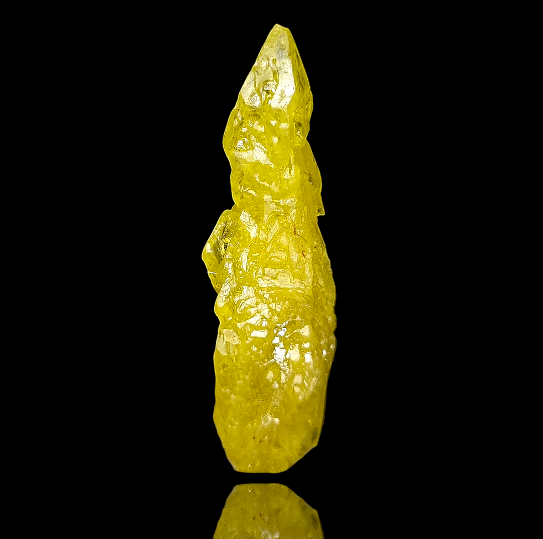 🇺🇲Intense lemon-yellow, shiny, spear-like floater crystal specimen of native sulphur from El Desierto, Bolivia, the locality producing the largest sulphur crystals worldwide apart from the mines on Sicily, Italy. The tip of the piece looks damaged but isn't. It shows the etched surface making it sparkle, absolutely characteristic for the locality.