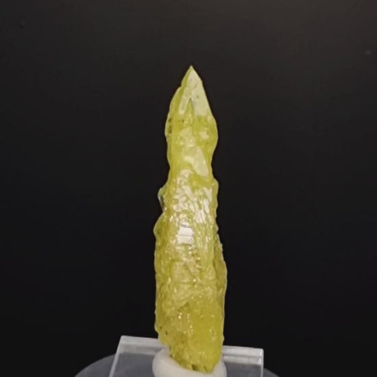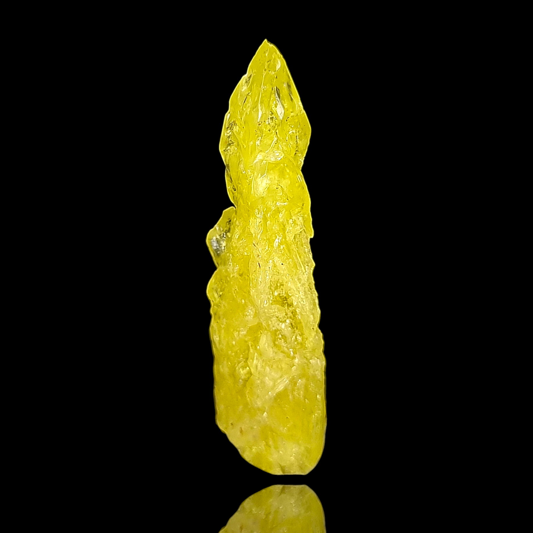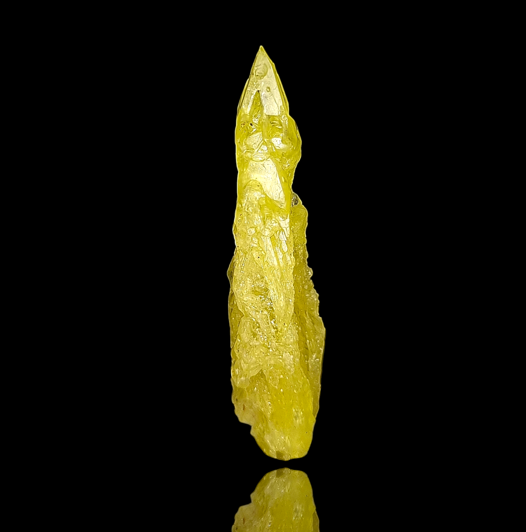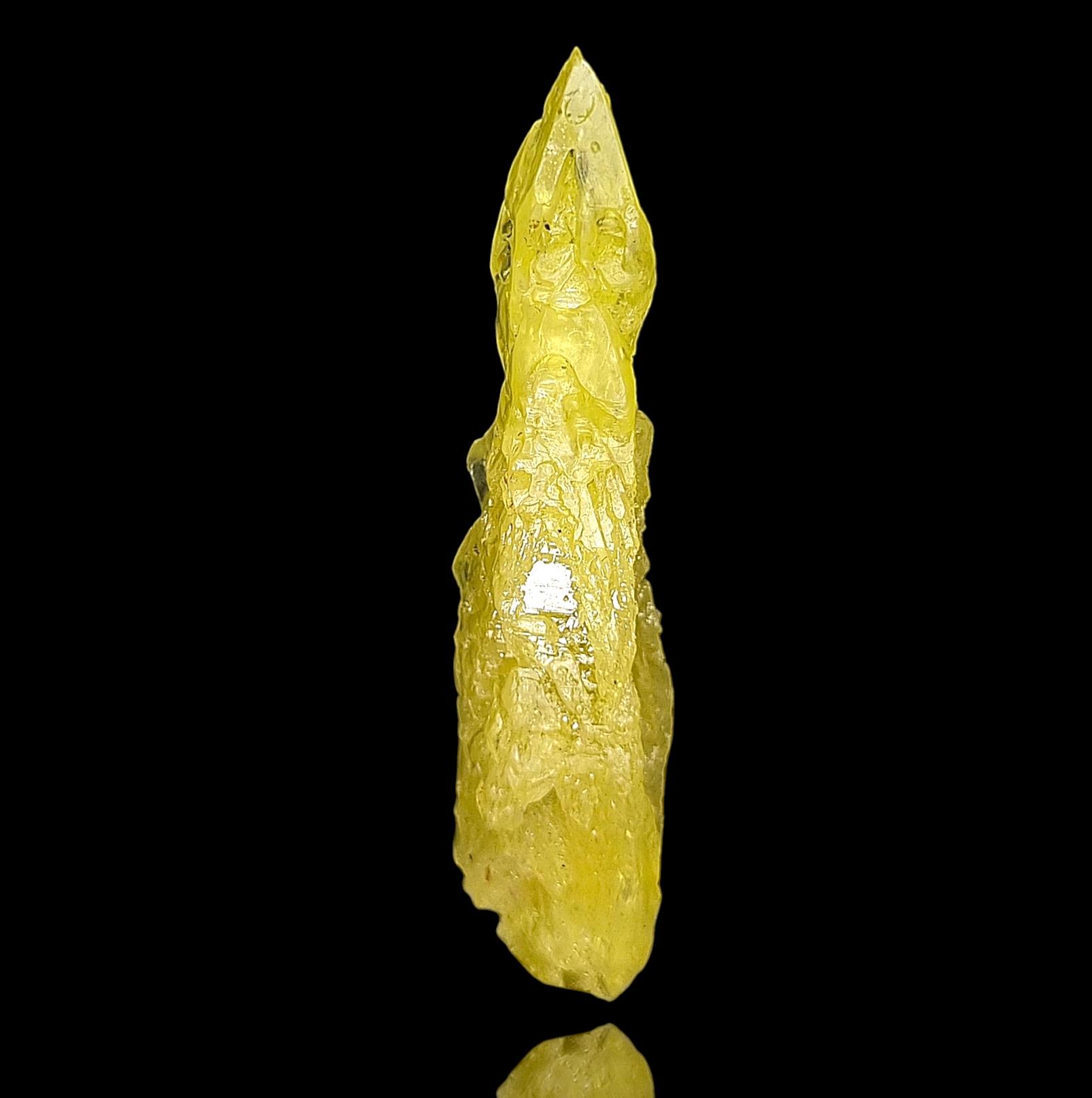🇺🇲Intense lemon-yellow, shiny, spear-like floater crystal specimen of native sulphur from El Desierto, Bolivia, the locality producing the largest sulphur crystals worldwide apart from the mines on Sicily, Italy. The tip of the piece looks damaged but isn't. It shows the etched surface making it sparkle, absolutely characteristic for the locality.