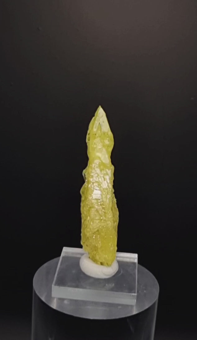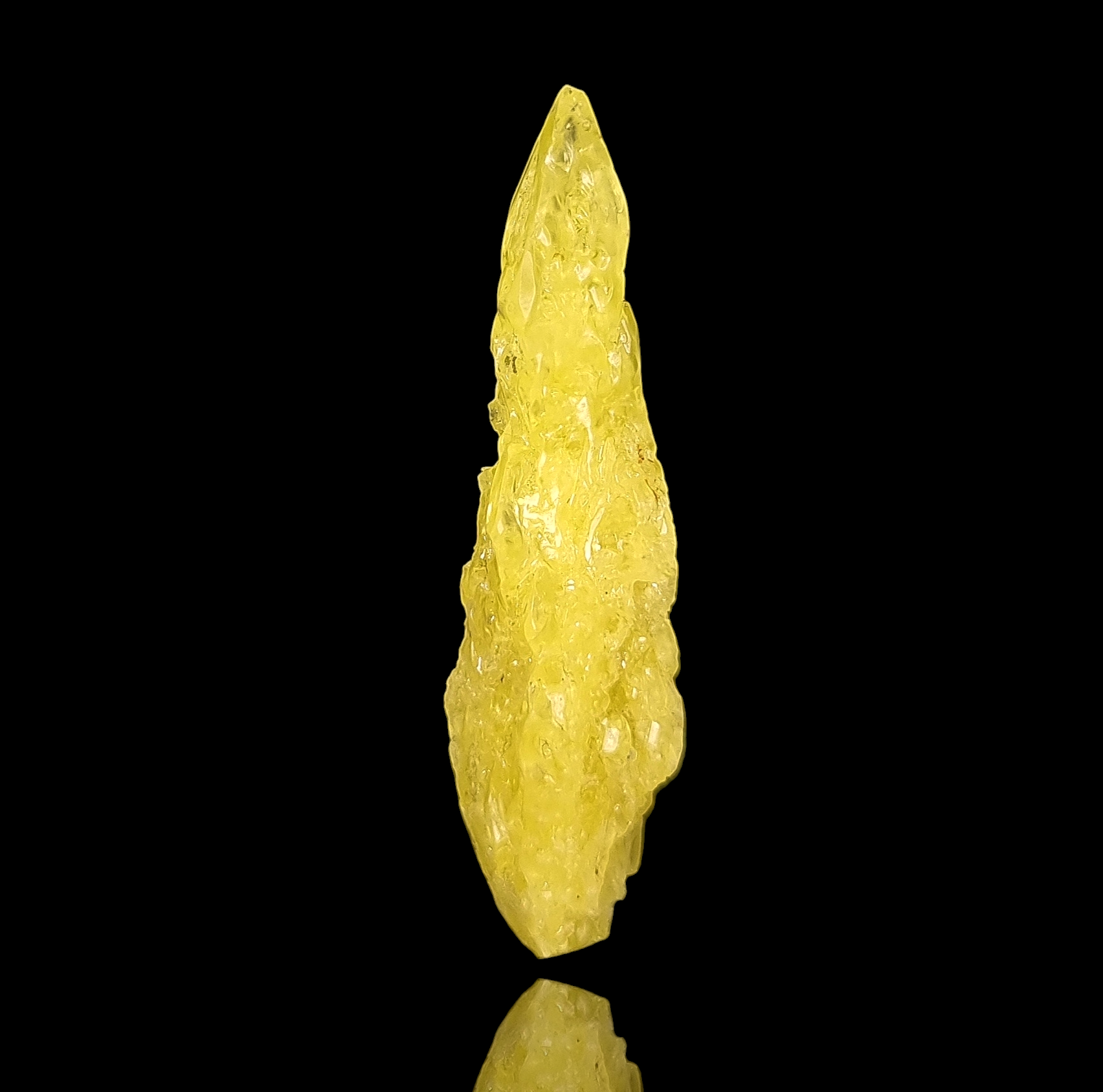 🇩🇪Intensiv zitronengelber, glänzender, speerförmiger Schwimmer-Kristall aus gediegenem Schwefel von El Desierto, Bolivien, dem Fundort, der neben den Minen auf Sizilien, Italien, die größten Schwefelkristalle der Welt produziert. Die Spitze des Stücks sieht beschädigt aus, ist es aber nicht. Sie zeigt die geätzte Oberfläche, die sie funkeln lässt, was für den Fundort absolut charakteristisch ist.