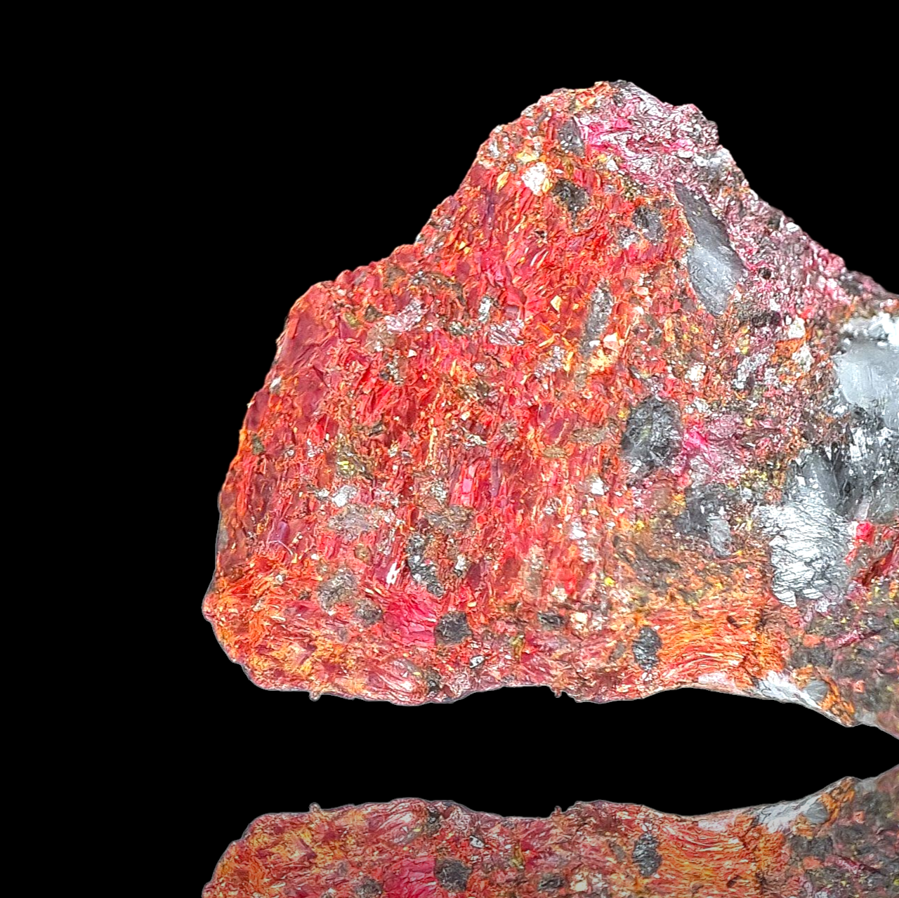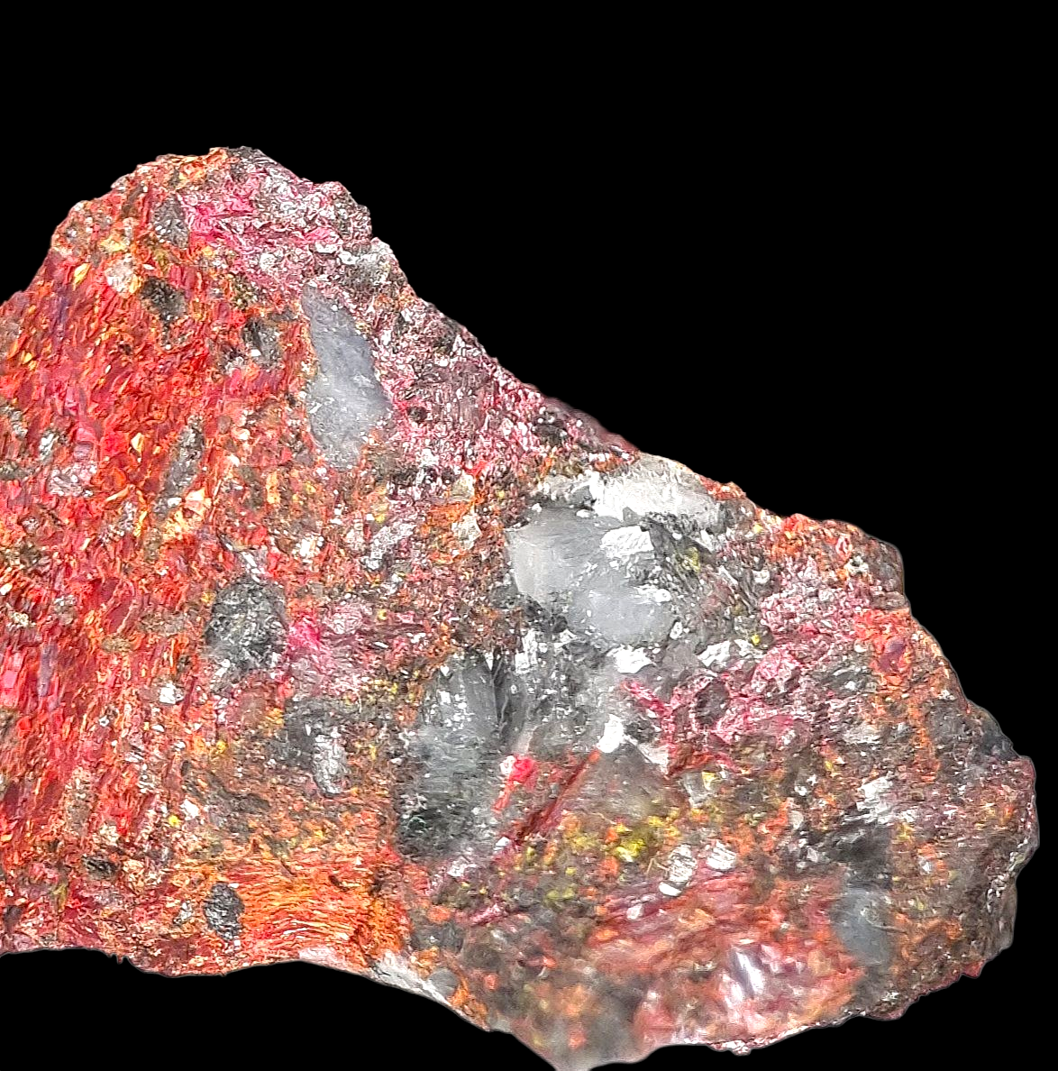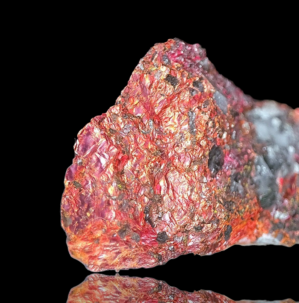 🇬🇧Bright red getchellite showing great cleavage together with dark red cinnabar in quartz from the Sb-Hg deposit of Khaidarkan, a noticeable occurence of the rare mineral. It shimmers beautifully when you move it back and forth.