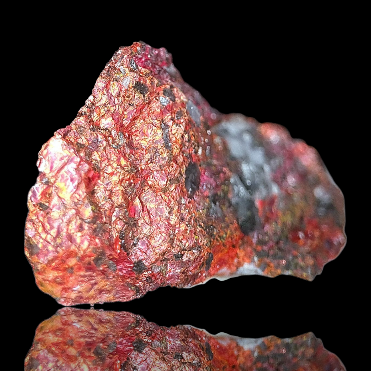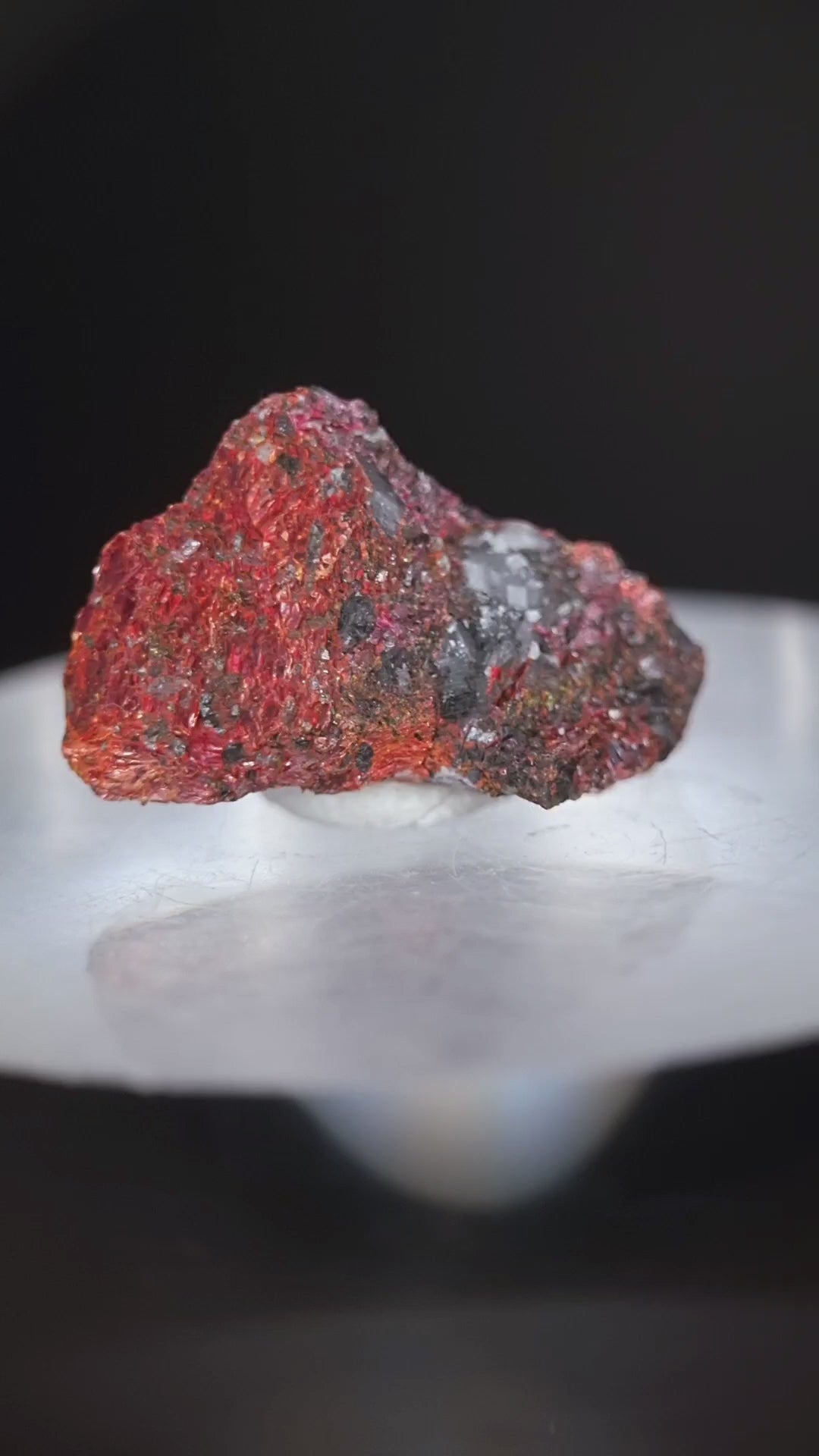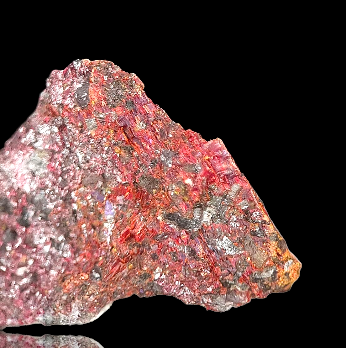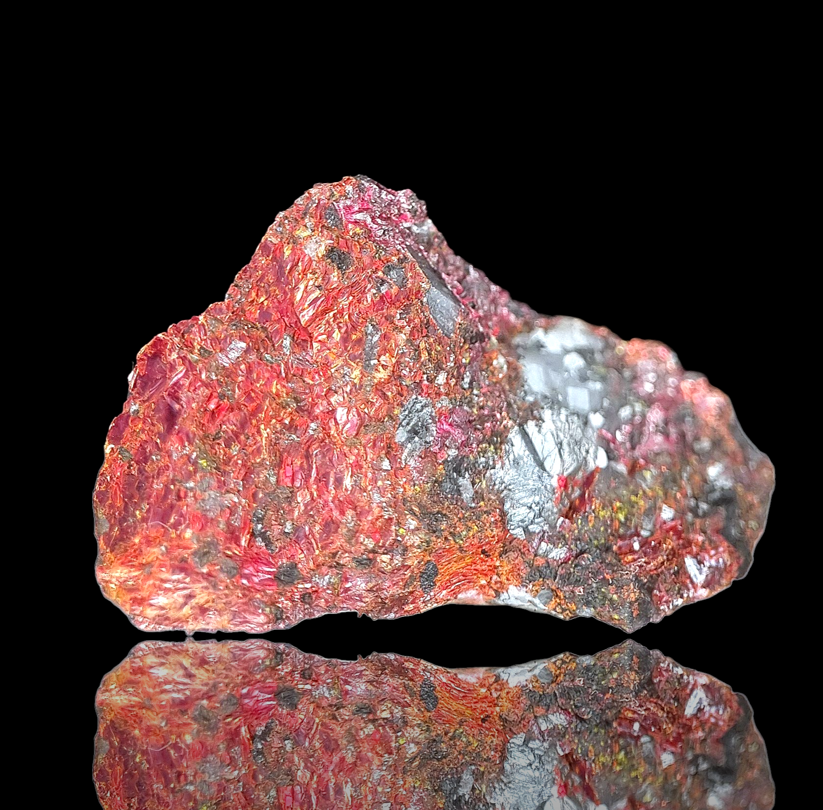 🇬🇧Bright red getchellite showing great cleavage together with dark red cinnabar in quartz from the Sb-Hg deposit of Khaidarkan, a noticeable occurence of the rare mineral. It shimmers beautifully when you move it back and forth.