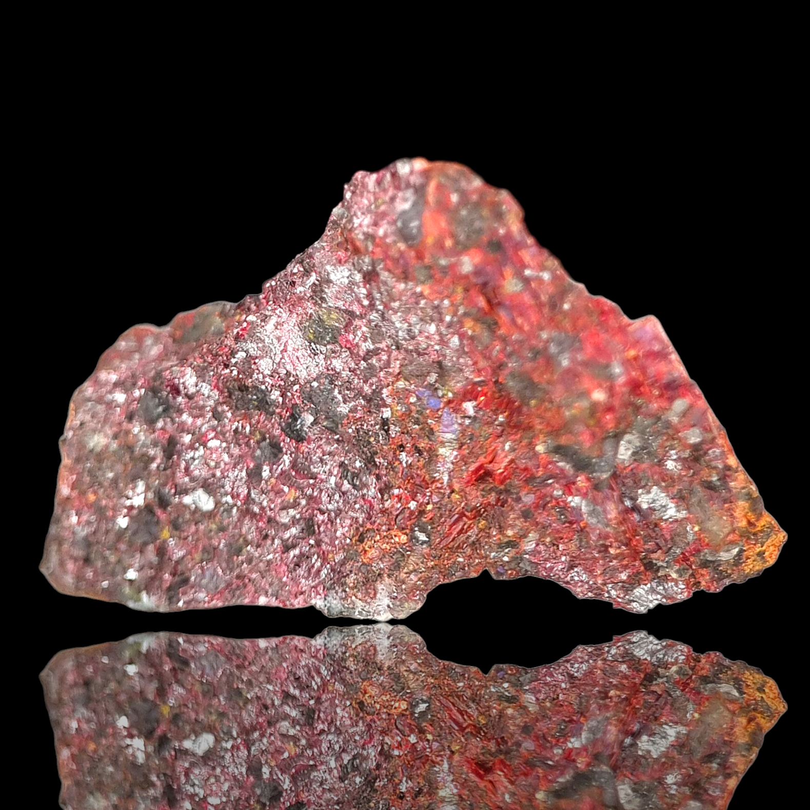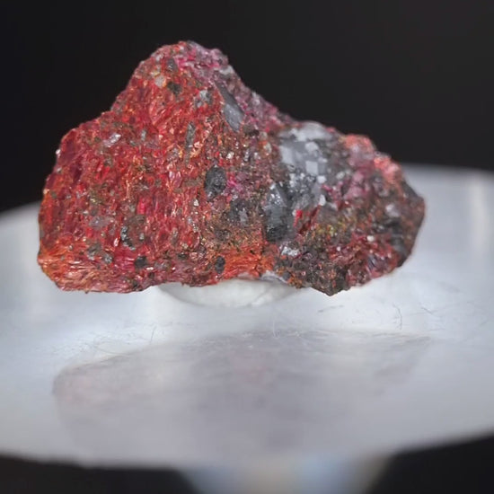 🇩🇪Leuchtend roter Getchellit mit ausgeprägter Spaltbarkeit zusammen mit dunkelrotem Zinnober in Quarz aus der Sb-Hg-Lagerstätte von Khaidarkan, einem bedeutenden Vorkommen des seltenen Minerals. Er schimmert wunderschön, wenn man ihn hin und her bewegt.