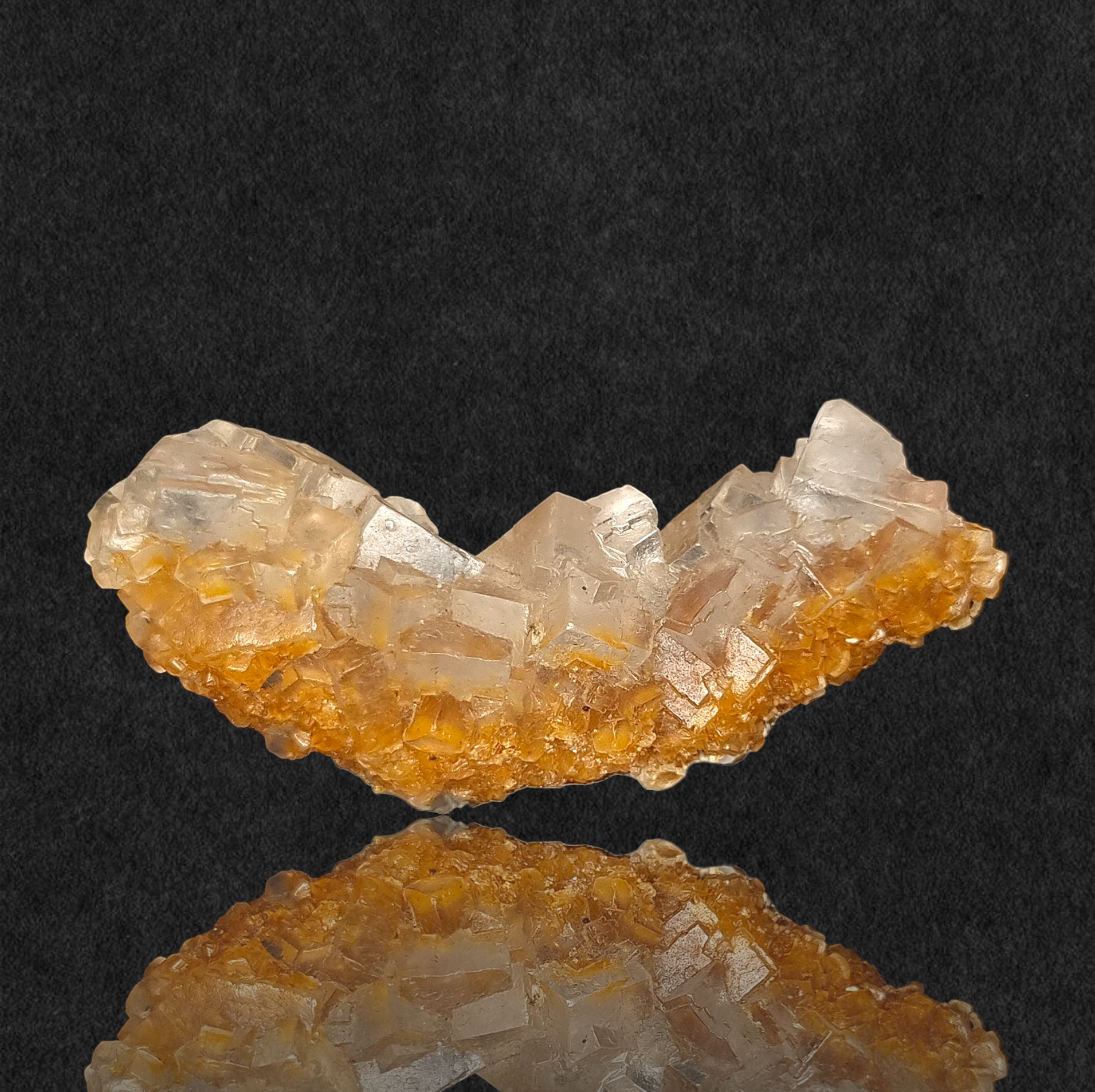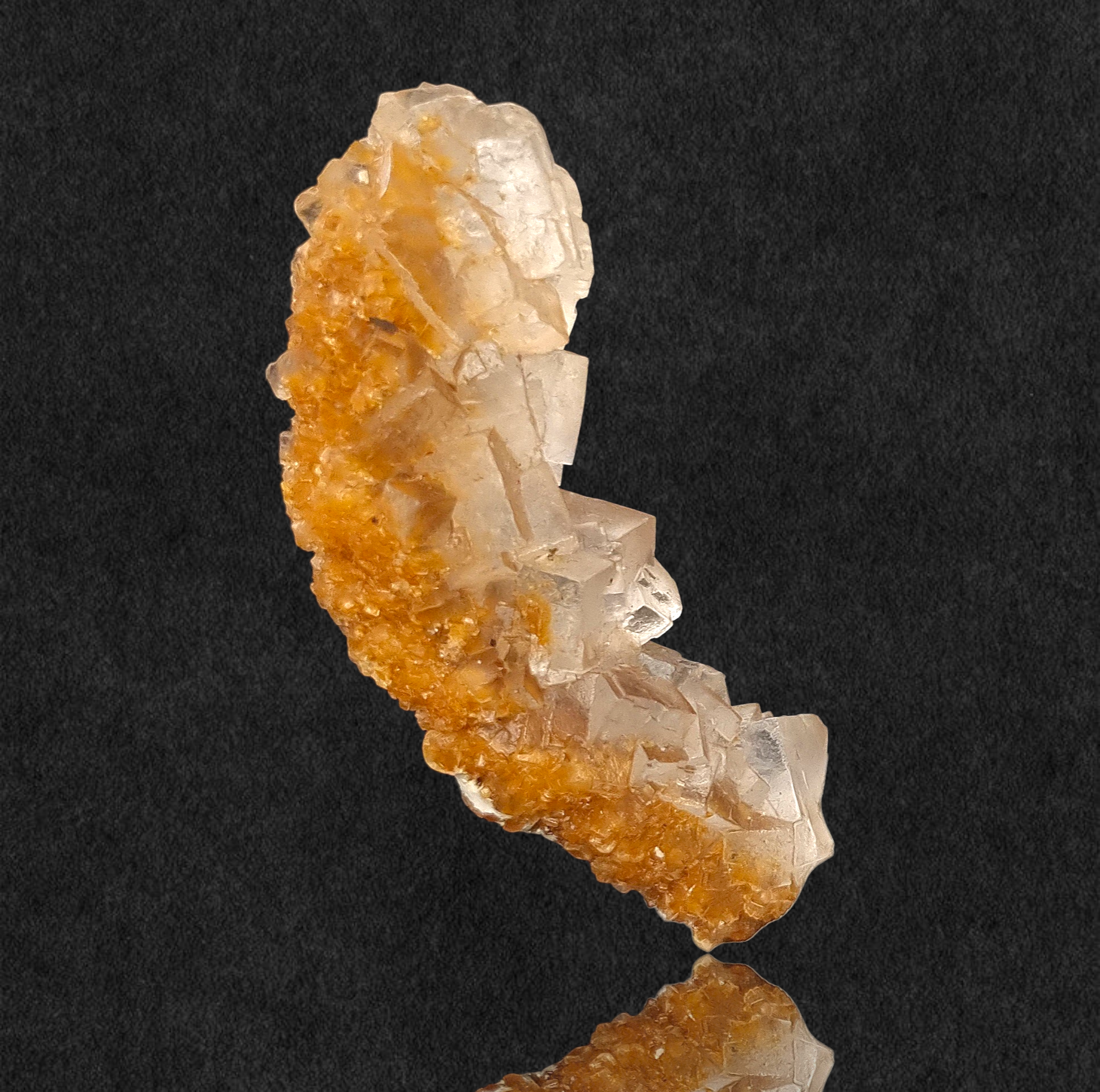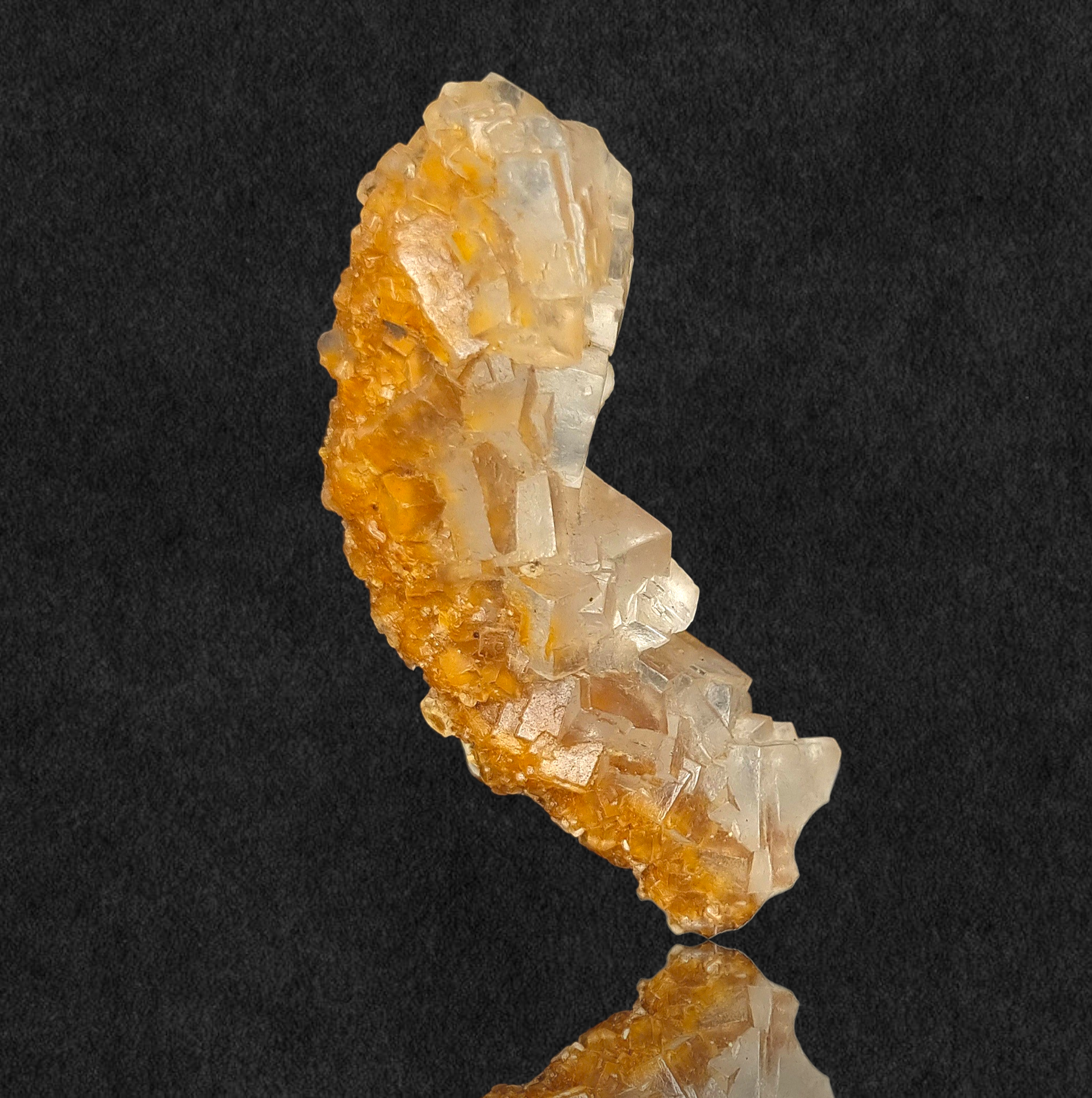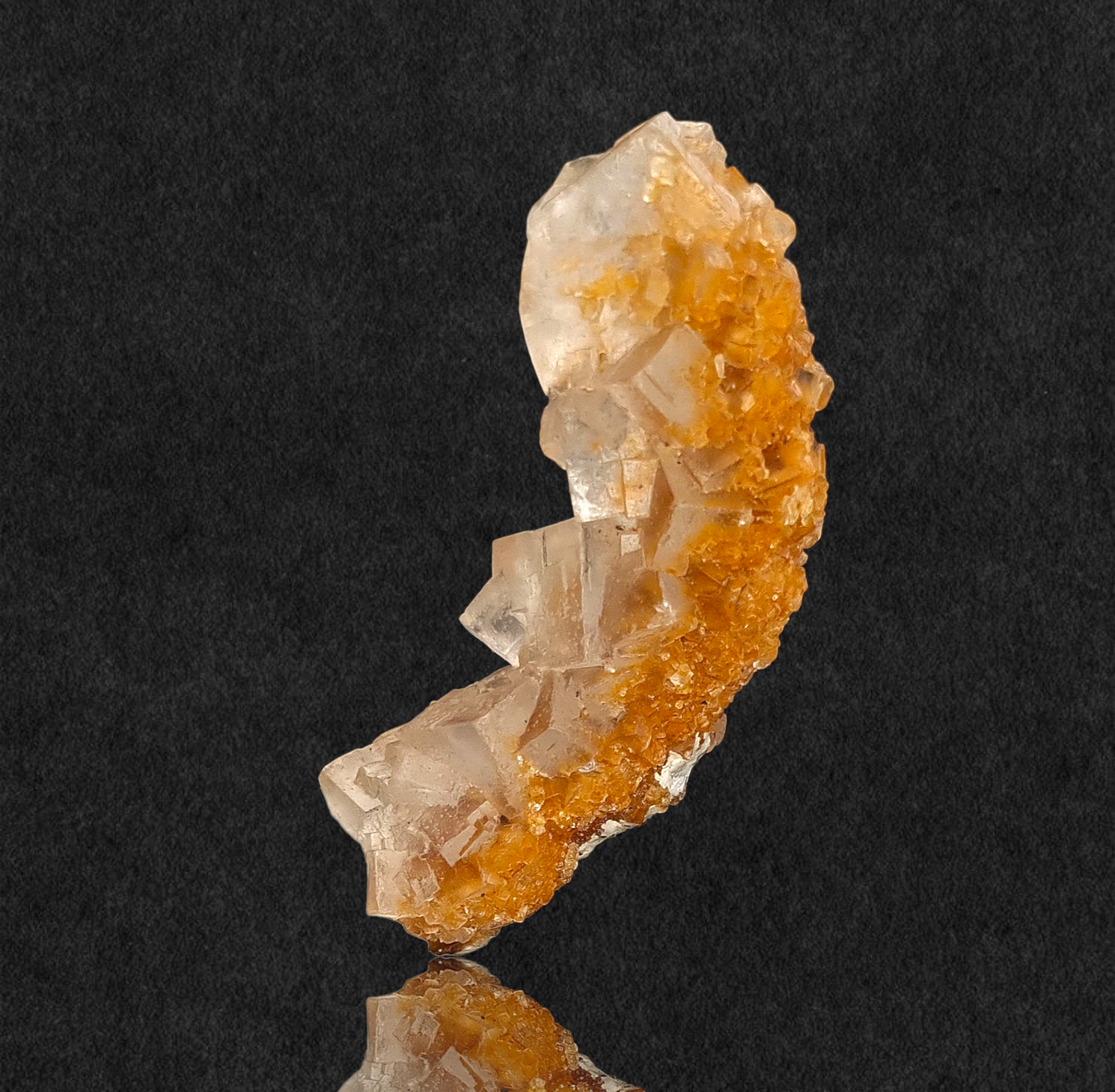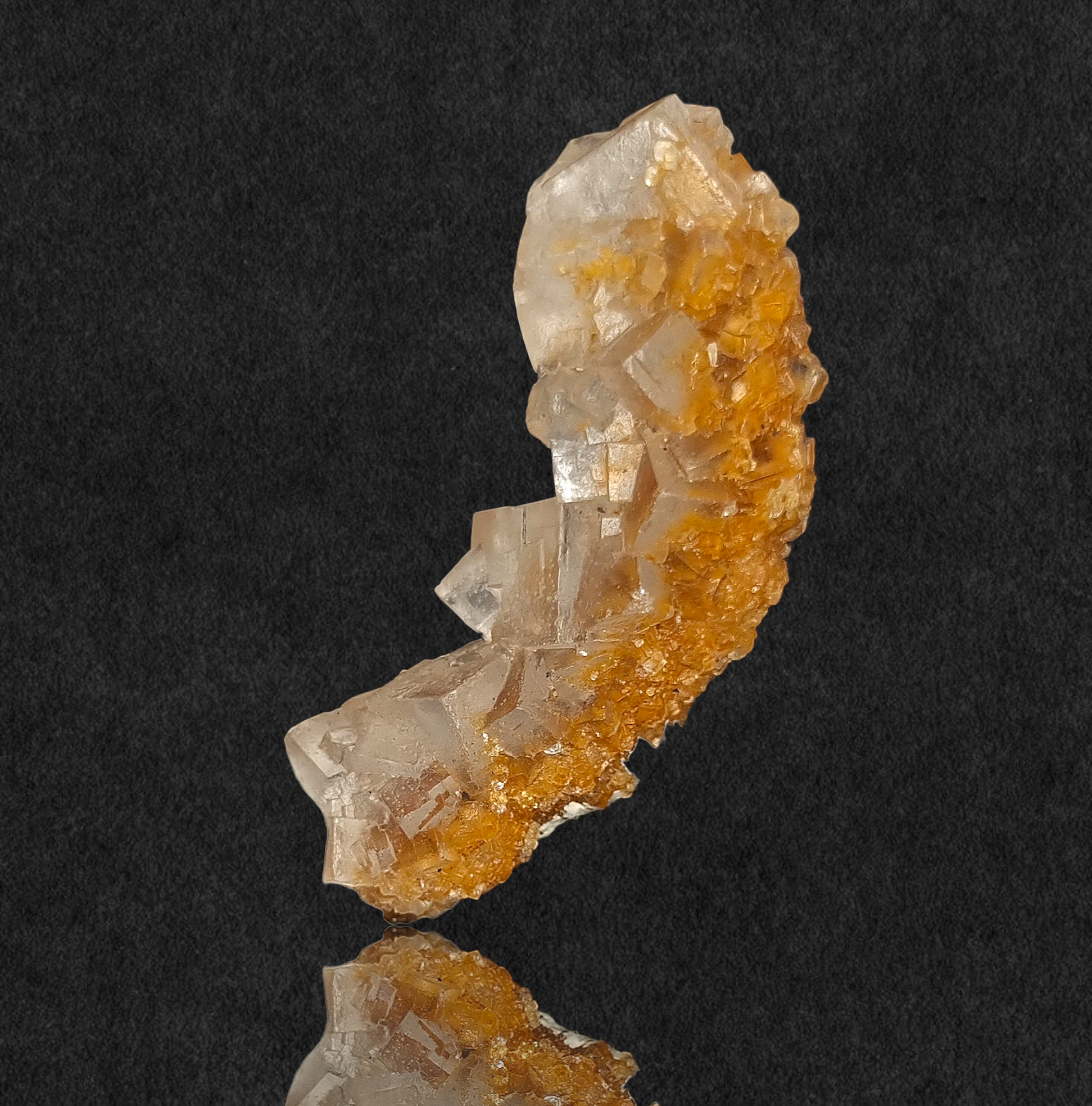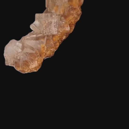 Faszinierender Halit aus der bekannten deutschen Kalilagerstätte, die für ihre zahlreichen Typlokalitäten und vielfältigen Halitformationen berühmt ist. Diese Gruppe aus wasserklaren, glänzenden Würfeln, die als Faden gewachsen sind, hat eine auffallende Kurve und stellt ein einzigartiges Sammlerstück dar.