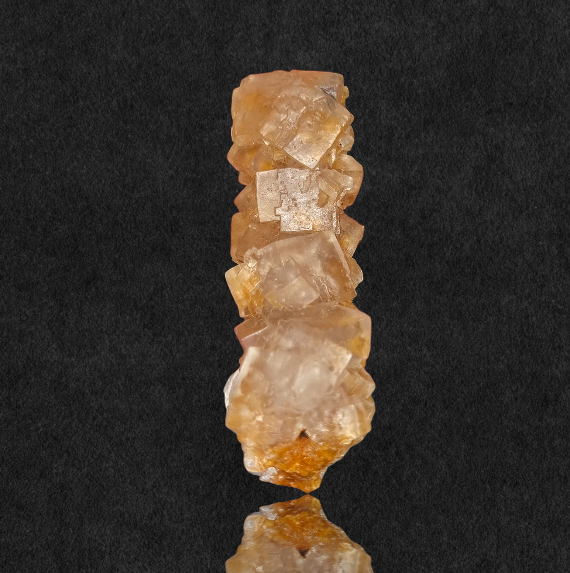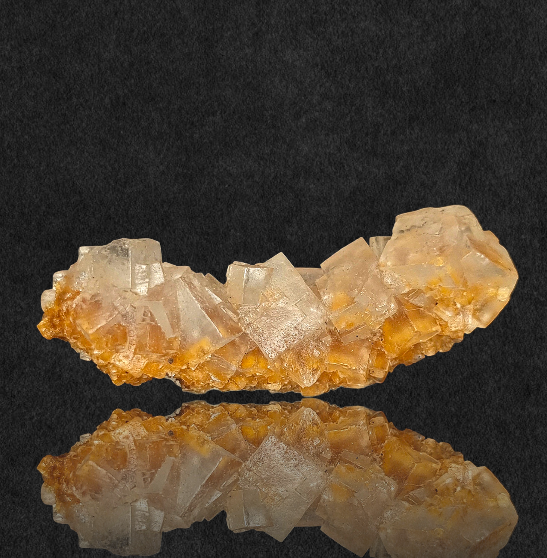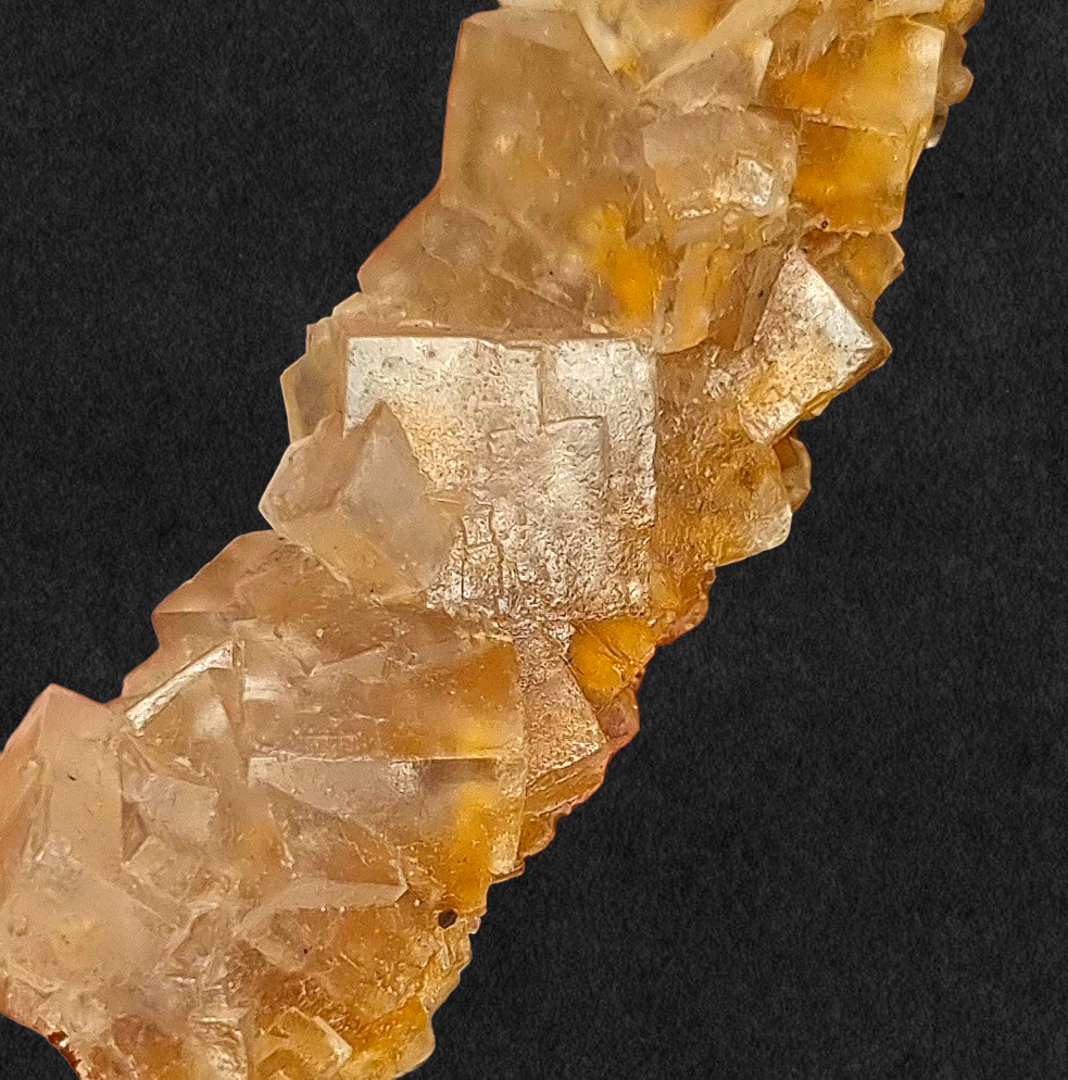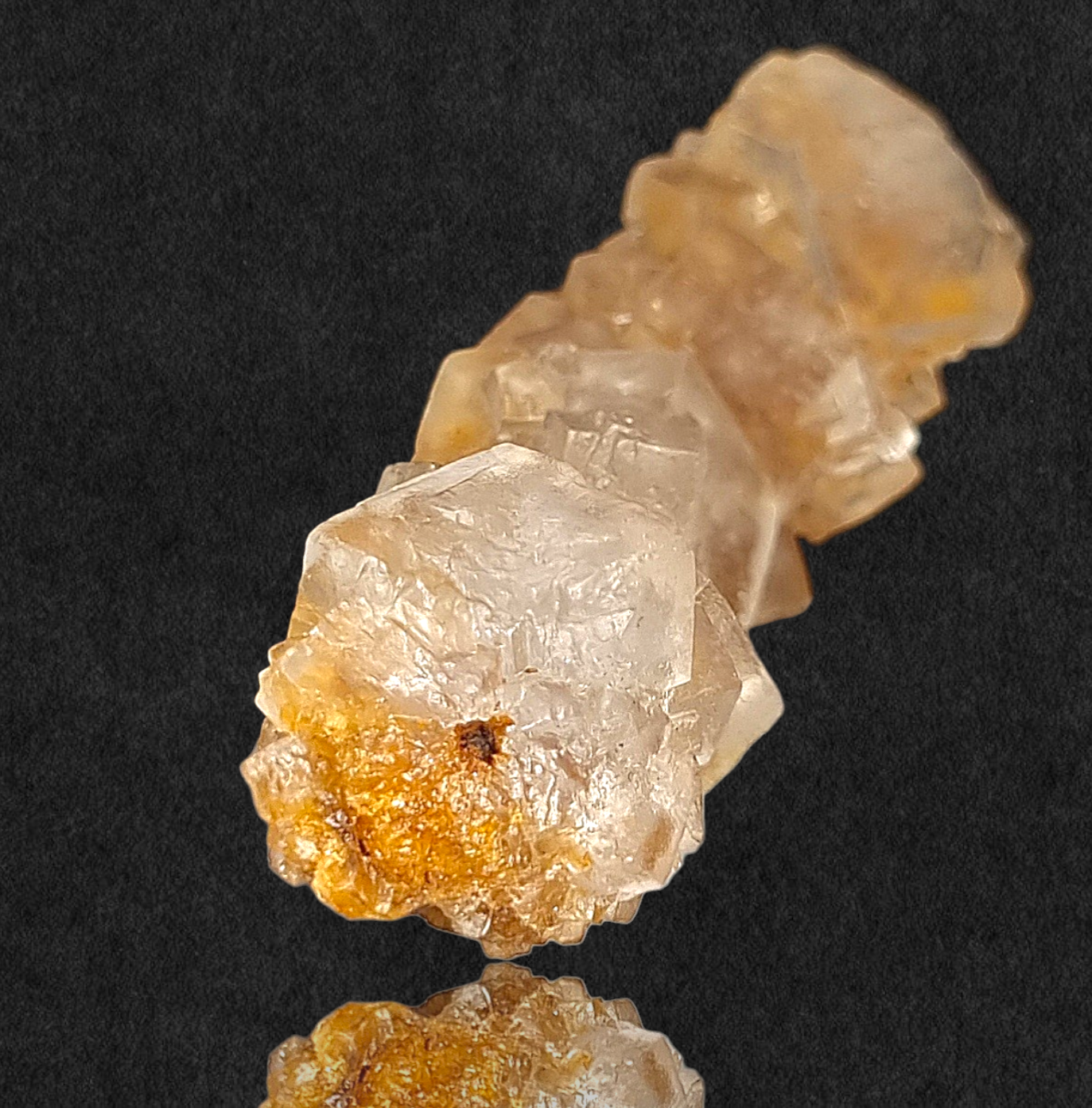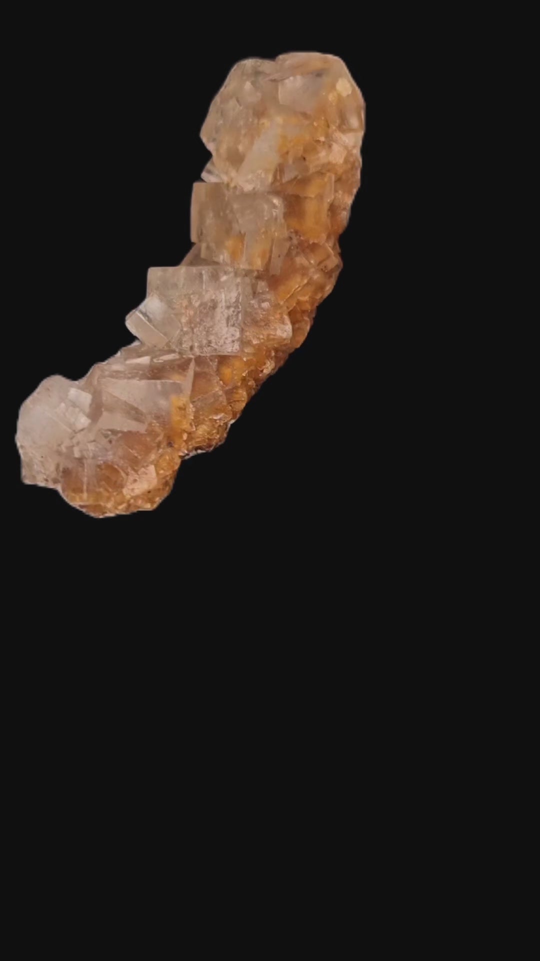 Faszinierender Halit aus der bekannten deutschen Kalilagerstätte, die für ihre zahlreichen Typlokalitäten und vielfältigen Halitformationen berühmt ist. Diese Gruppe aus wasserklaren, glänzenden Würfeln, die als Faden gewachsen sind, hat eine auffallende Kurve und stellt ein einzigartiges Sammlerstück dar.