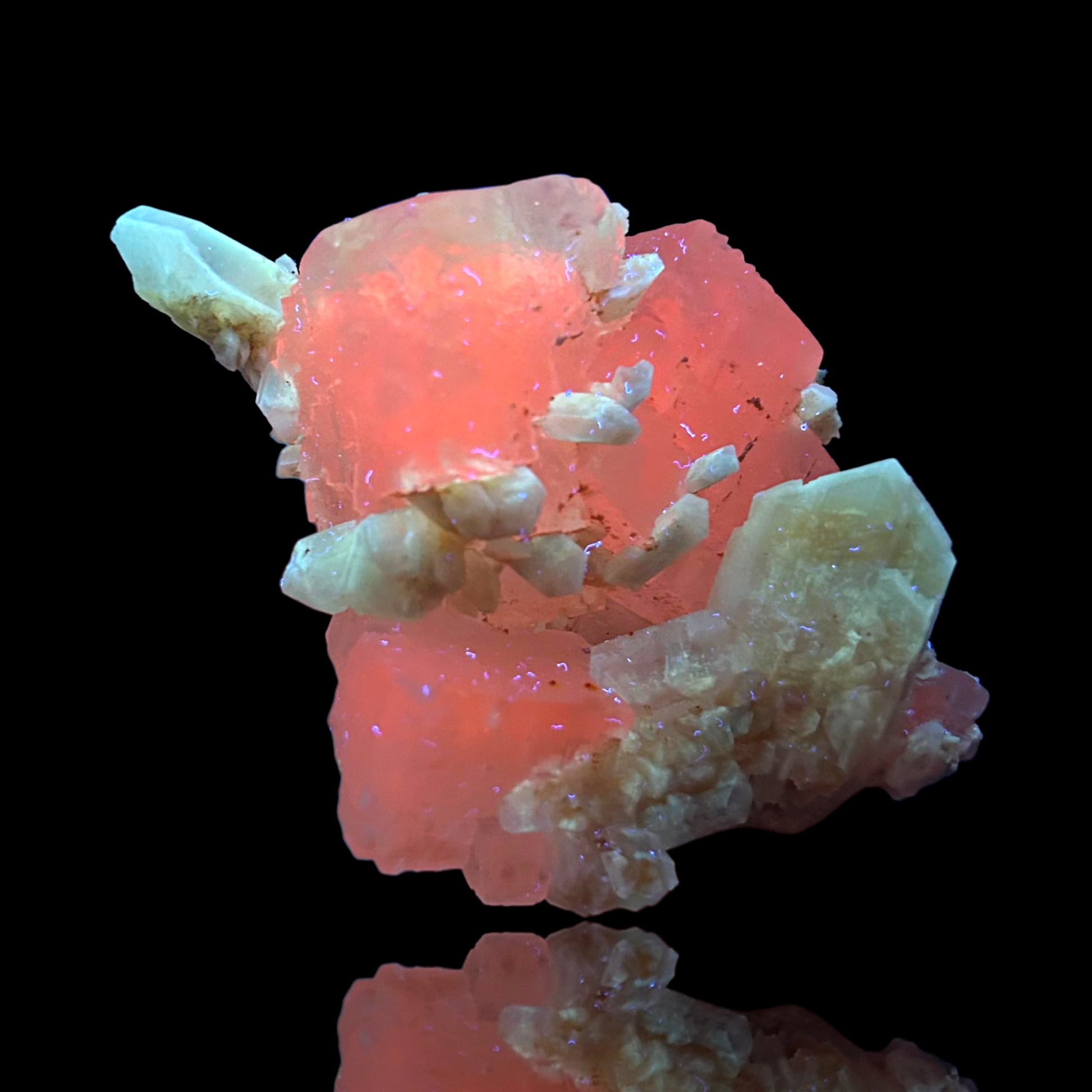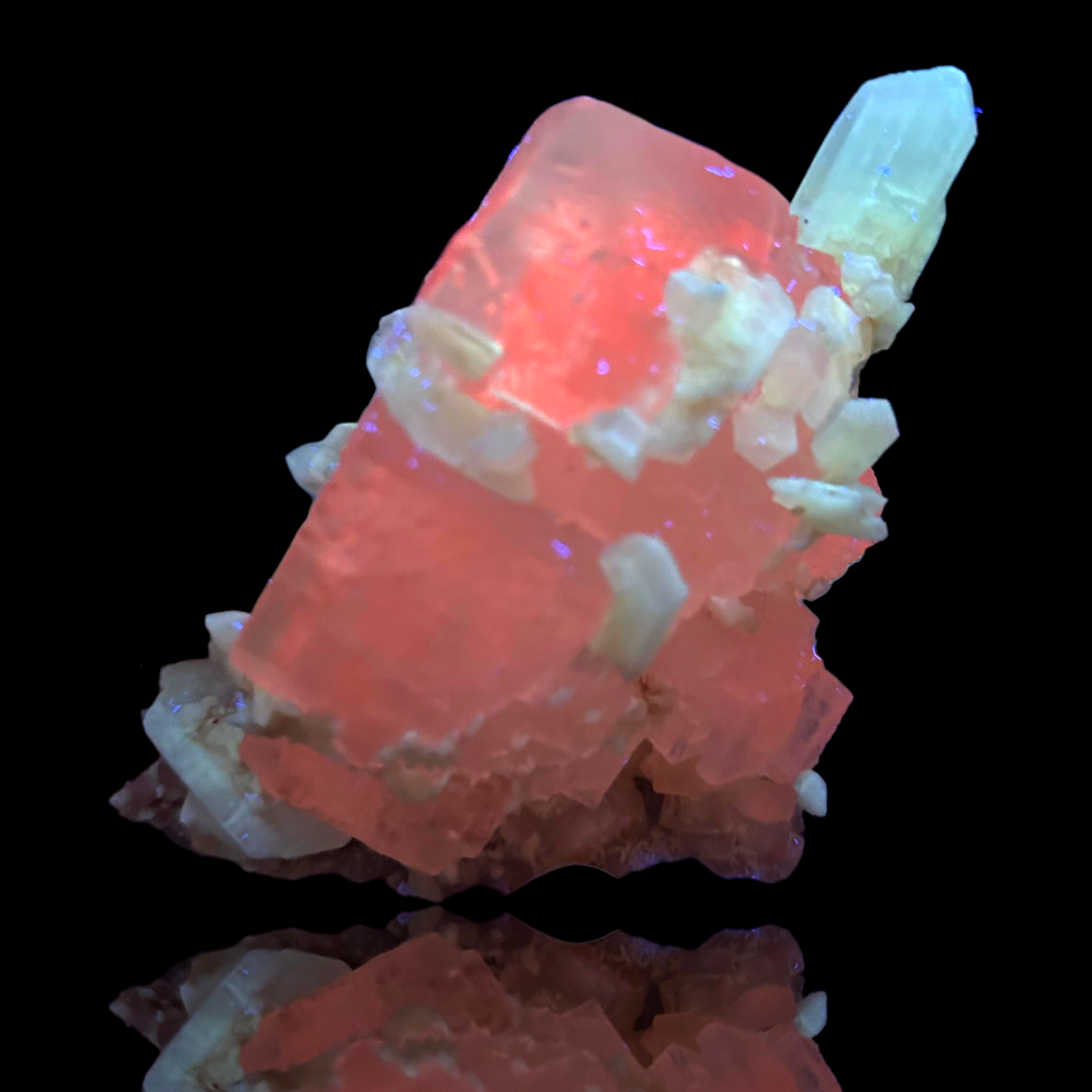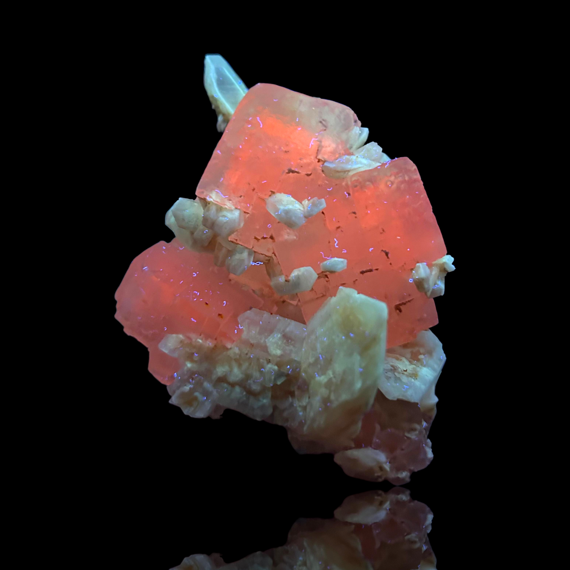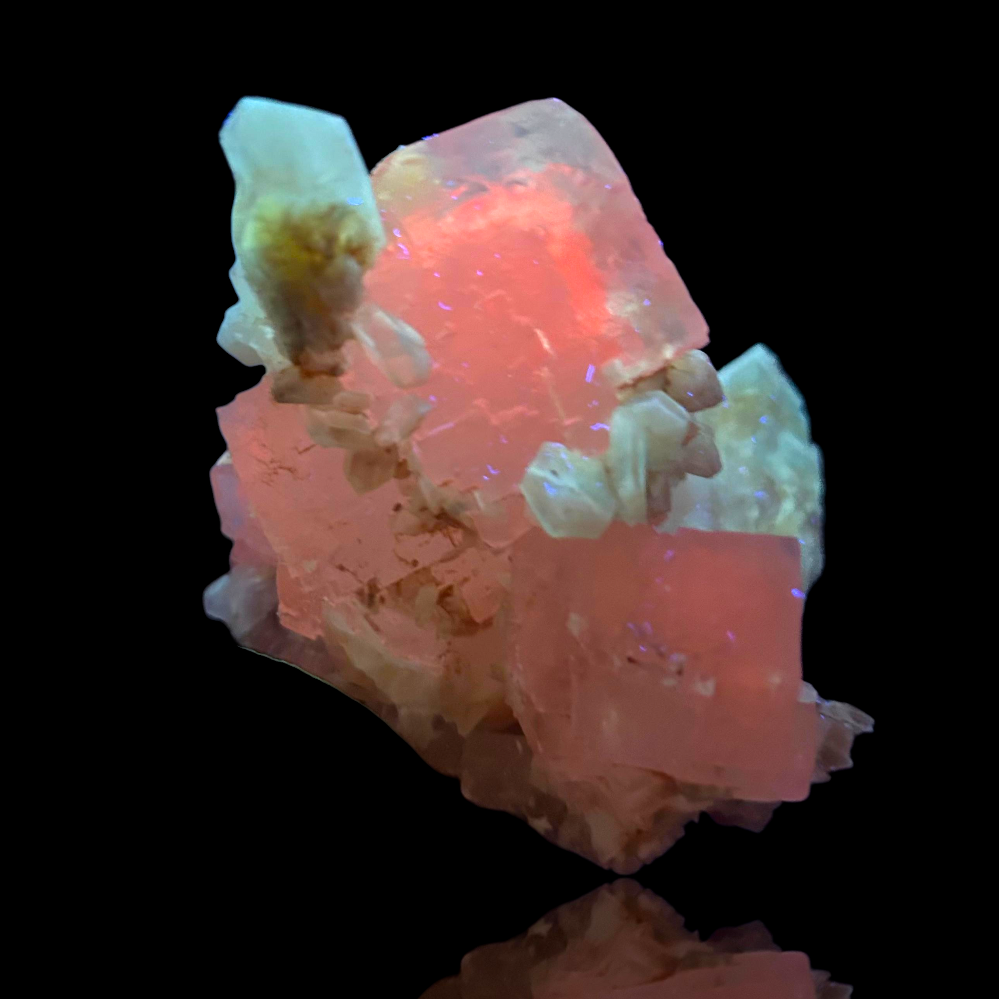 Mangangehalte im Halit verursachen unter UV-Licht eine intensive rot-orange Fluoreszenz, die durch die honigfarbenen Gips-Kristalle auf der Halit-Matrix noch verstärkt wird. Dadurch sind diese seltenen Stufen aus der versiegelten Kristallkammer bei Sammlern sehr begehrt.