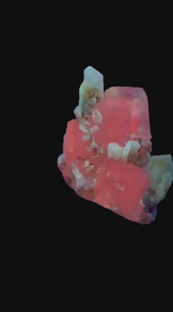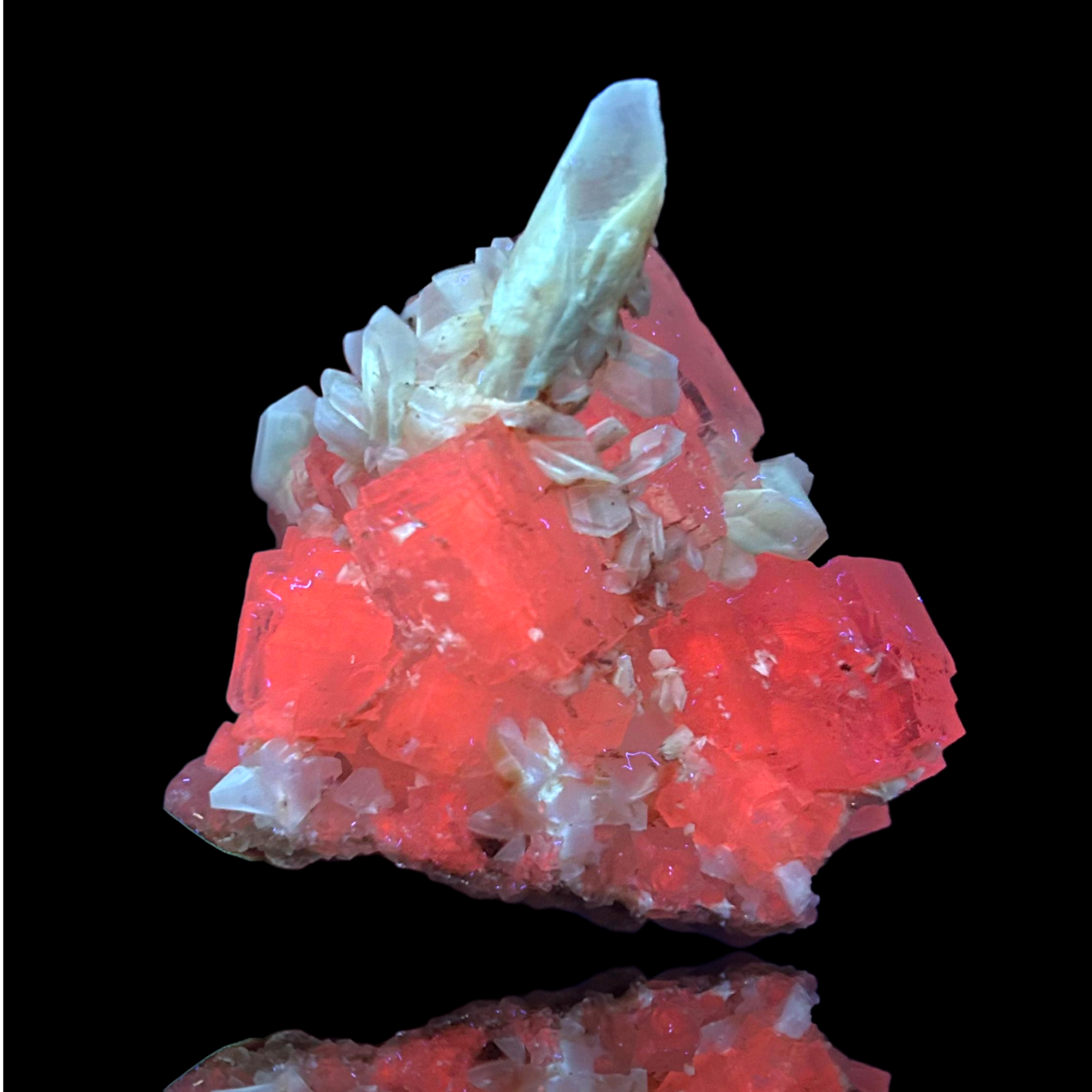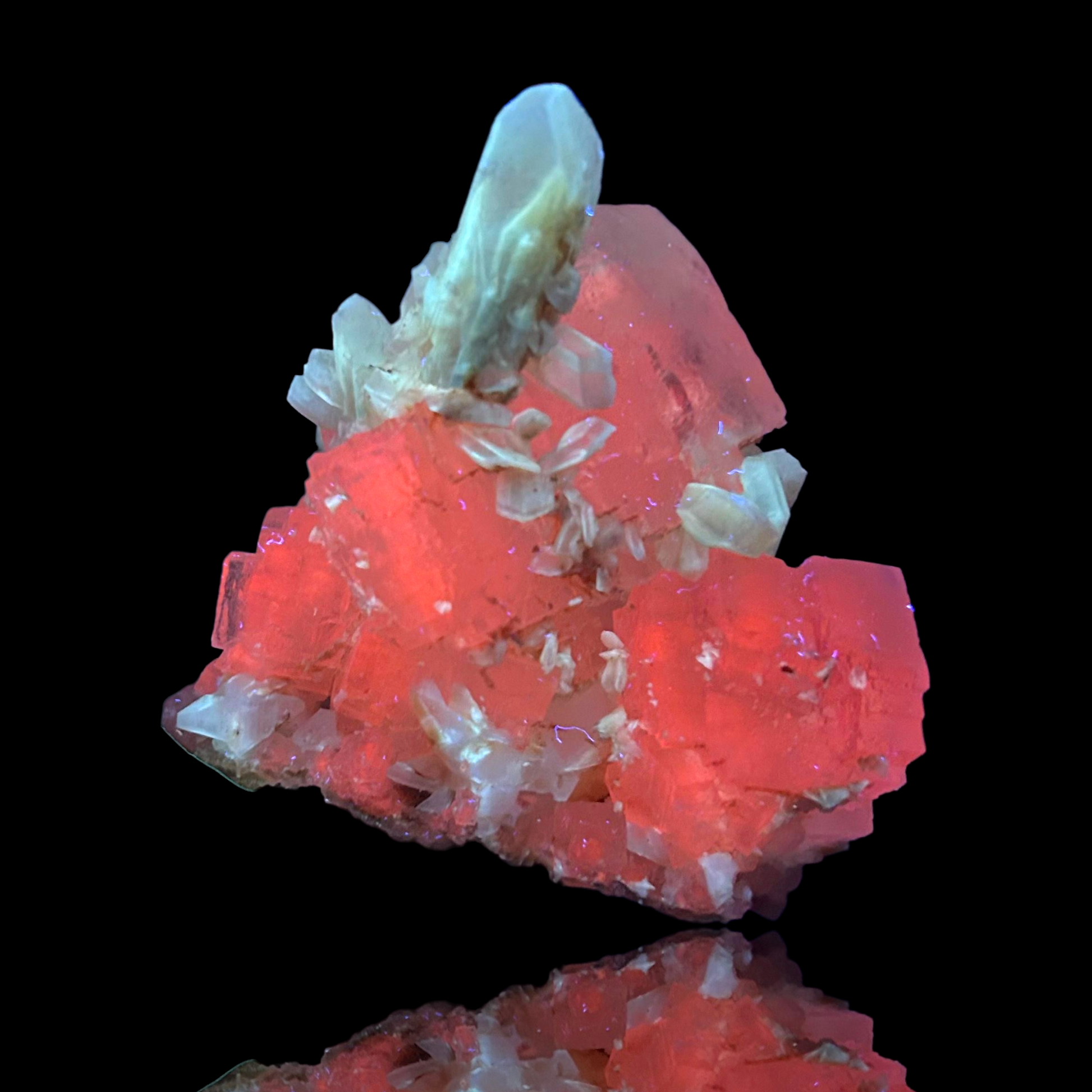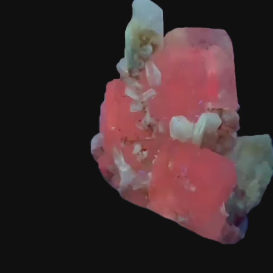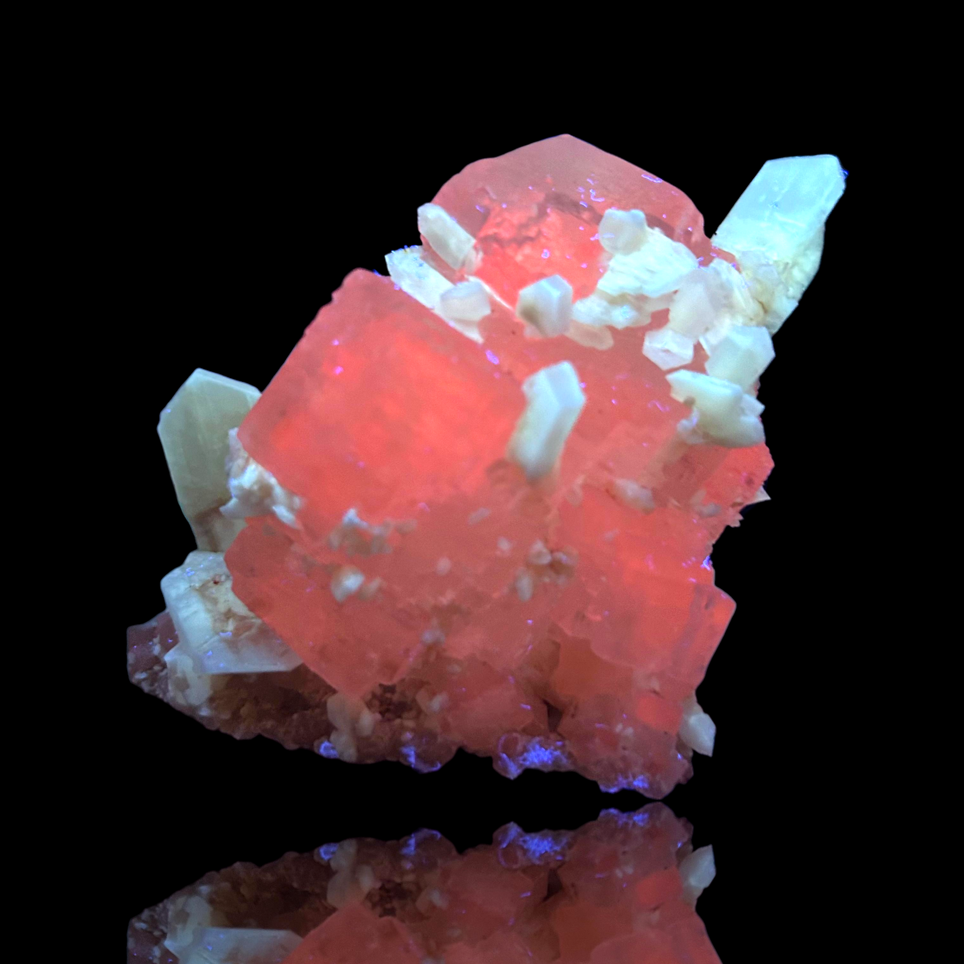 Mangangehalte im Halit verursachen unter UV-Licht eine intensive rot-orange Fluoreszenz, die durch die honigfarbenen Gips-Kristalle auf der Halit-Matrix noch verstärkt wird. Dadurch sind diese seltenen Stufen aus der versiegelten Kristallkammer bei Sammlern sehr begehrt.