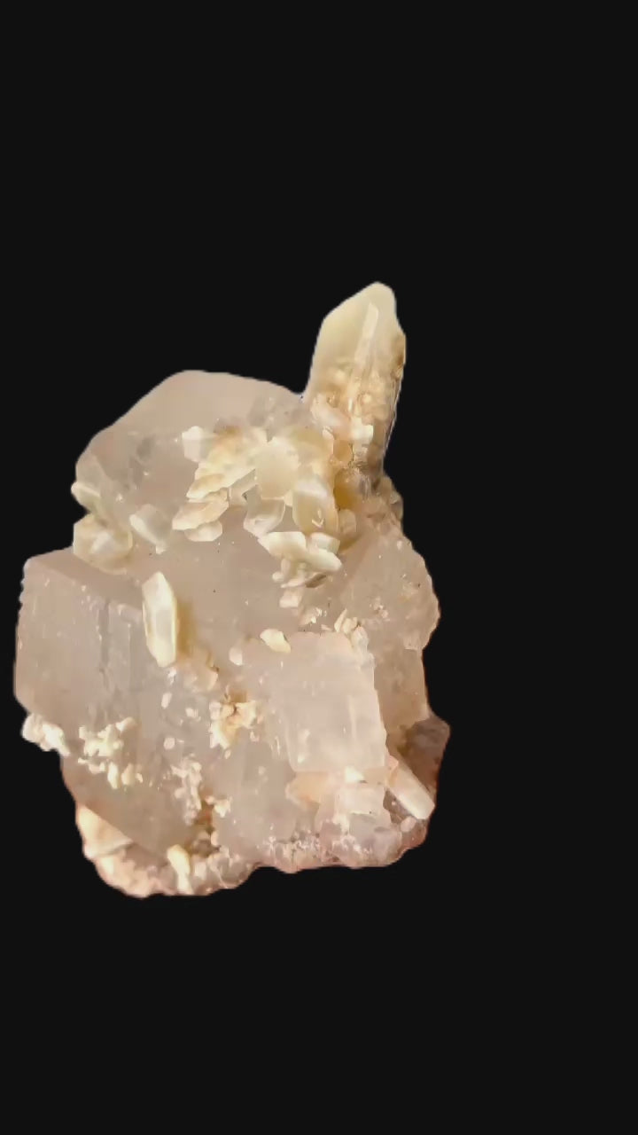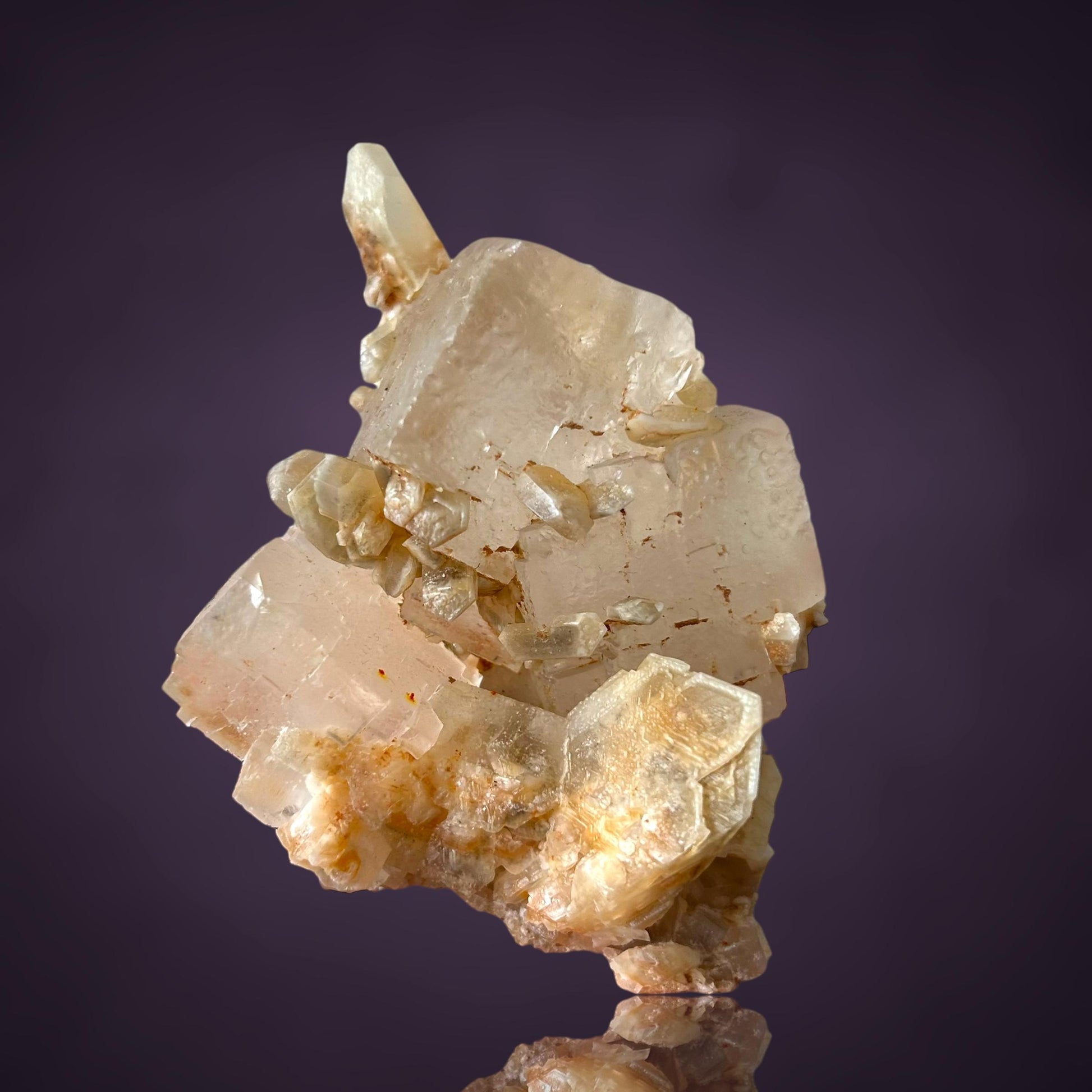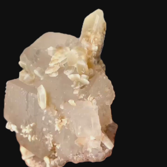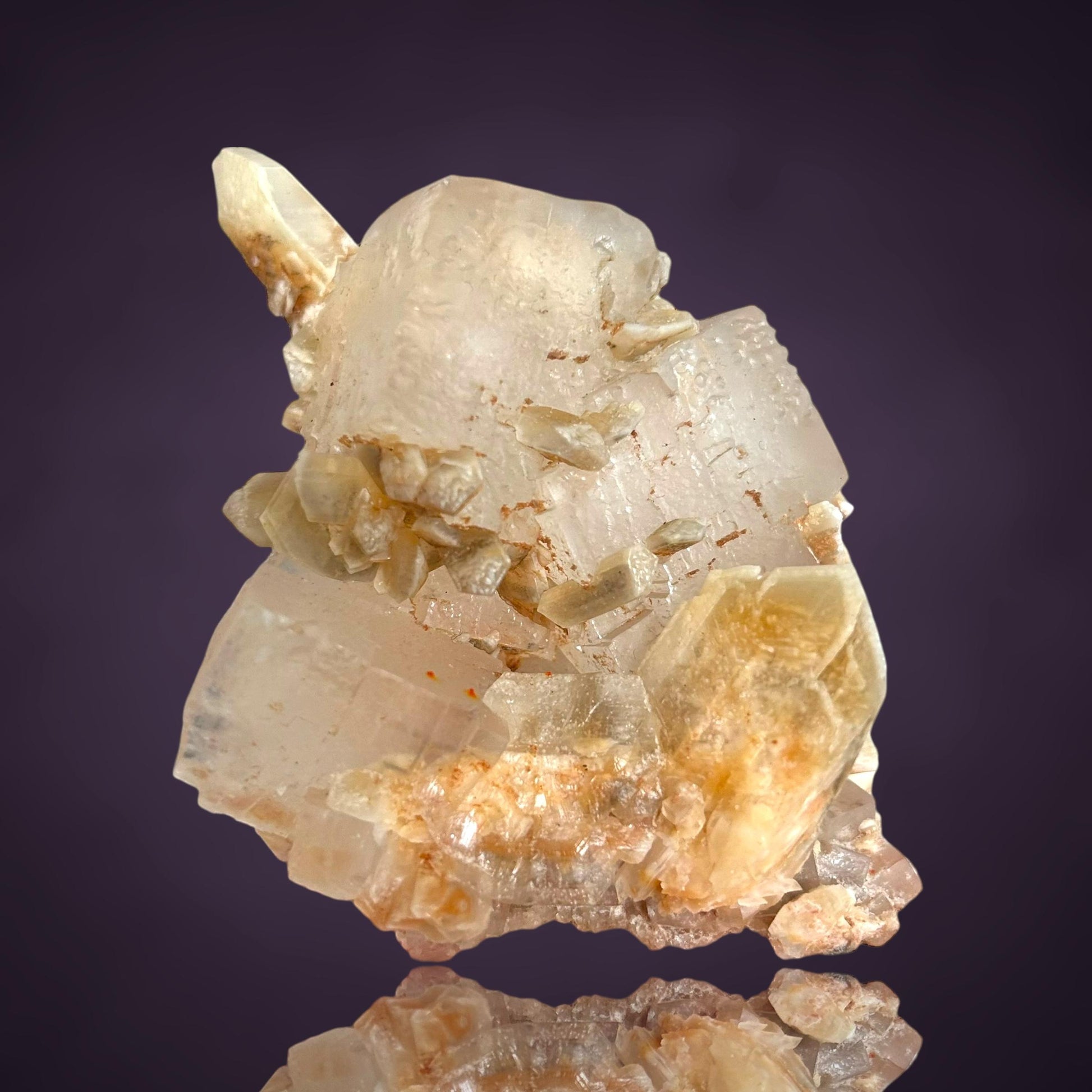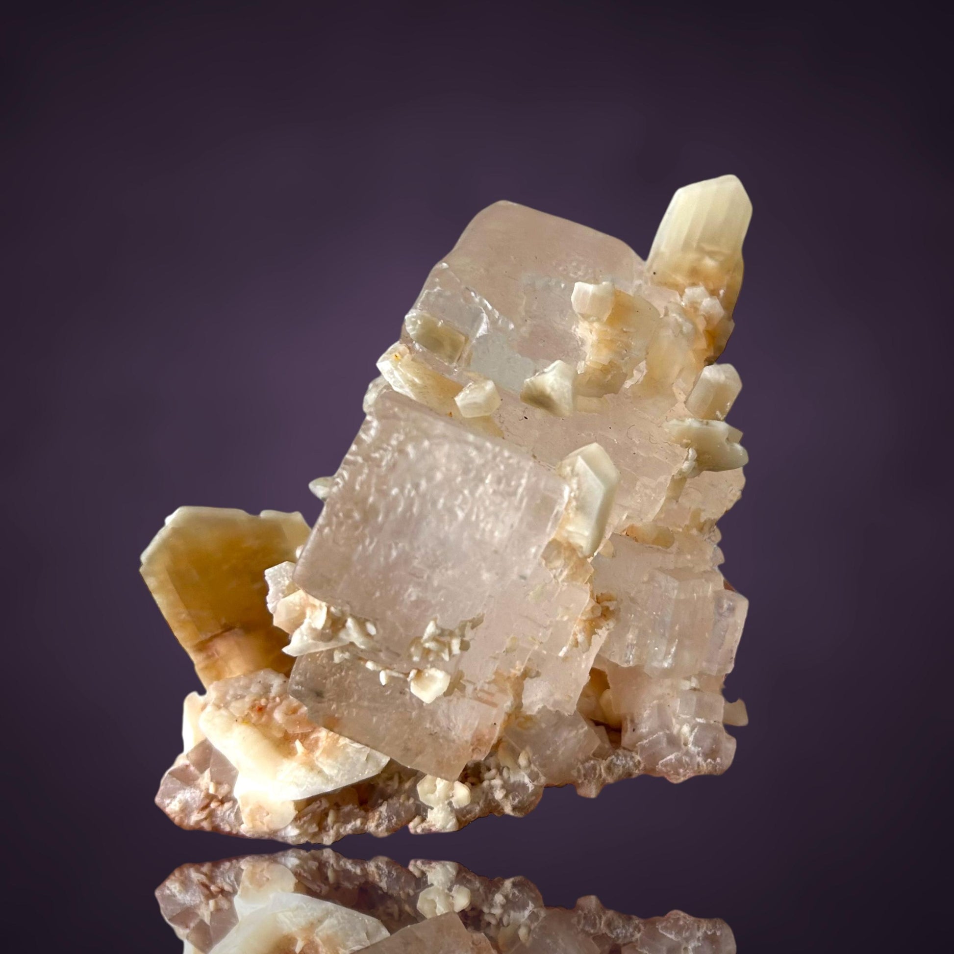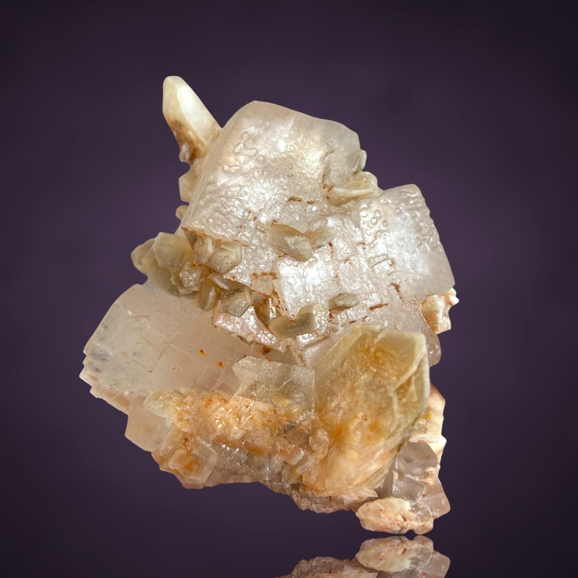 Mangangehalte im Halit verursachen unter UV-Licht eine intensive rot-orange Fluoreszenz, die durch die honigfarbenen Gips-Kristalle auf der Halit-Matrix noch verstärkt wird. Dadurch sind diese seltenen Stufen aus der versiegelten Kristallkammer bei Sammlern sehr begehrt.