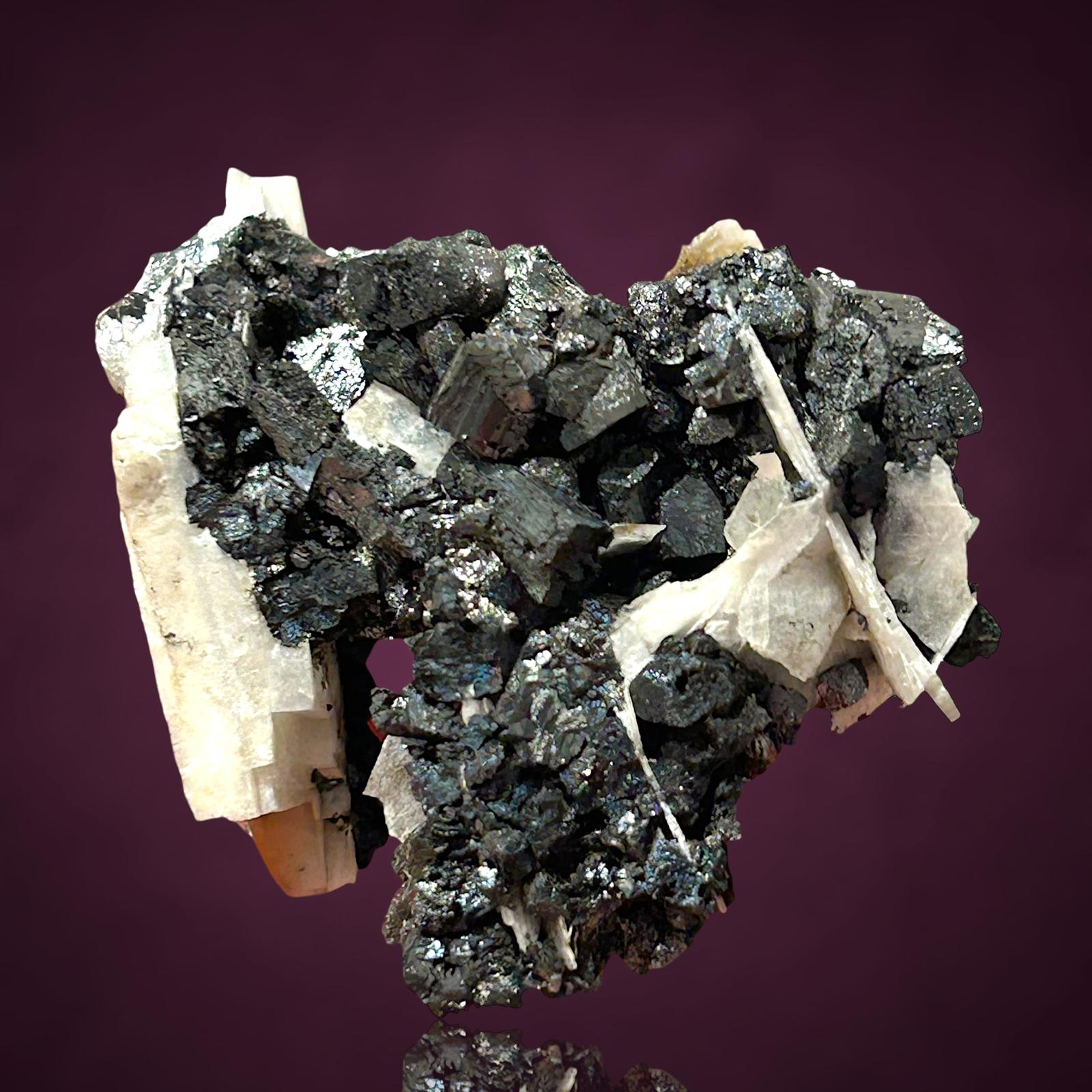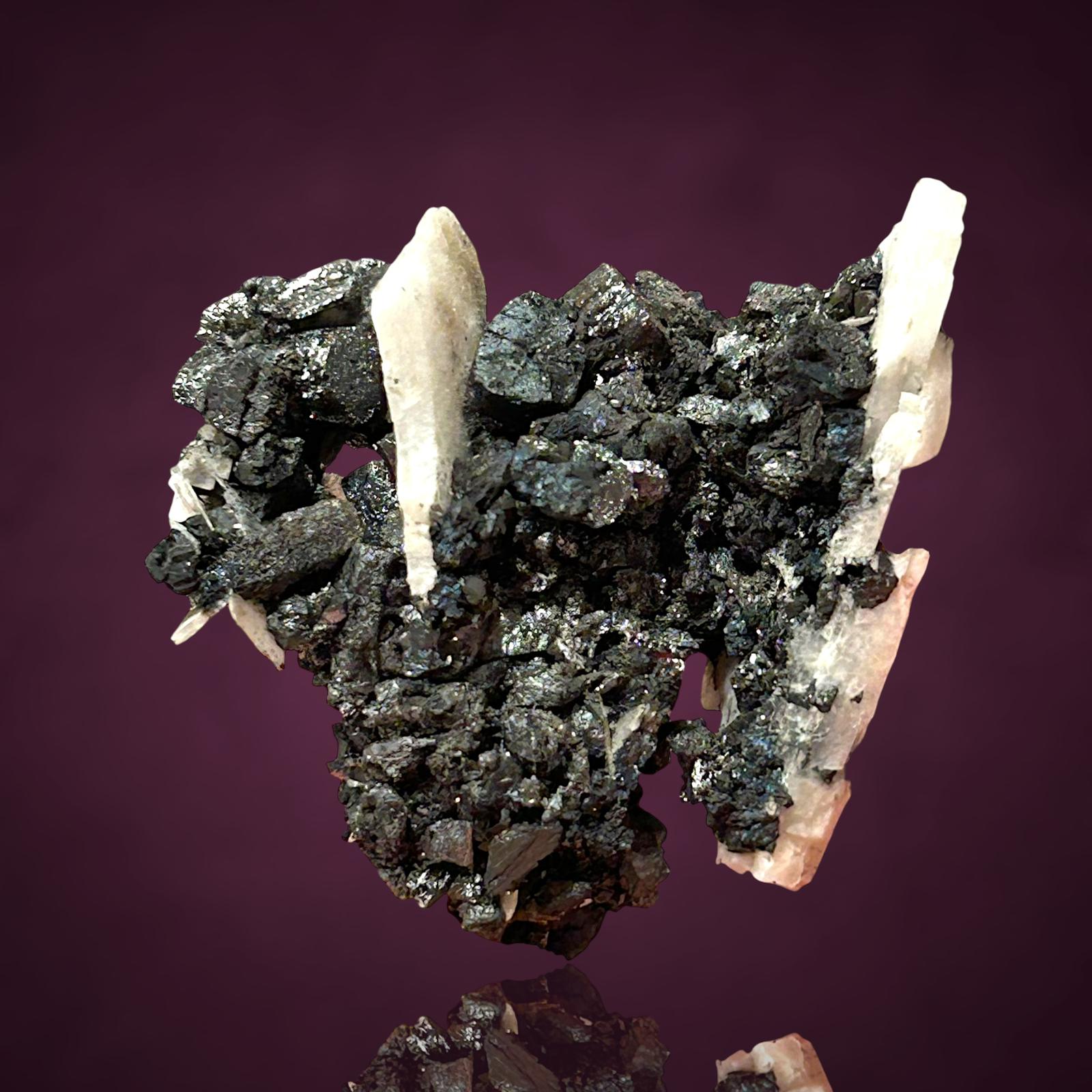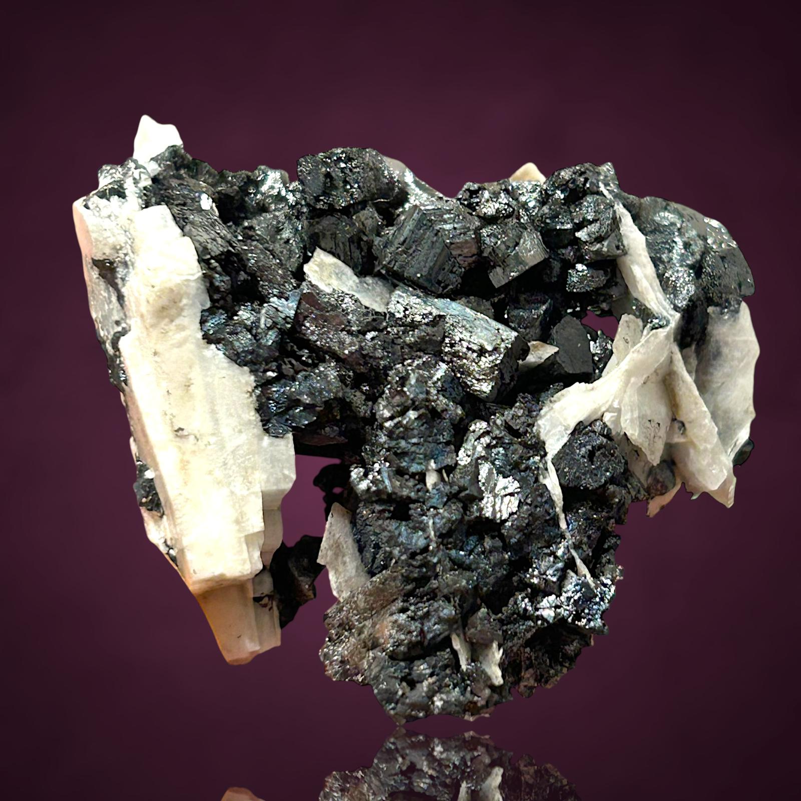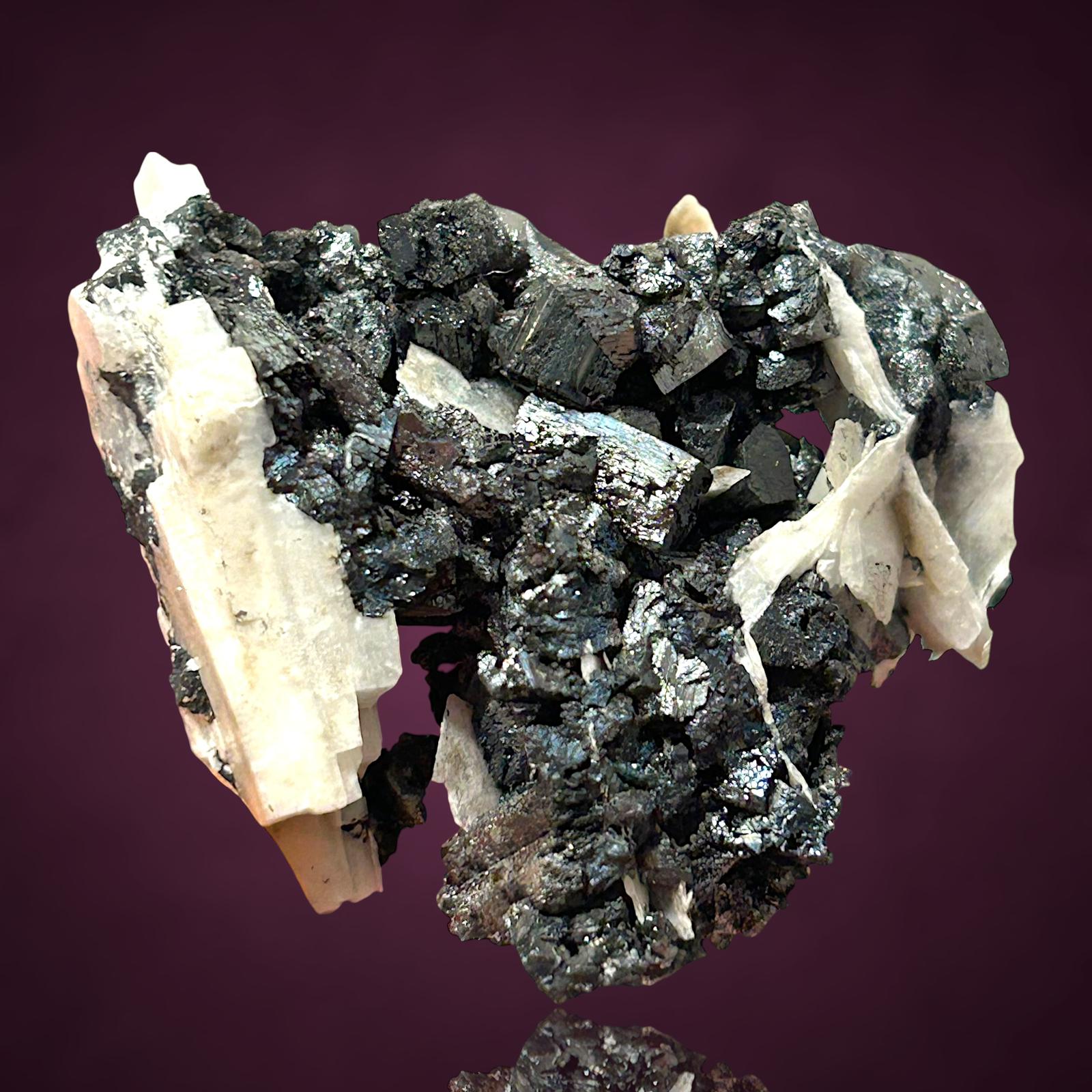 Fantastische blockige Hausmannit xx zusammen mit glänzenden Manganit xx zwischen tafeligen weißen Baryt xx aus der klassischen deutschen Manganfundstelle.