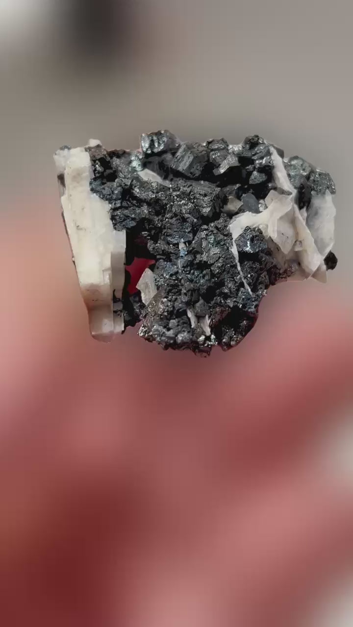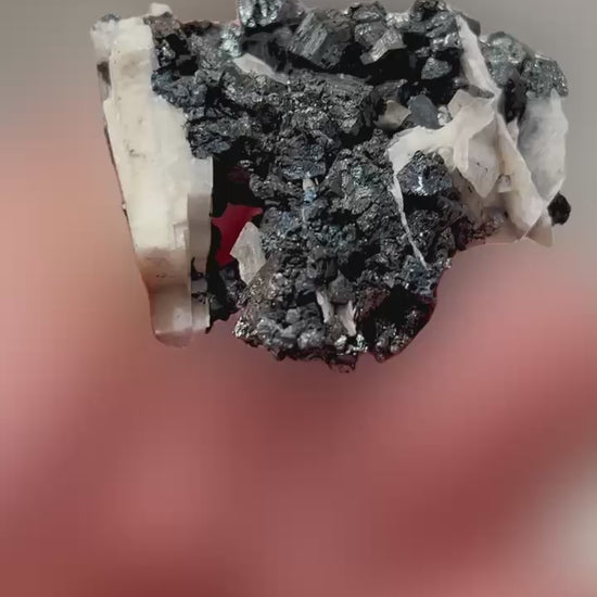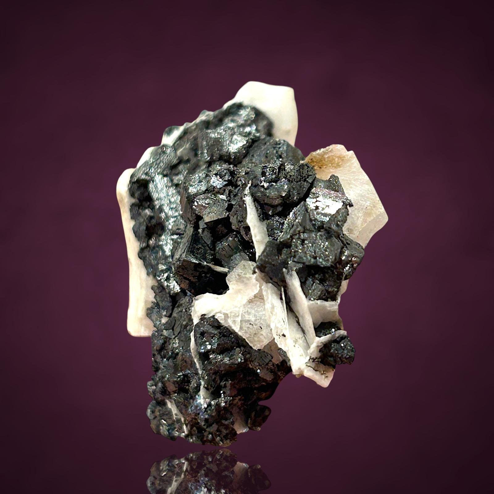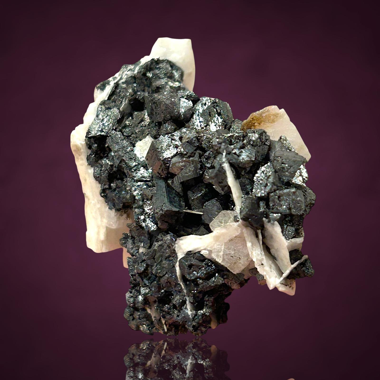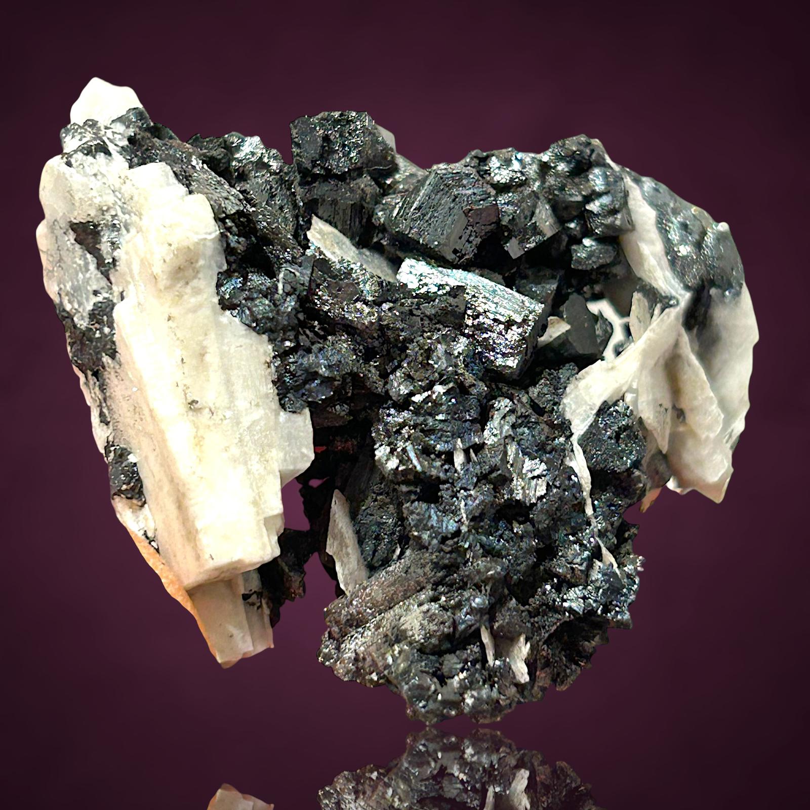Fantastische blockige Hausmannit xx zusammen mit glänzenden Manganit xx zwischen tafeligen weißen Baryt xx aus der klassischen deutschen Manganfundstelle.