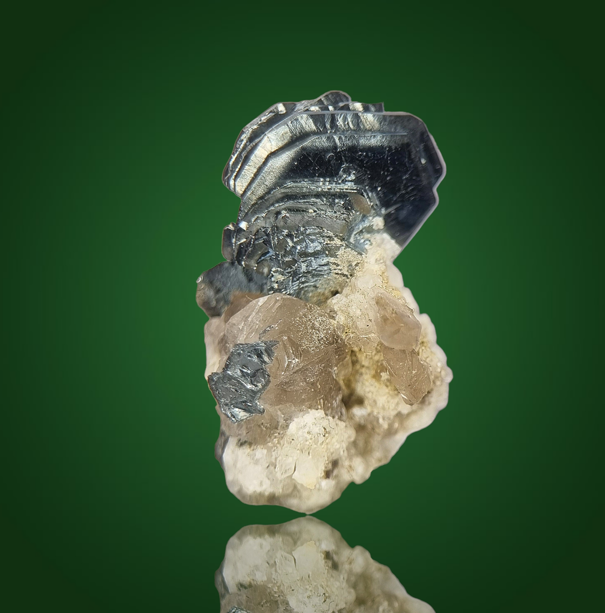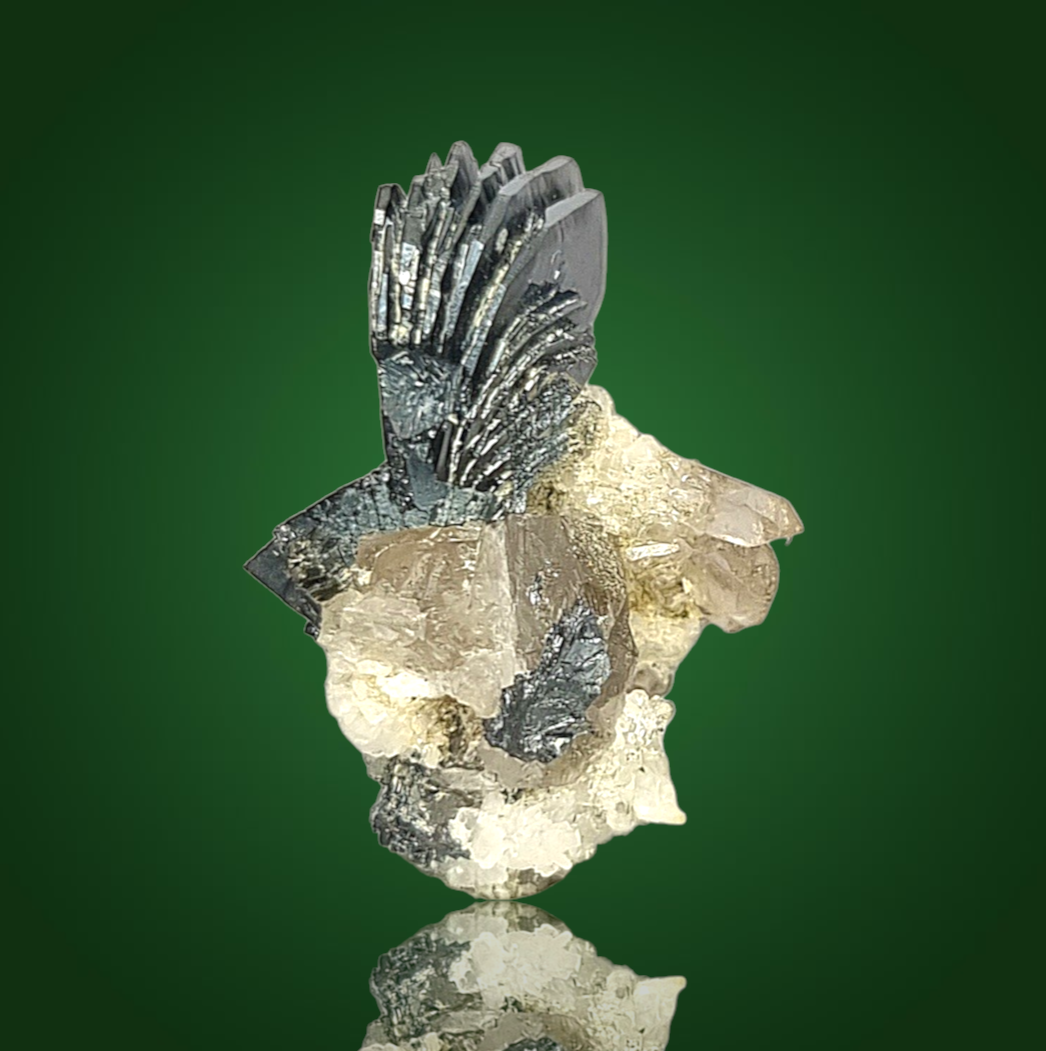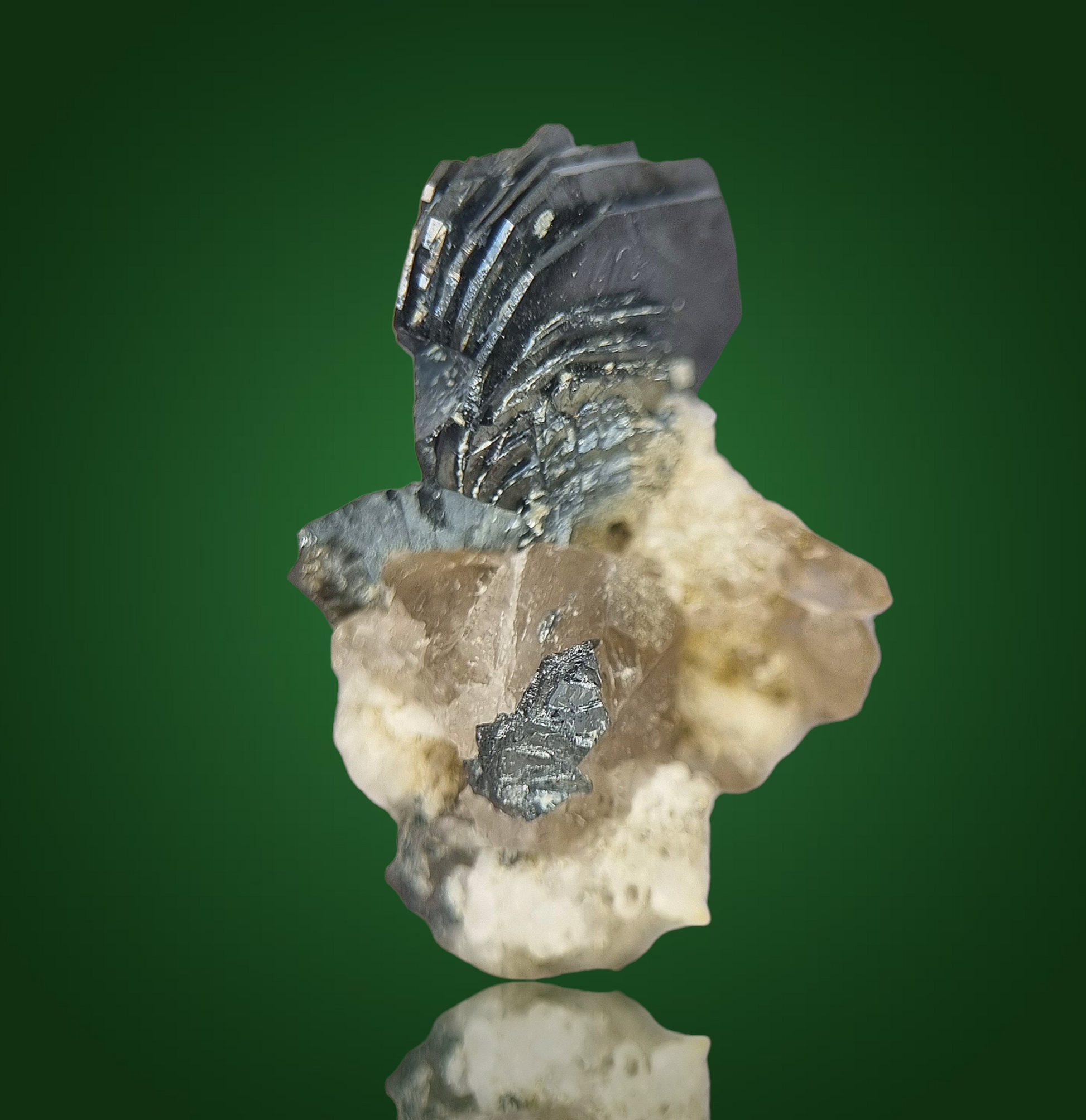 Wunderschönes Schweizer Stüfchen aus schwarzen, glänzenden, hexagonalen, plattigen Hämatitkristallen als attraktives, fächeriges Aggregat auf etwas Matrix mit Rauchquarzkristallen.