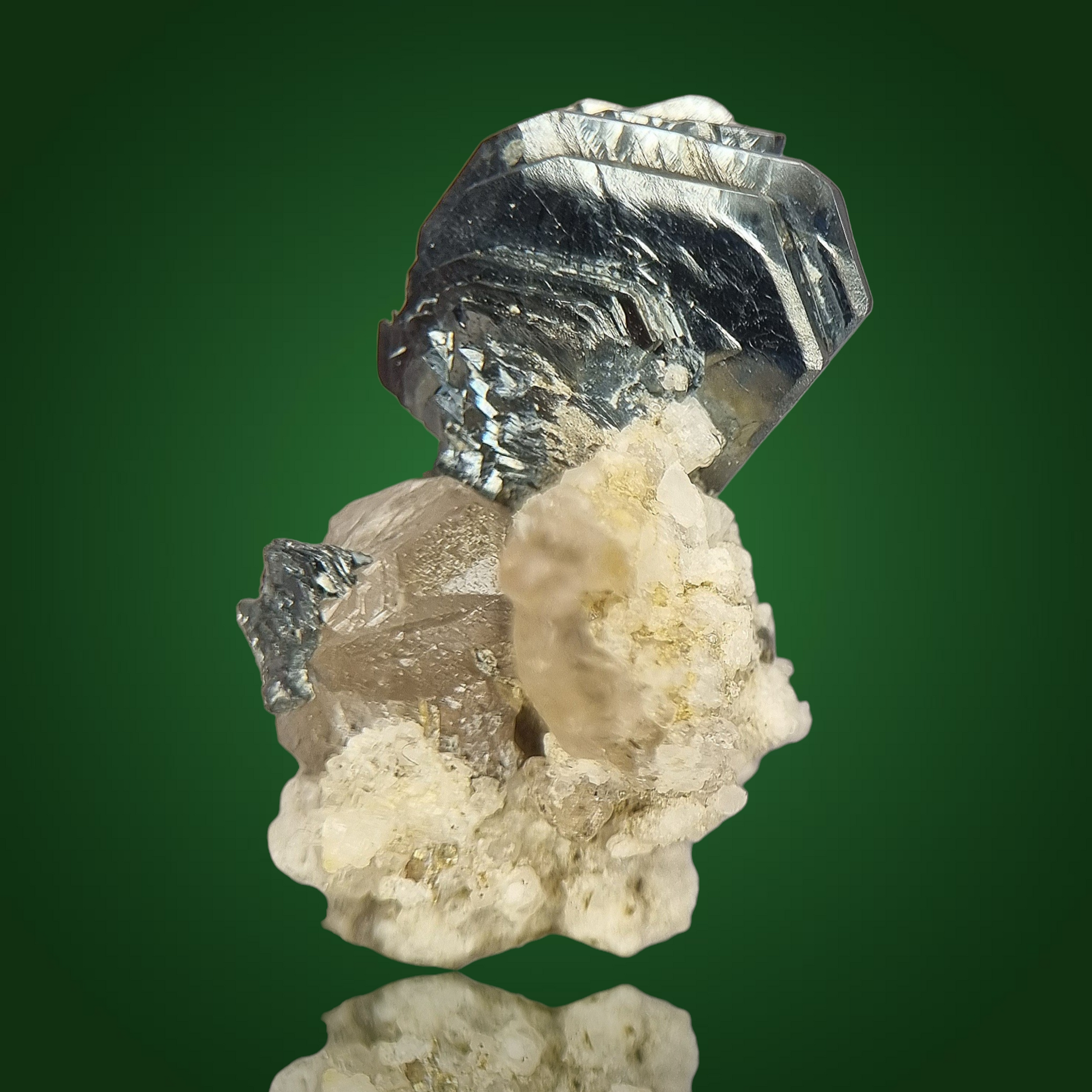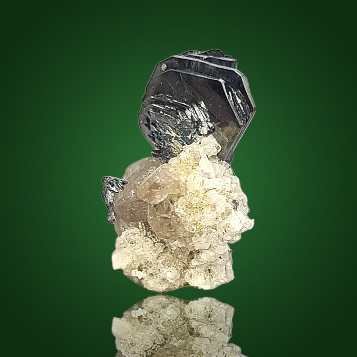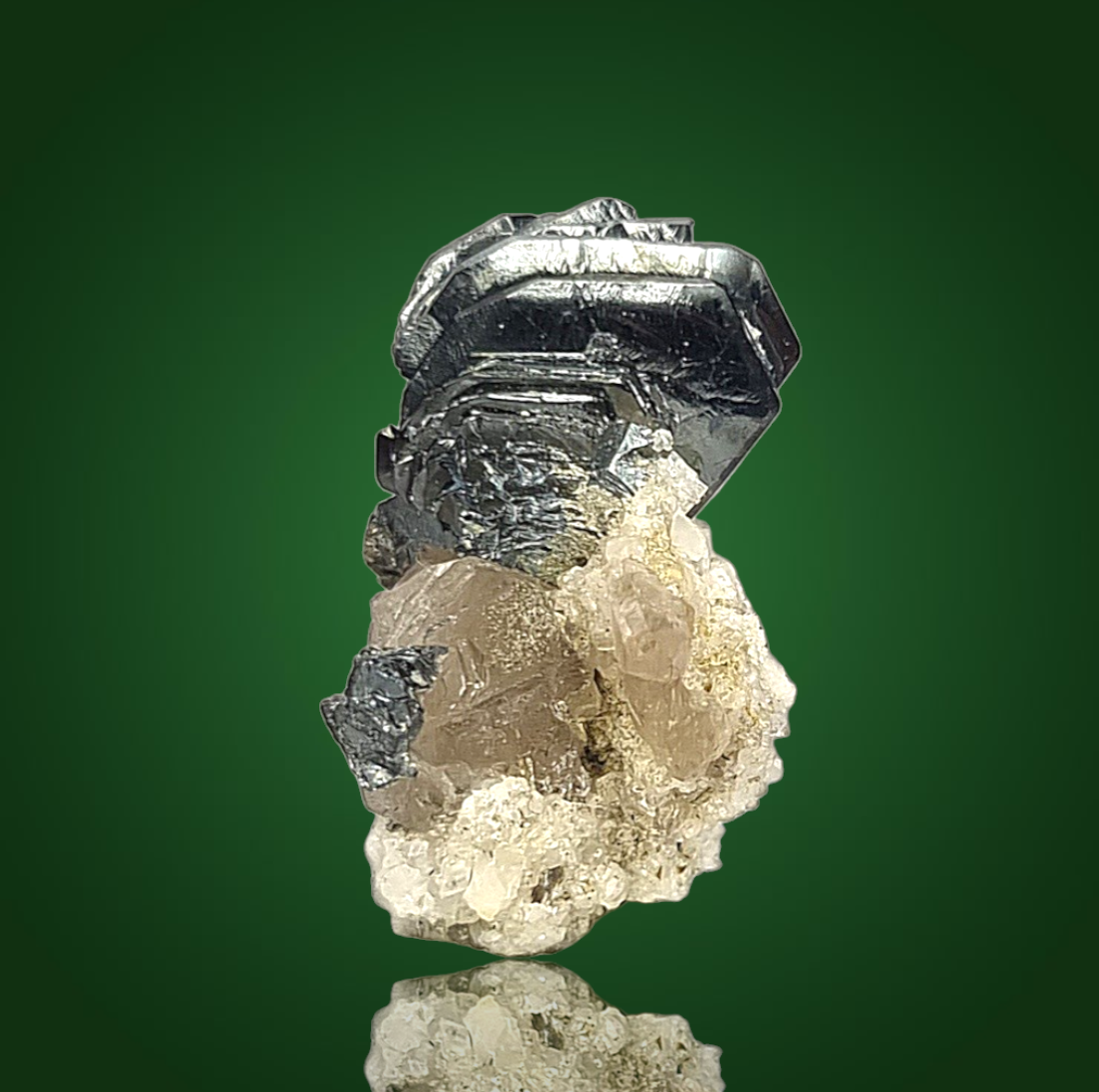 Wunderschönes Schweizer Stüfchen aus schwarzen, glänzenden, hexagonalen, plattigen Hämatitkristallen als attraktives, fächeriges Aggregat auf etwas Matrix mit Rauchquarzkristallen.