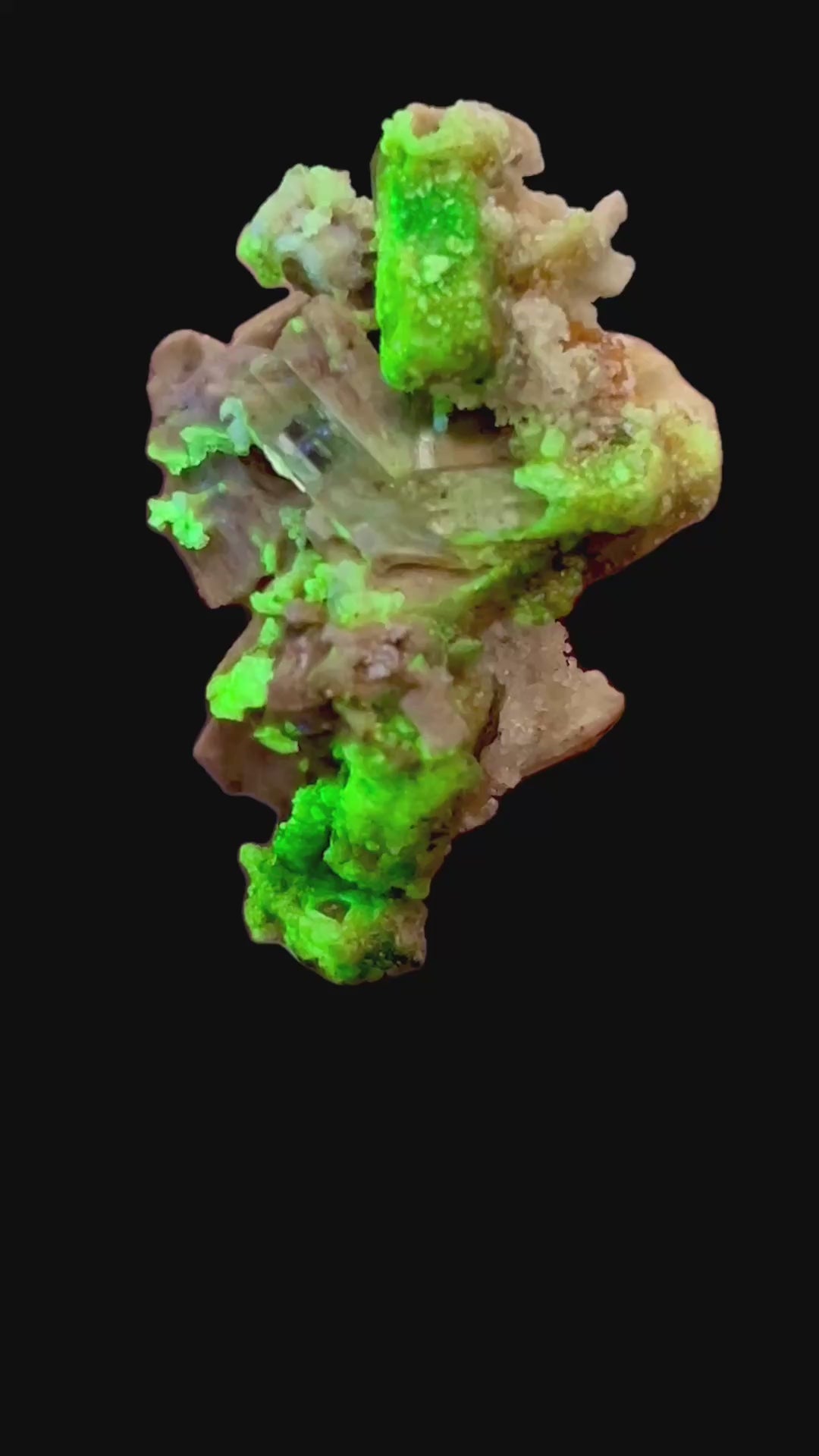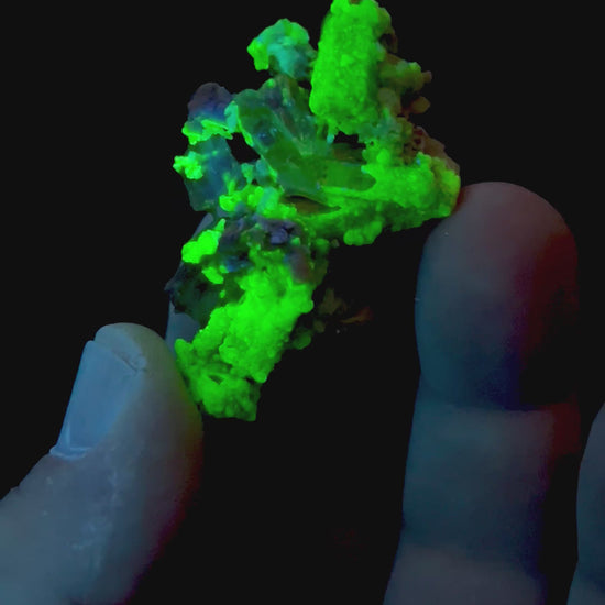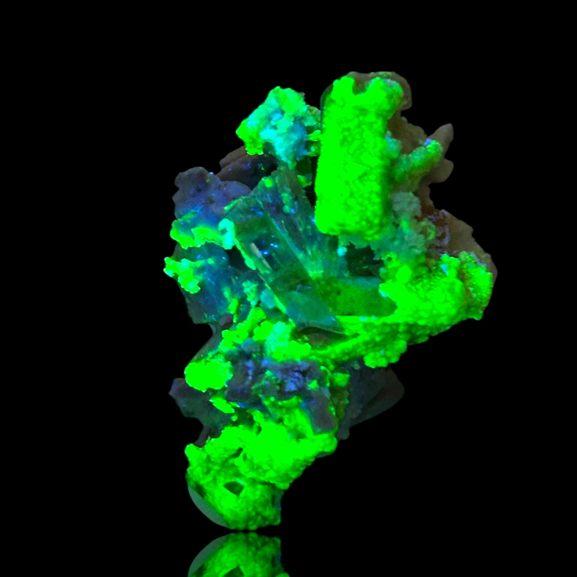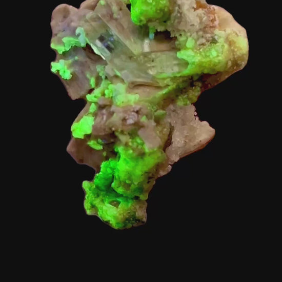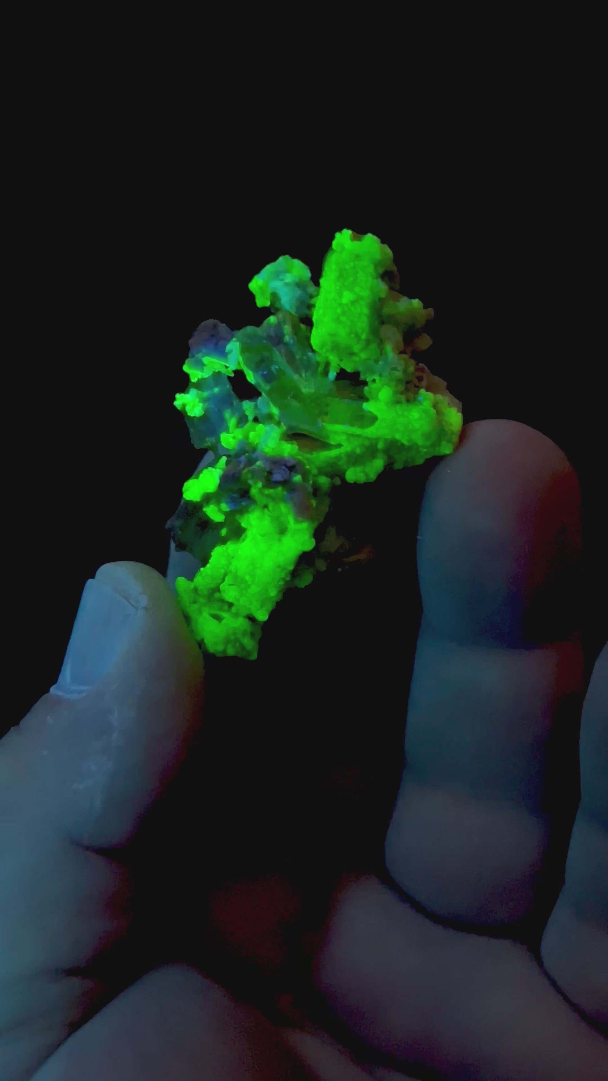 Einfach wunderschön, dieses Stück stammt aus einer Neuentdeckung auf der Dobbelsberg Farm und besticht durch mehrere klare, intensiv blaue Aquamarine, von denen einer direkt mit Hyalit überzogen ist. Ein umwerfender Effekt, und das günstige UV-Licht aus dem Baumarkt reicht hierfür völlig aus.