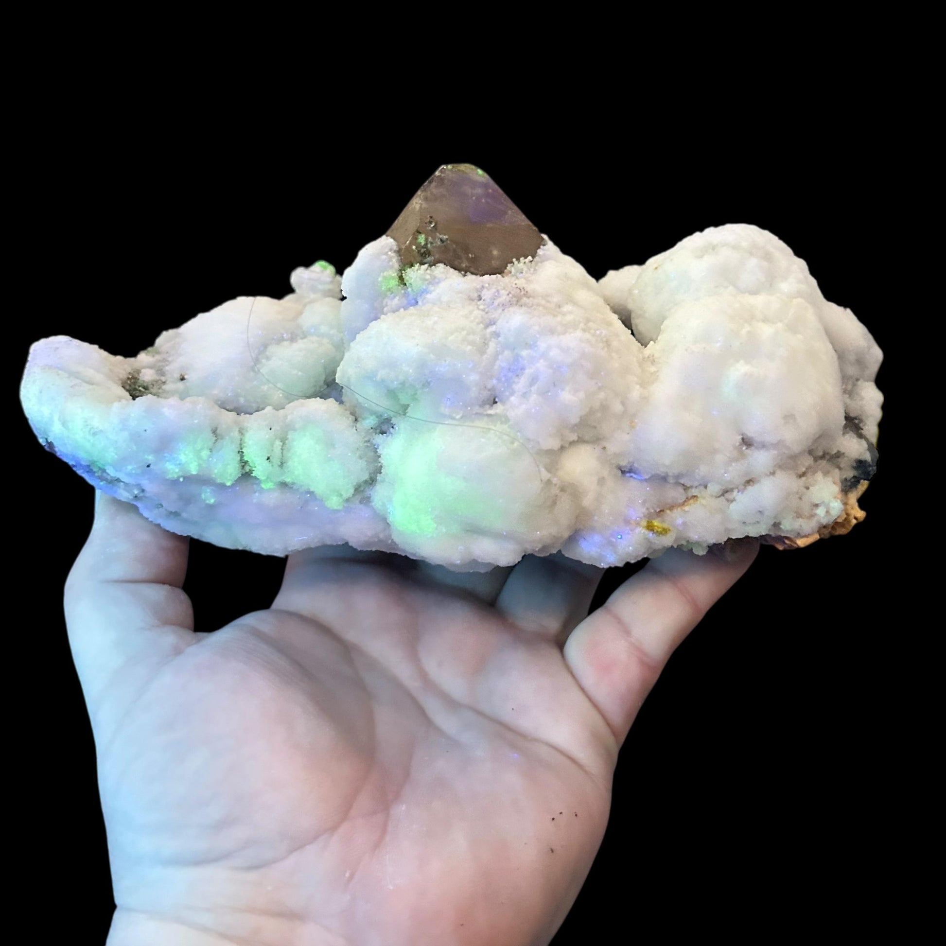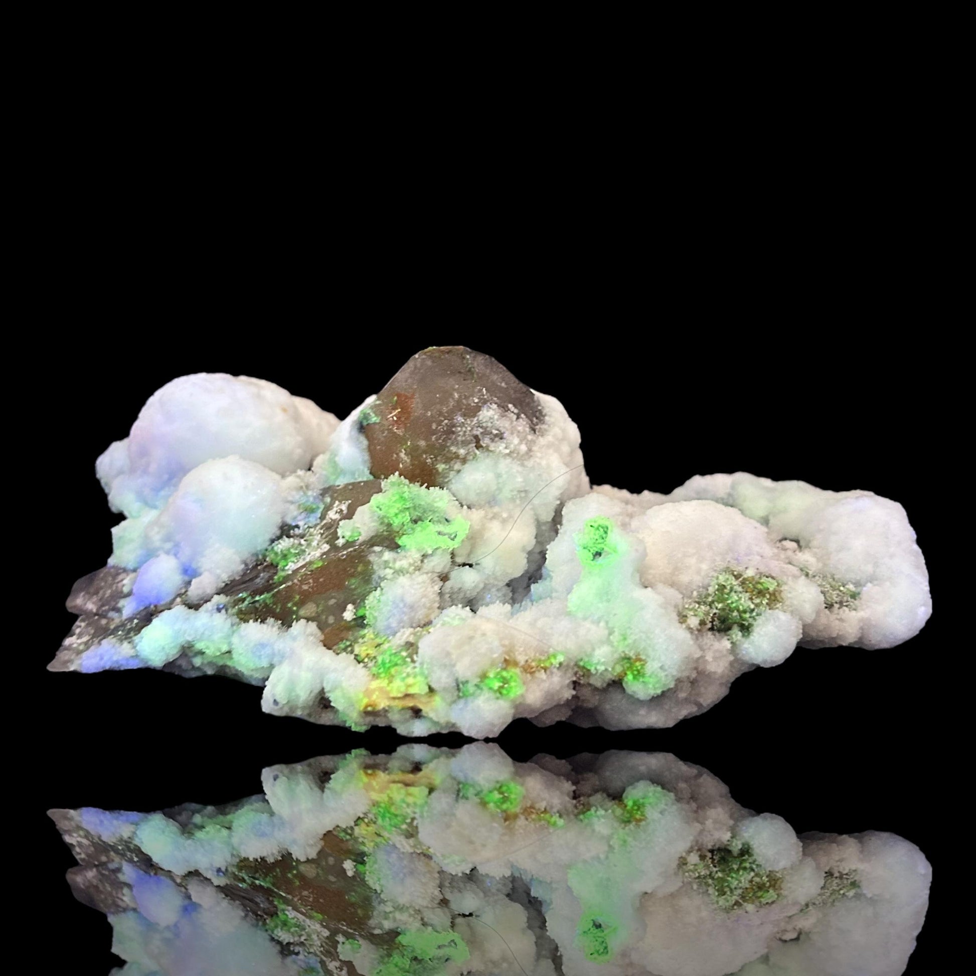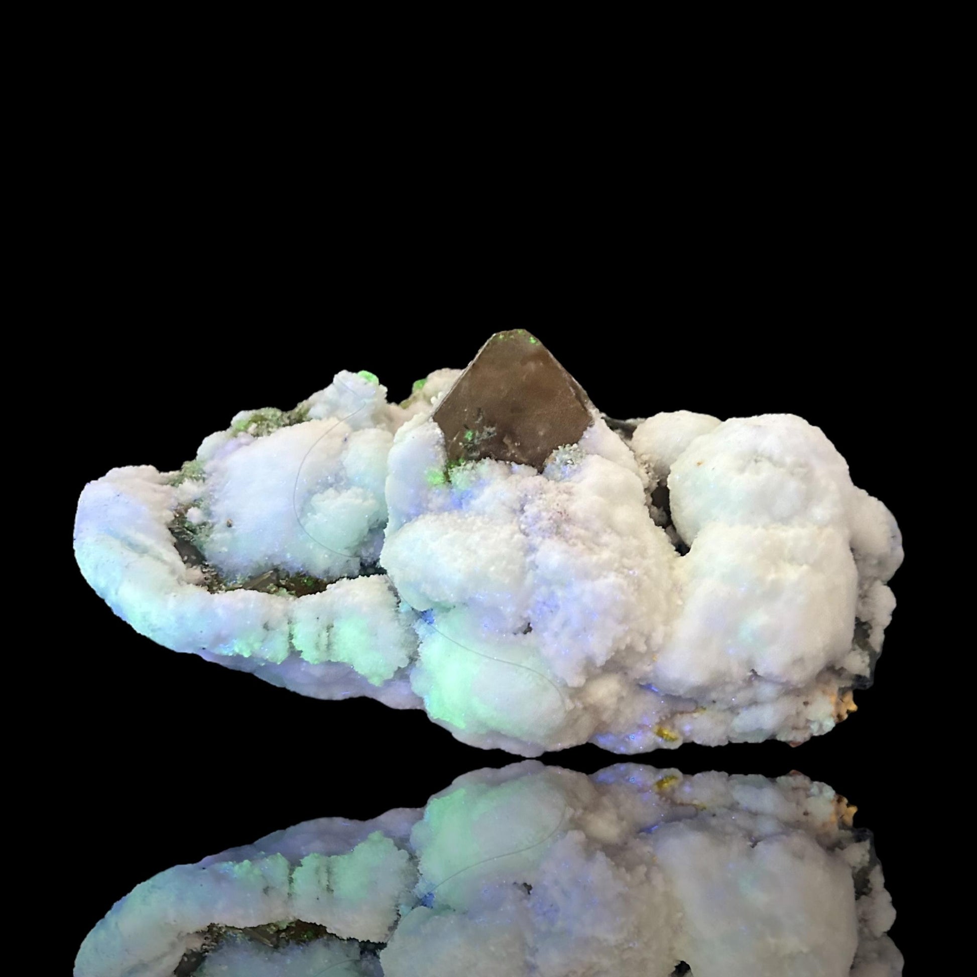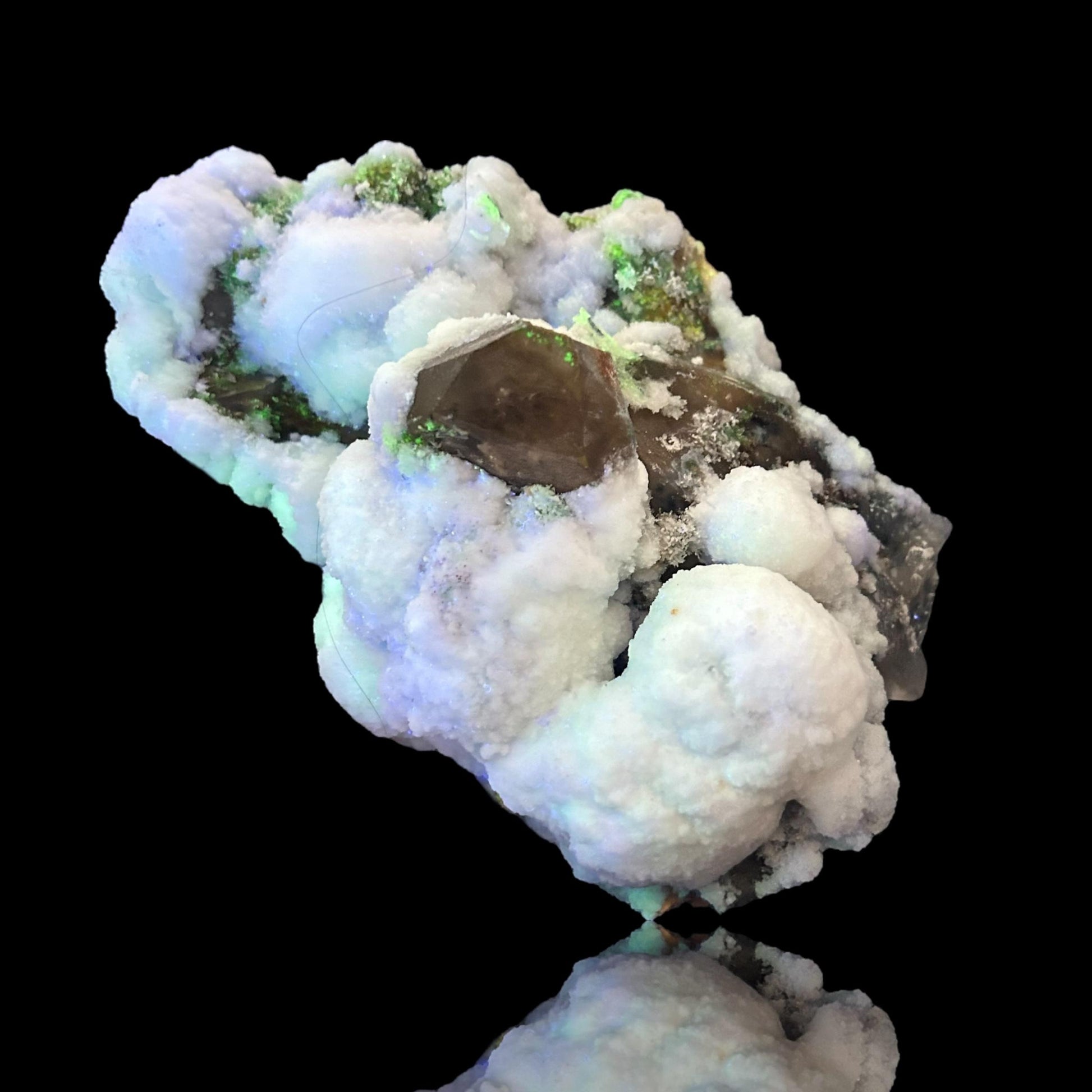 🇩🇪Wolken aus kristallisiertem Hyalit erinnern an weißer Schneelandschaft, aus dem ein Berggipfel aus Rauchquarz herausragt. Interessanterweise zeigt der Hyalit hier nicht überall UV-Aktivität.