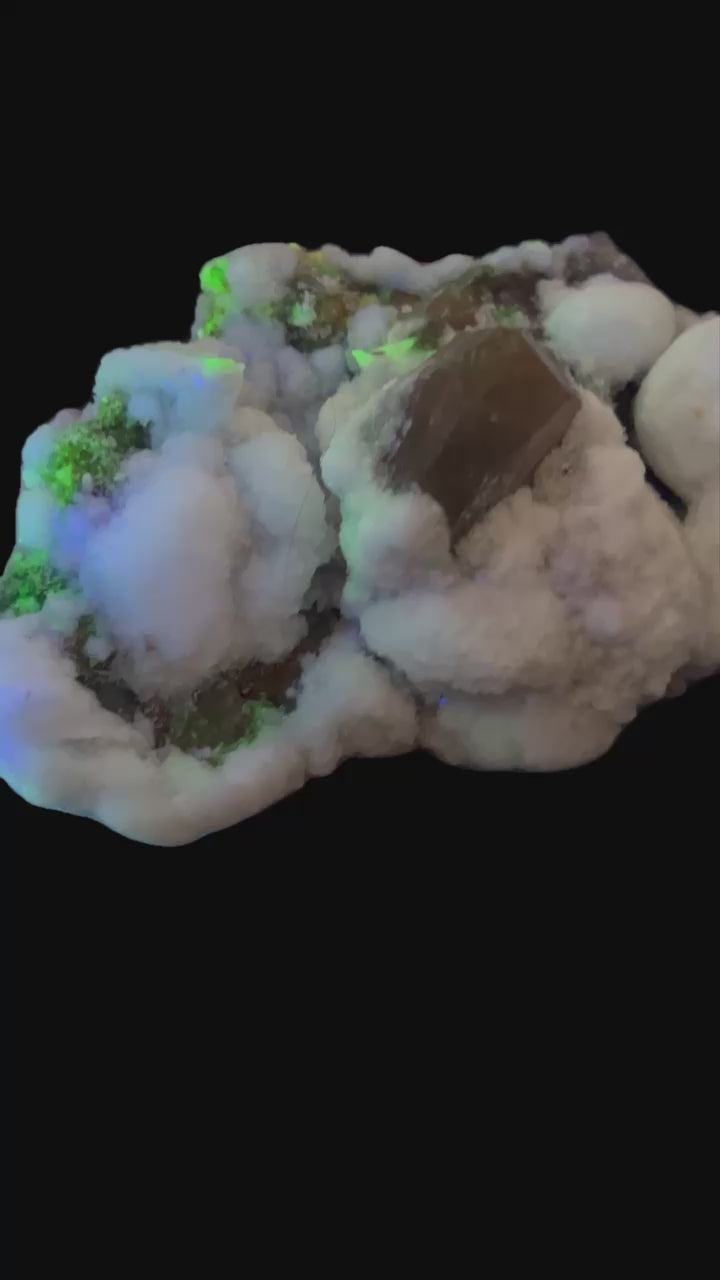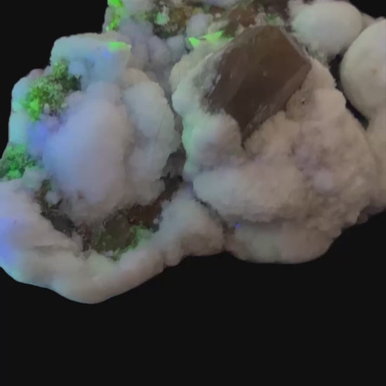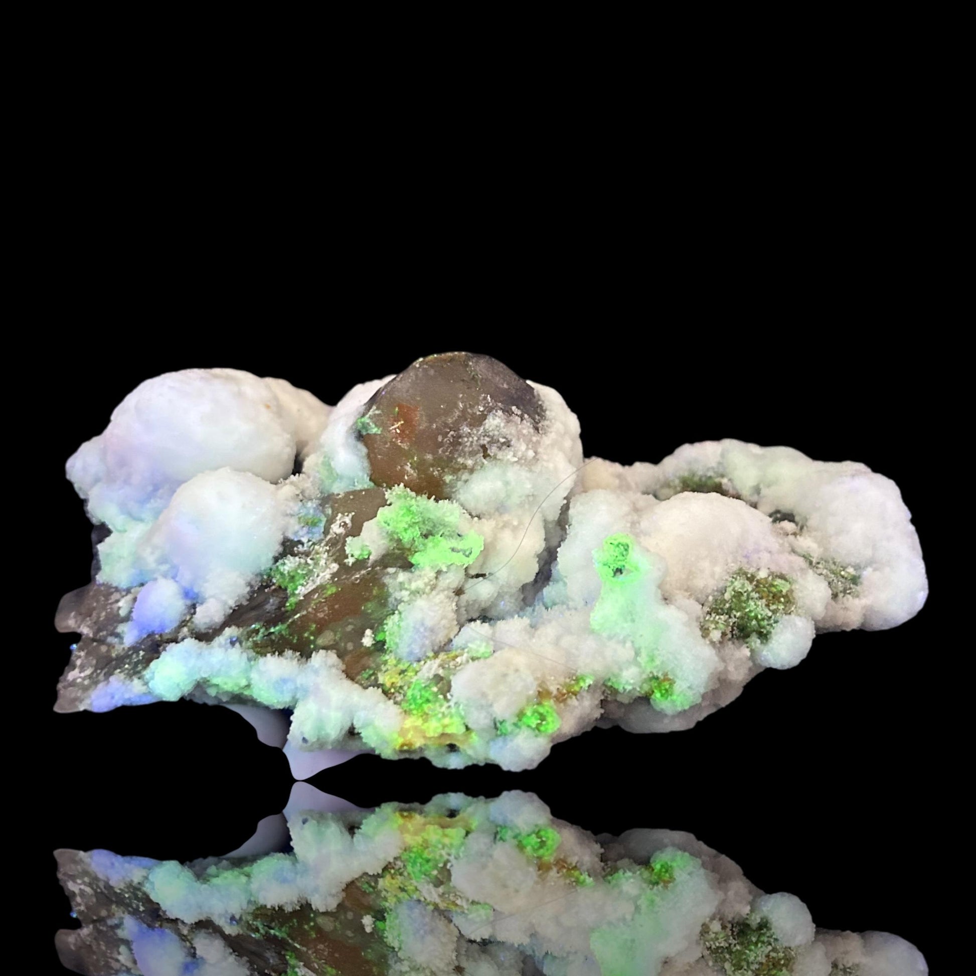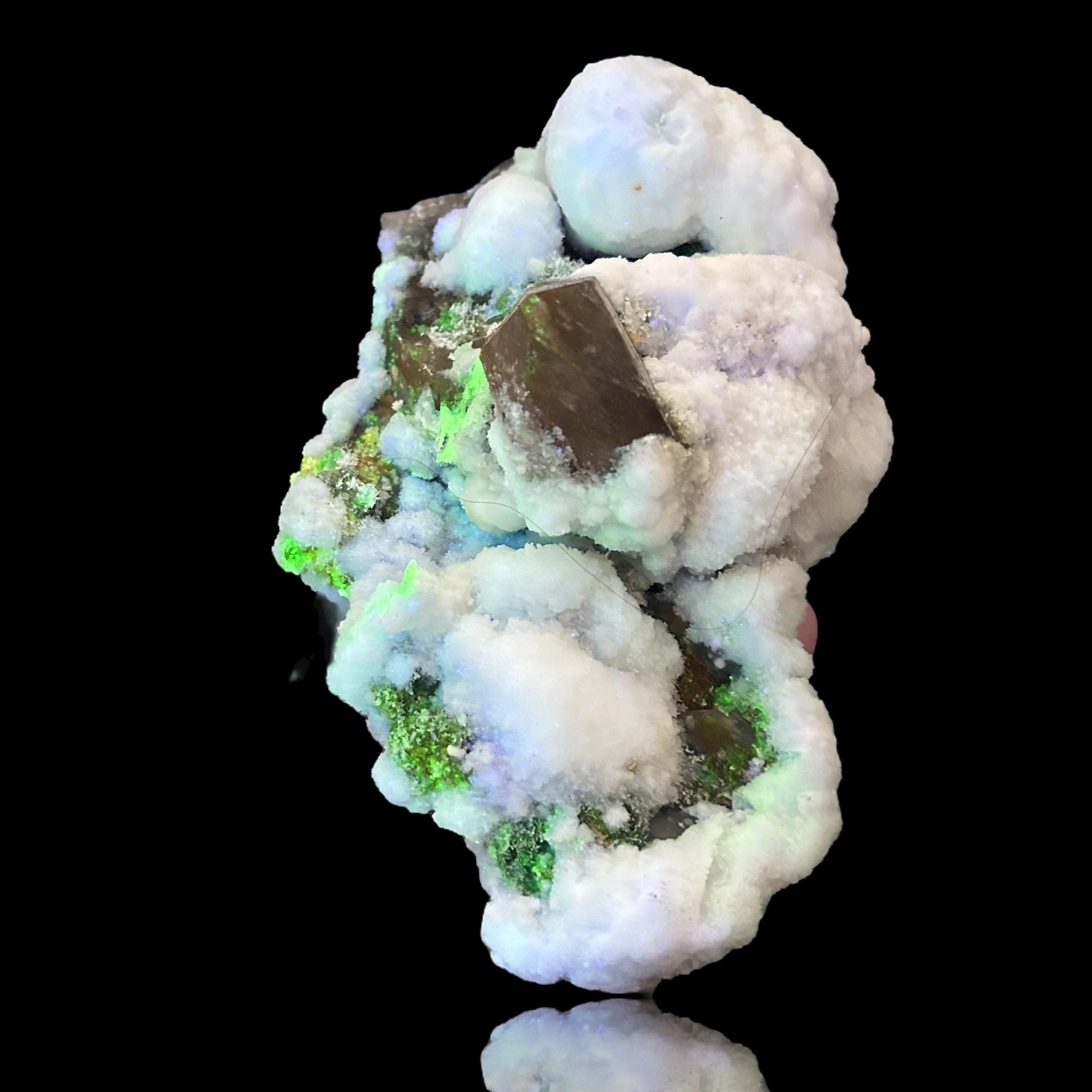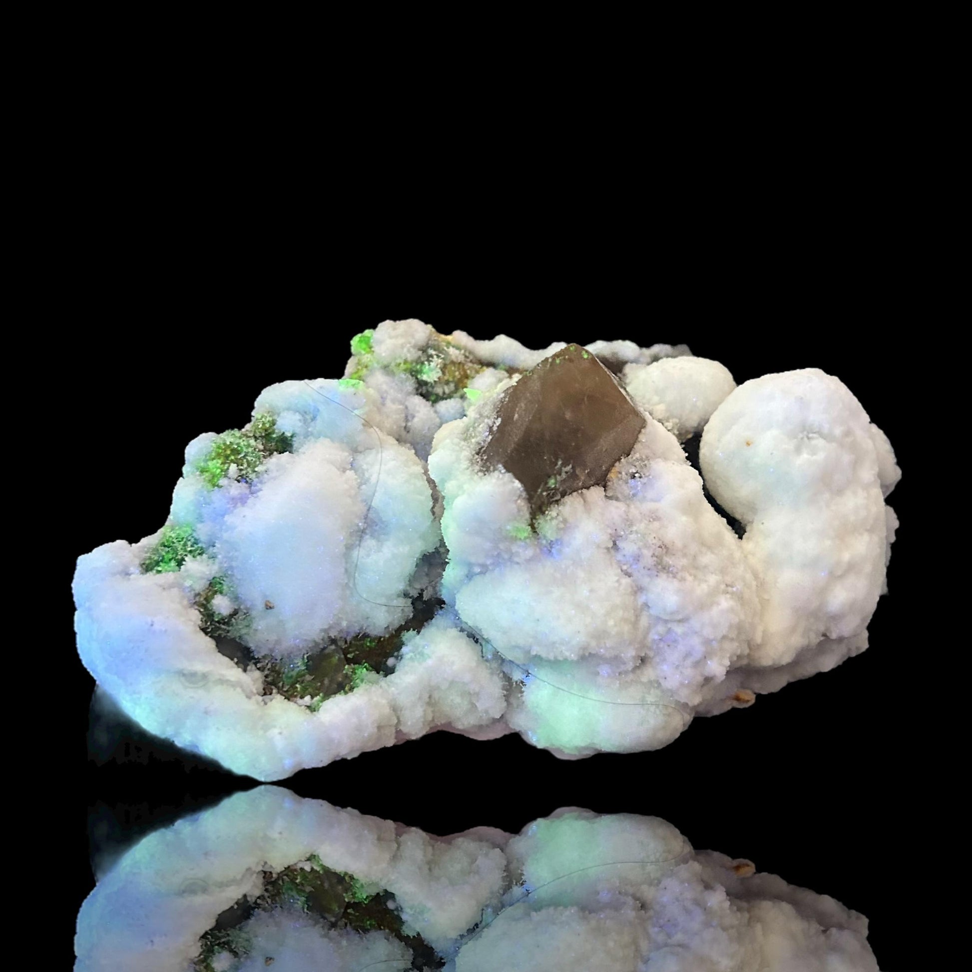 🇩🇪Wolken aus kristallisiertem Hyalit erinnern an weißer Schneelandschaft, aus dem ein Berggipfel aus Rauchquarz herausragt. Interessanterweise zeigt der Hyalit hier nicht überall UV-Aktivität.