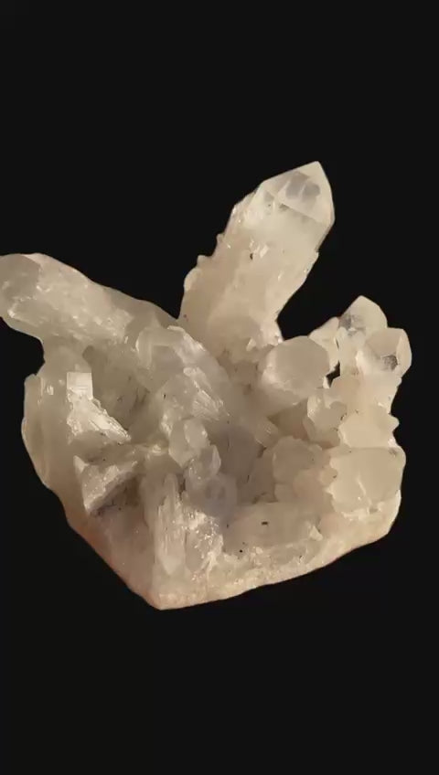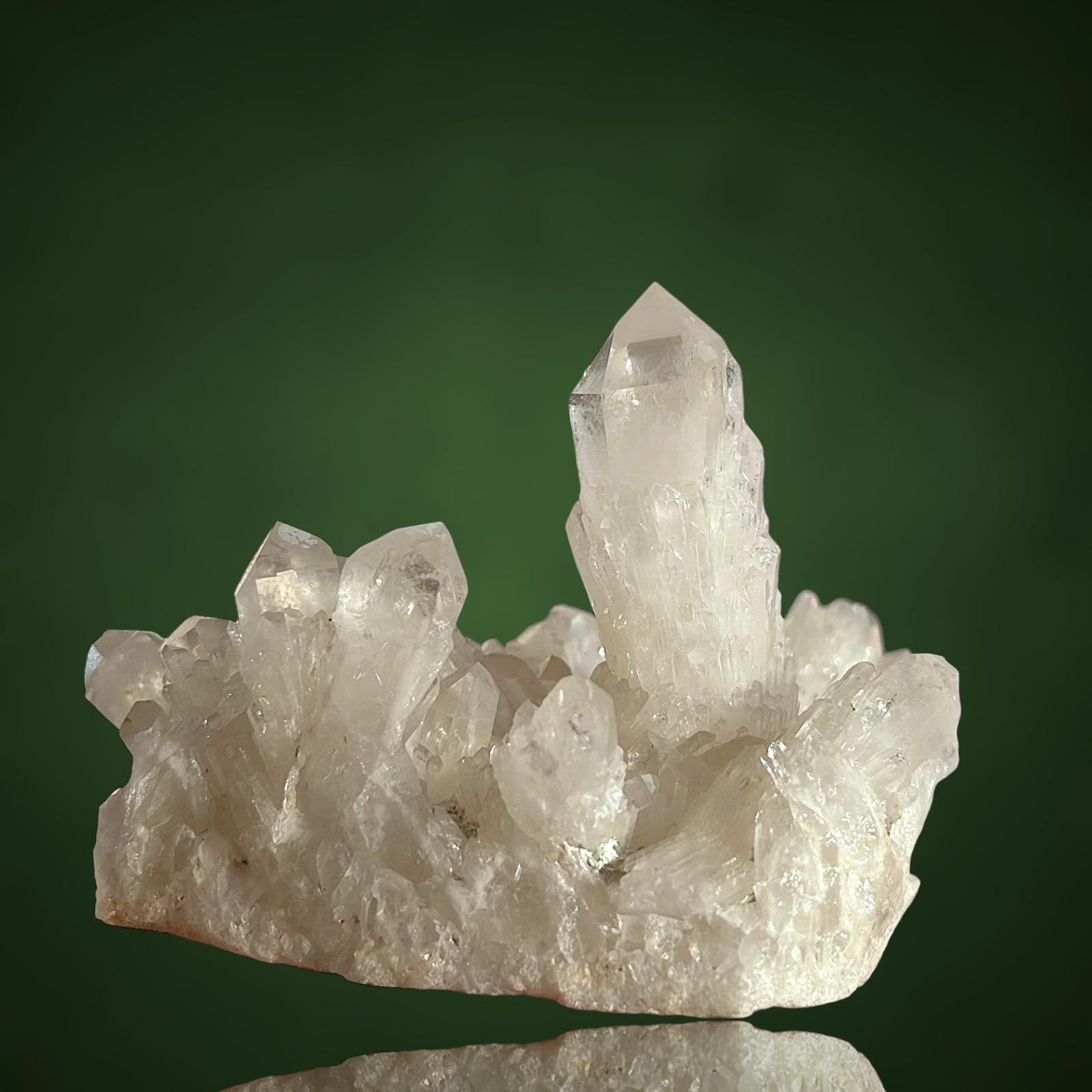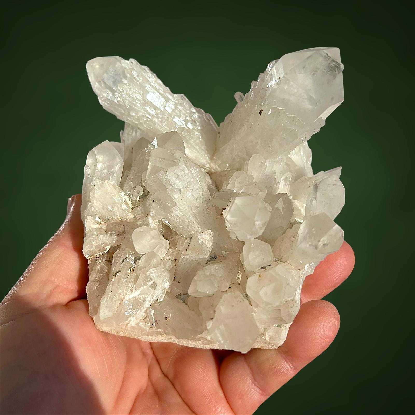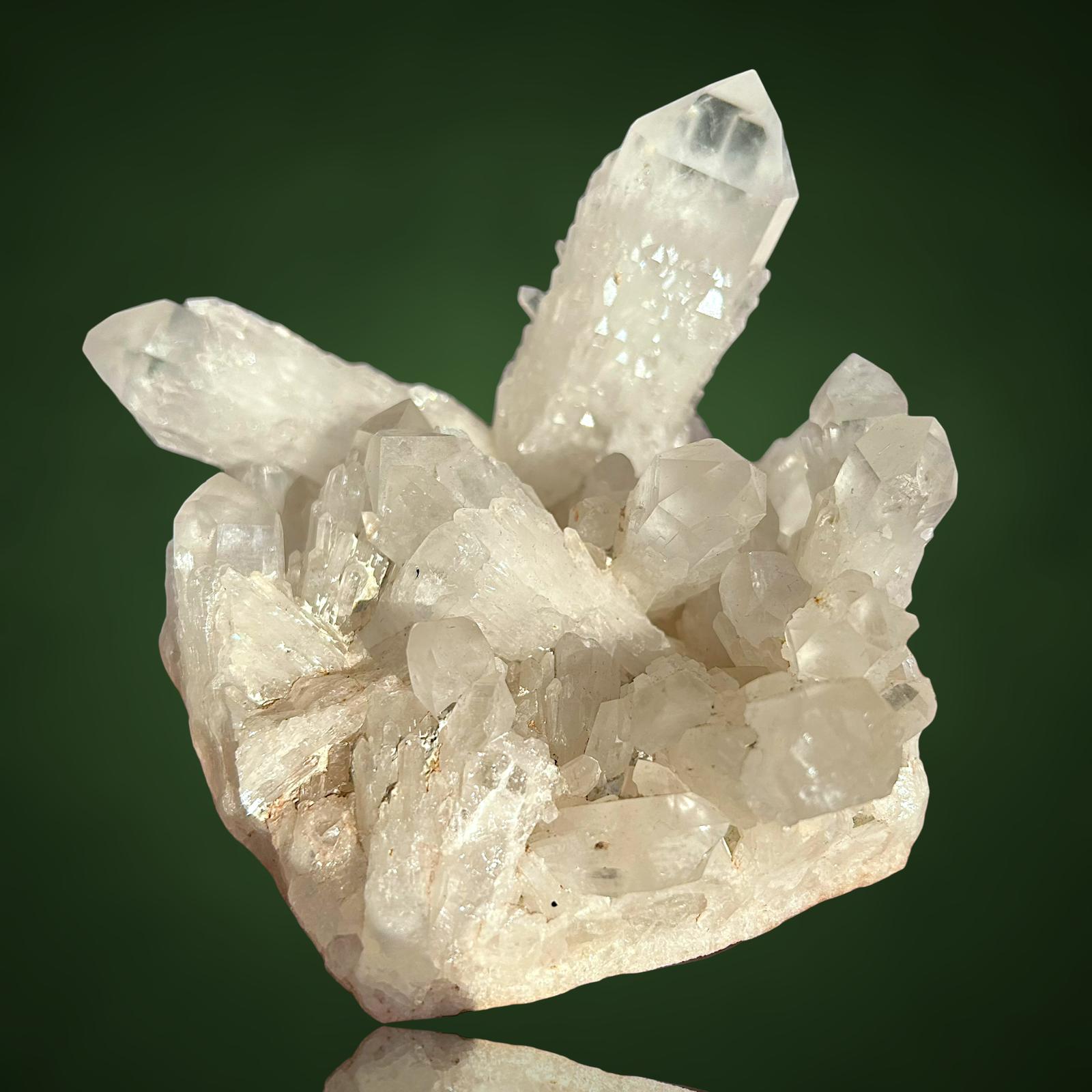 Die Kristalle dieses Stücks weisen ein markantes, artischockenartiges Wachstum auf, das an den sogenannten „Artischockenquarz“ erinnert, mit einer geschichteten, skulpturalen Struktur. Sie sind von wunderbarer Klarheit, hochglänzend und scharf definiert, wodurch ein dynamisches Zusammenspiel von Transparenz, Geometrie und Brillanz entsteht. Die Gesamtästhetik ist kraftvoll und zugleich raffiniert – ein optisch ausgewogenes und äußerst dekoratives Schmuckstück für jede Vitrine.