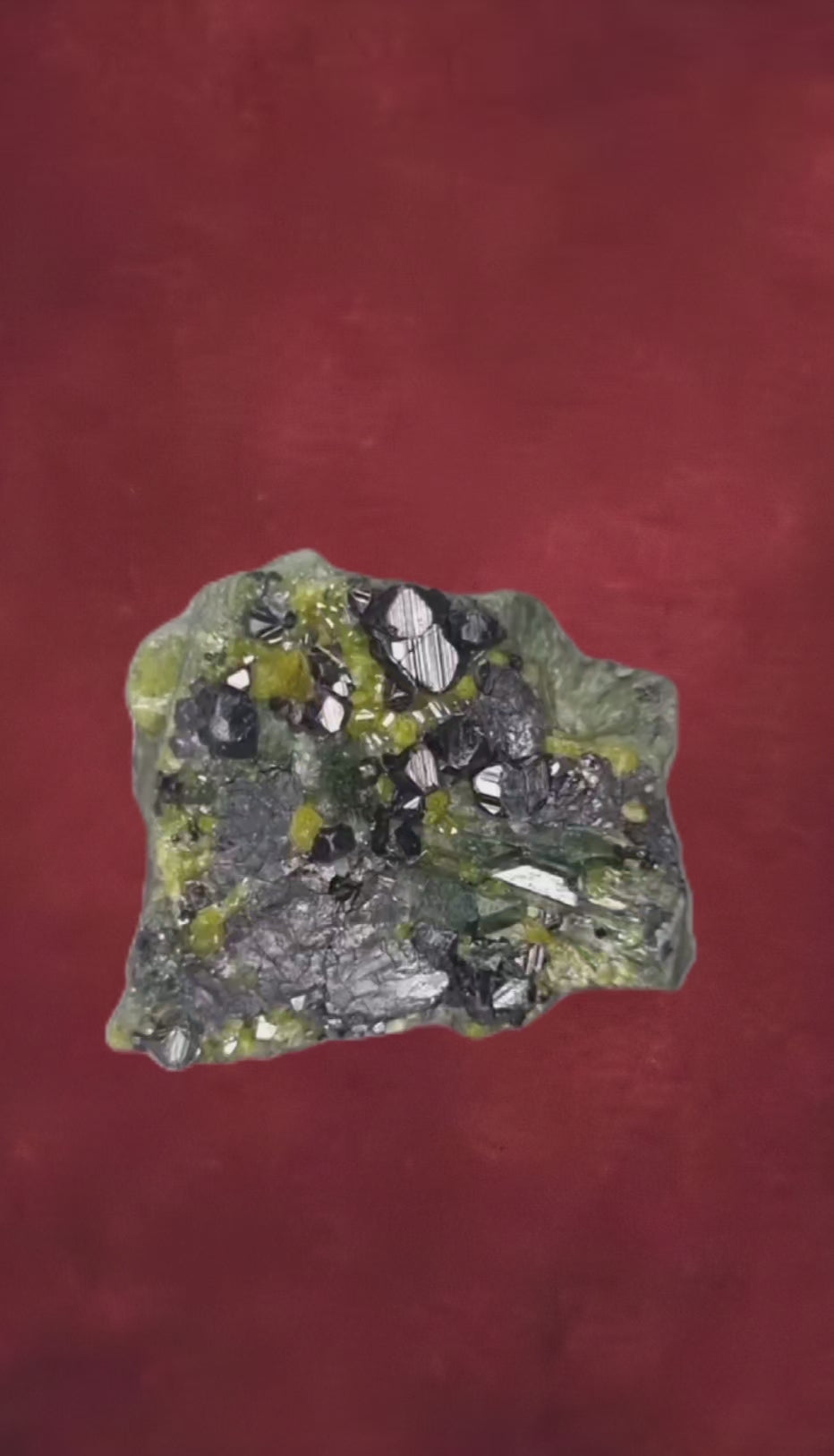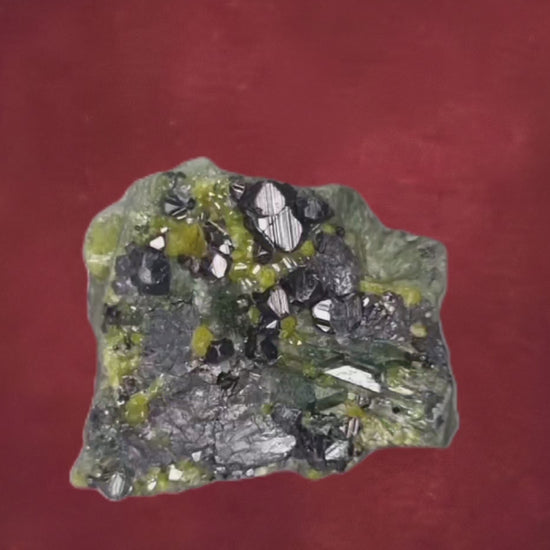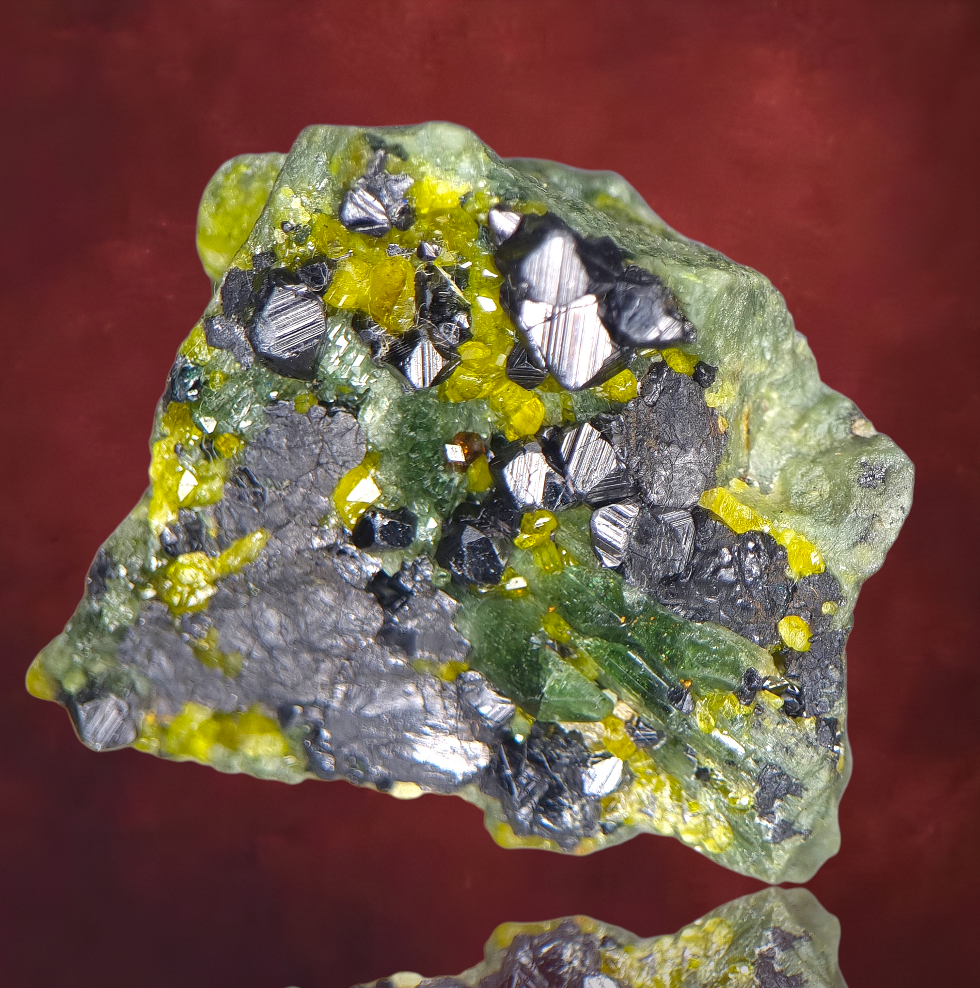 Fantastische, stark gestreifte, glänzende Magnetitkristalle heben sich von glänzenden, gelben Epidotkristallen ab, die mit länglichen bläulich-grünen, gemmy Diopsidkristallen verwachsen sind. In der Mitte eingenistet befindet sich ein einzelner, gemmy, warmbrauner Andraditkristall. Ein attraktives Sammlerstück, das mit seiner Farbenpracht besticht.